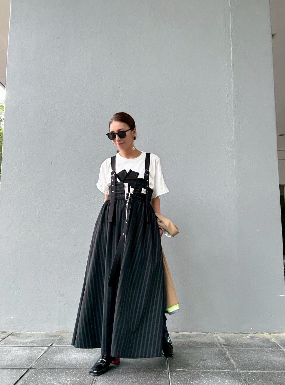 フロントジップで前後逆にして着用する事も可能となり、ショルダーを下に垂らし、ウエストベルトを絞める事でロングスカートとしてもお使い頂けます。
