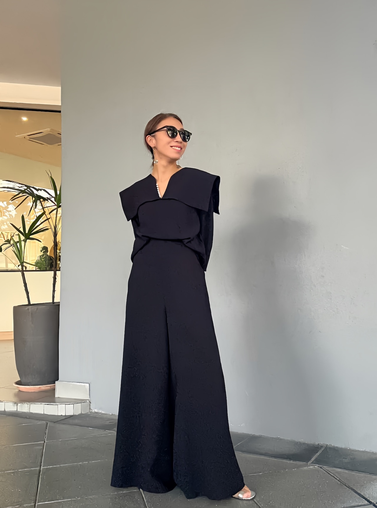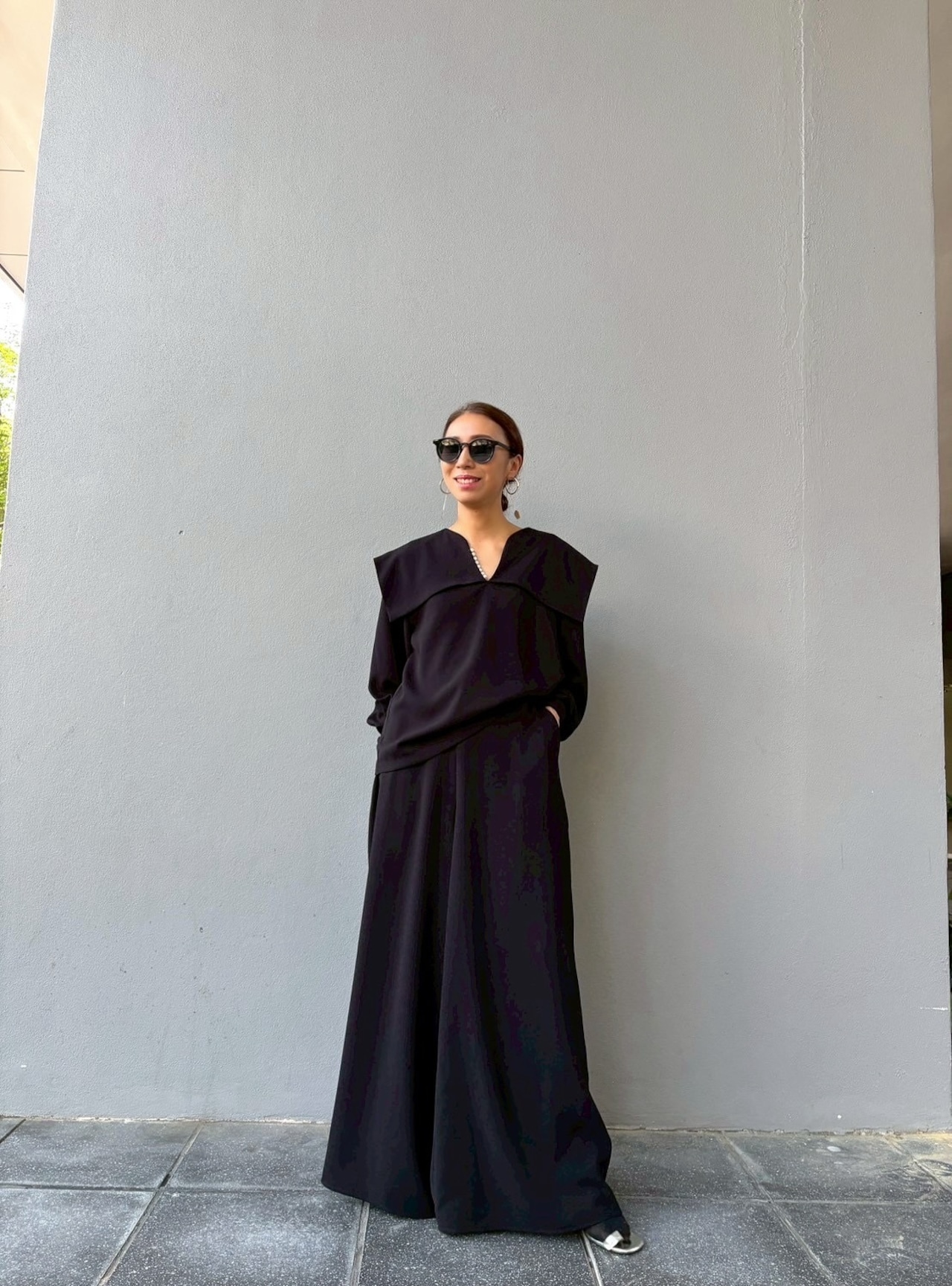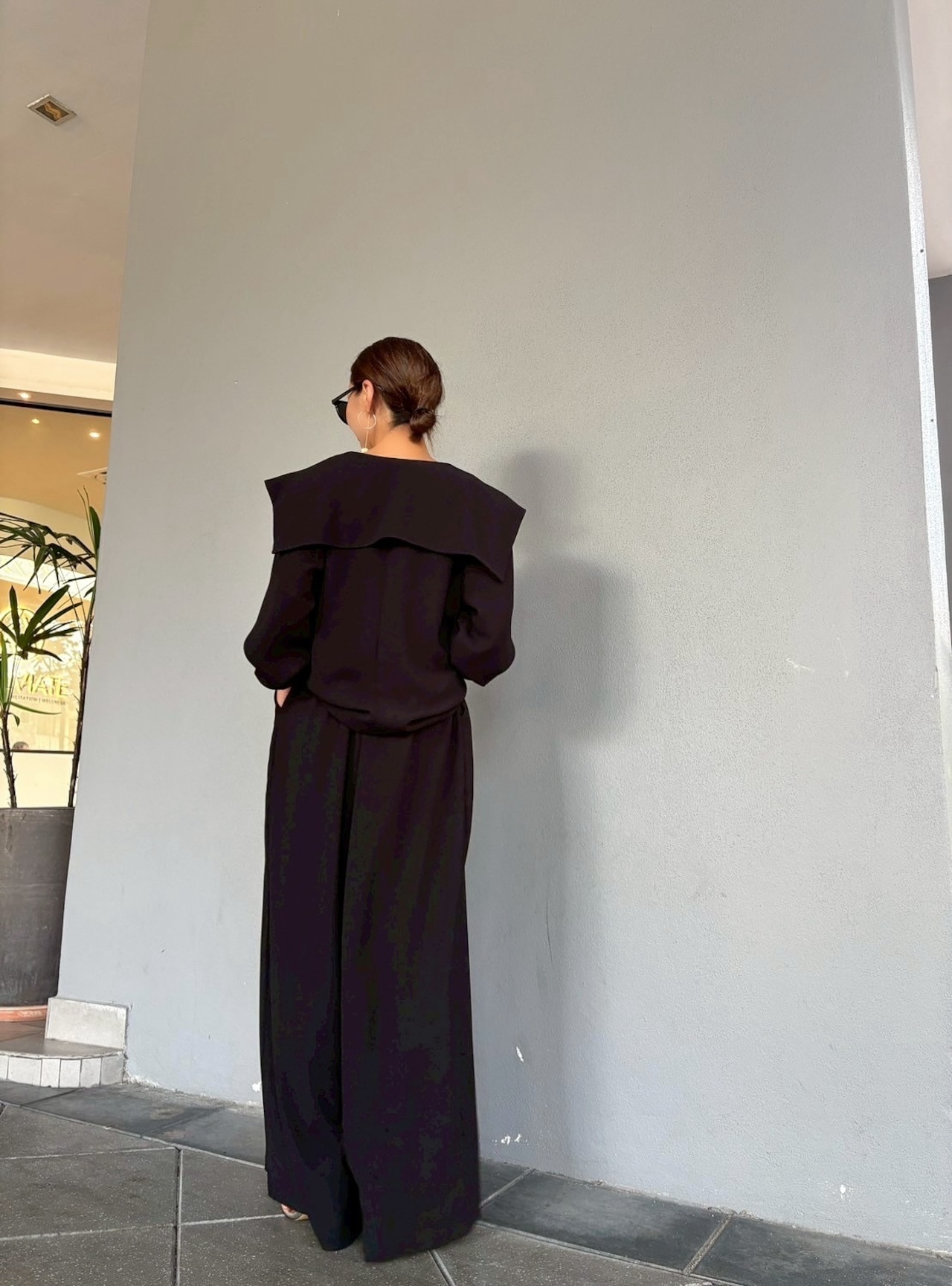 MARIAの代表作、大胆なセーラーカラーが目を引く、モードな雰囲気漂うブラウス。顔周りを華やかに演出し、小顔効果も期待できます。フロントには上品なパールボタンが縦一列に配されており、洗練されたアクセントをプラス。深めのVネックデザインがデコルテを美しく見せ、女性らしい抜け感を演出します。