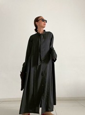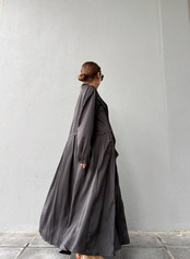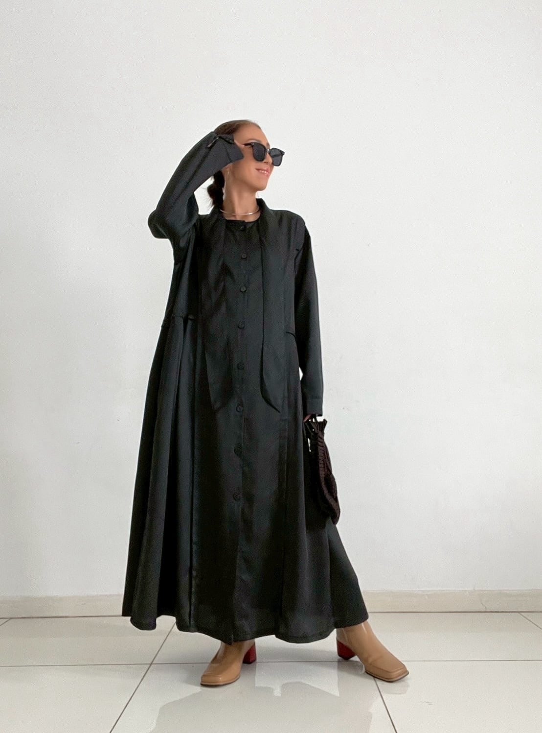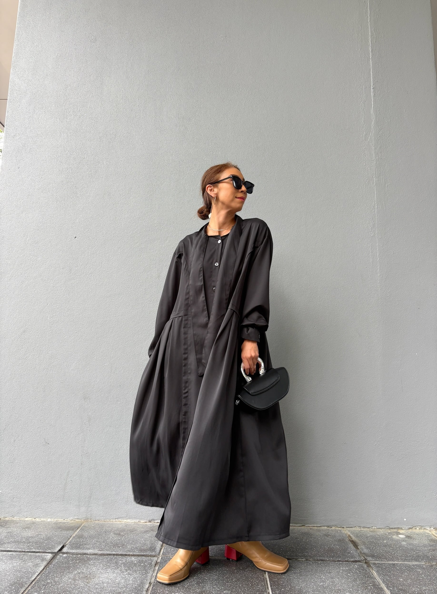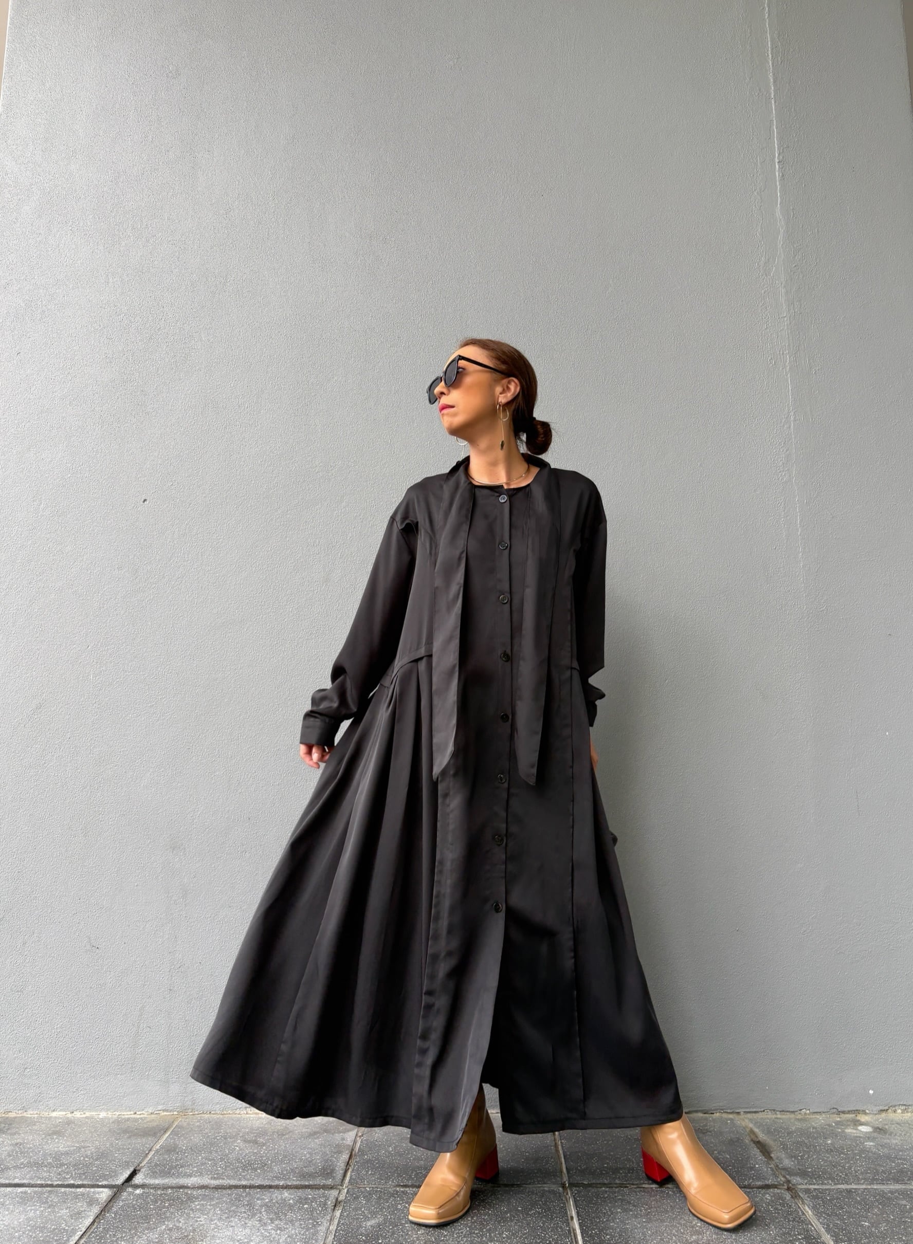 歩くたびに優雅に揺れる、ボウタイロングドレス。首元のボウタイが顔周りを華やかに演出し、洗練された大人のスタイルを完成させます。