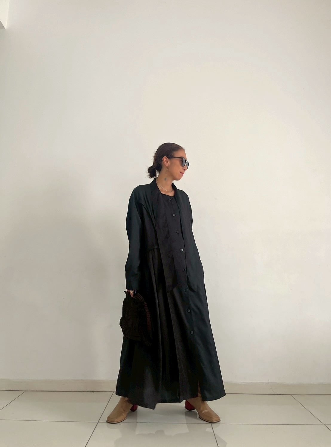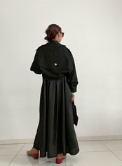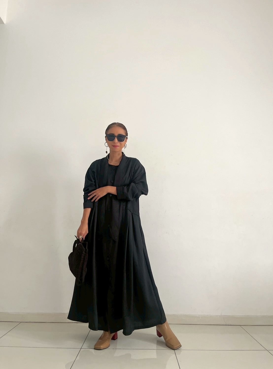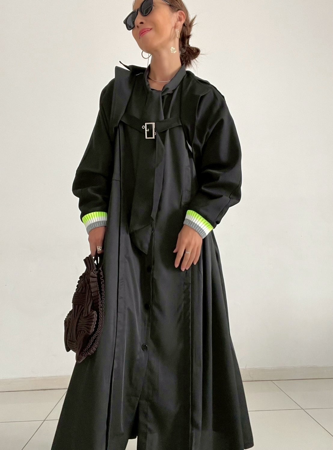 ・全体をモノトーンやダークカラーでまとめたモードスタイルもおすすめ。革靴、厚底ブーツやプラットフォームシューズなどゴツめの靴とも相性が良く、レザー素材のバッグや太めのバングルなどエッジの効いた小物を合わせると都会的なモードスタイルに。