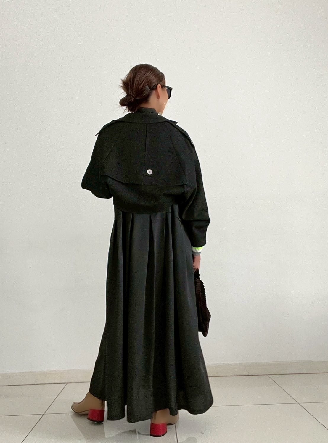 滑らかで肌触りが良く、ツヤのないマットな質感で表面がツルンとしており、肌にまとわりつかず快適に過ごせます。風を取り込みやすい軽やかな生地感なので、歩くたびにフワッと優雅に揺れ動き広がりすぎない上品なフレアシルエットを作り出します。