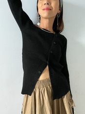 伸縮性のある上品なリブ素材は体に心地よくフィットし、女性らしい華奢見せを演出。フロントは斜めのラインでボタンが配されており、下部を開ければアシンメトリーなヘムラインが生まれ、一味違う着こなしに。