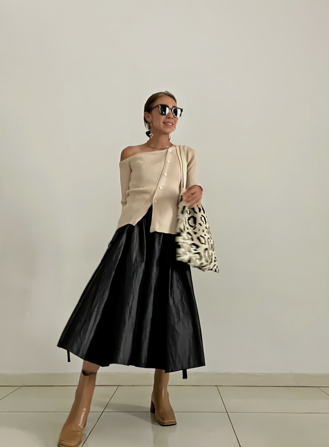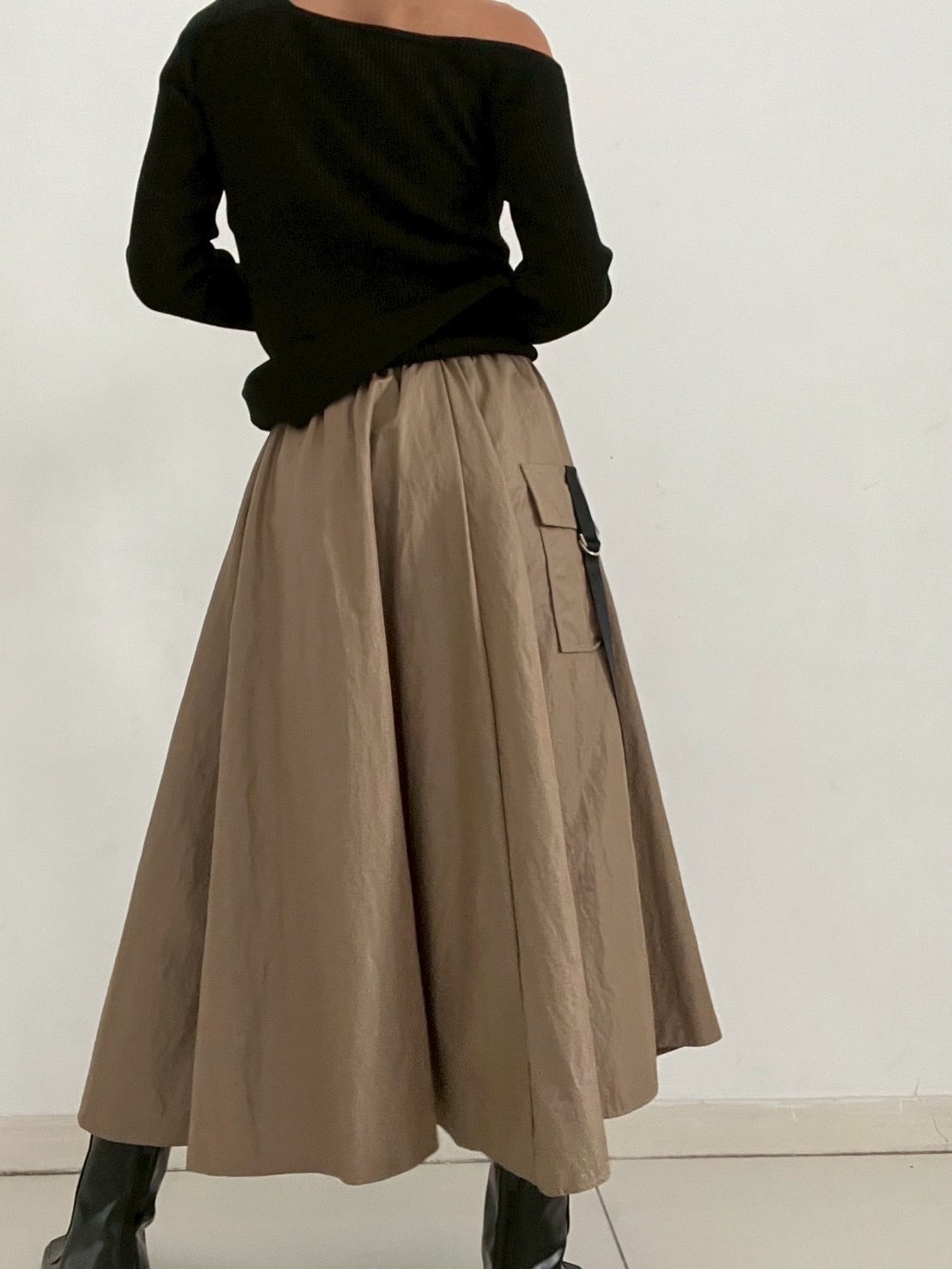 シャカシャカとしたドライなタッチと、上品な微光沢を併せ持つ高密度タフタ素材を使用。軽やかながらもハリ感があり、フレアシルエットのボリューム感をキープし、スポーティな素材感でありながら、エレガントなシルエットでモードな雰囲気を演出します。
