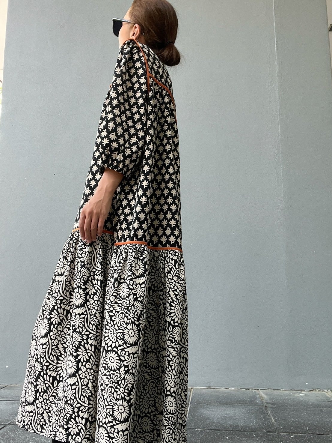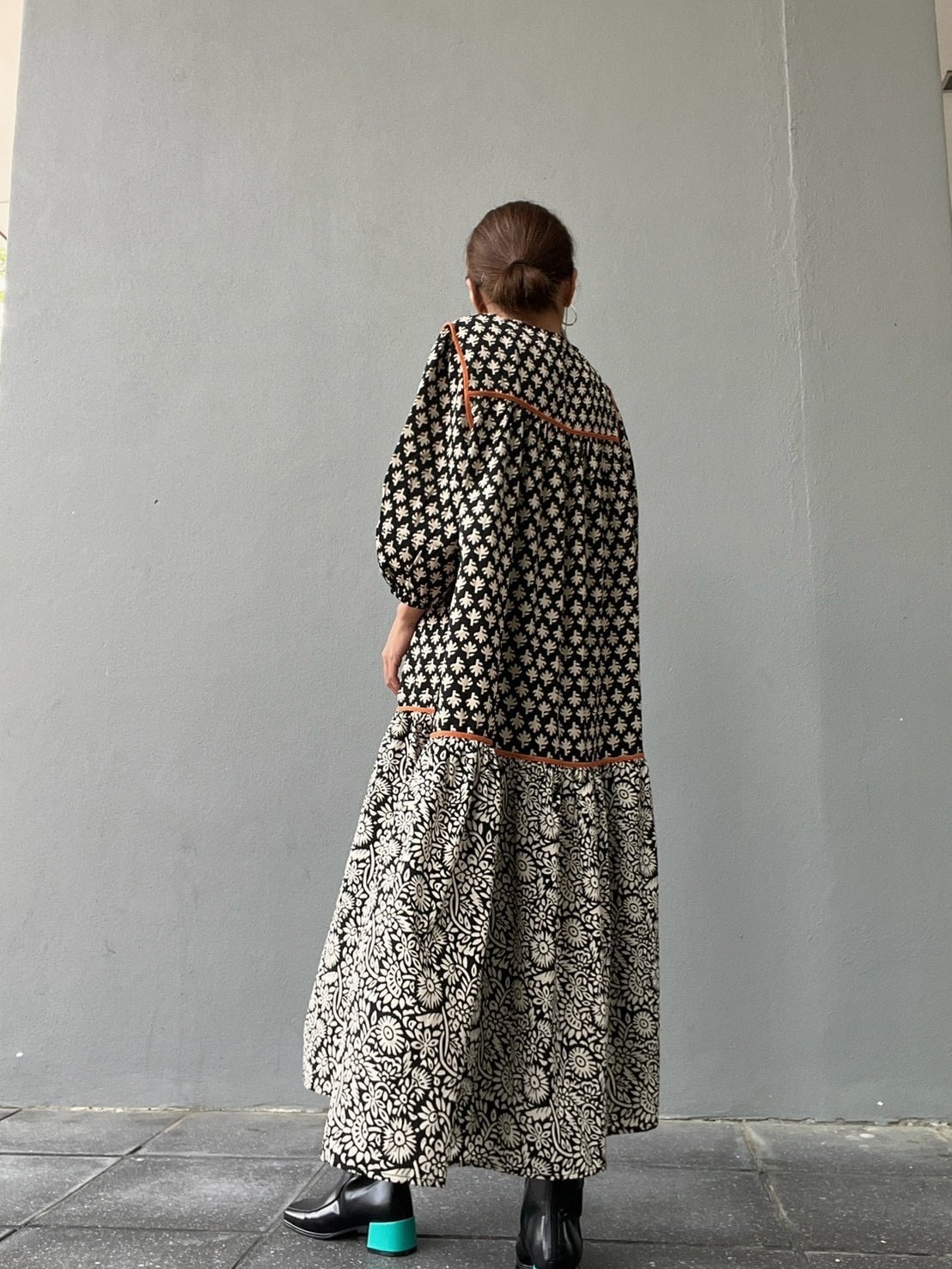 肩から胸元にかけては細かな柄、スカート部分は大きな花柄と、2種類のテキスタイルが目を引くデザインです。ウエストの切り替え部分にあしらわれたオレンジ色のパイピングが全体のアクセントに。