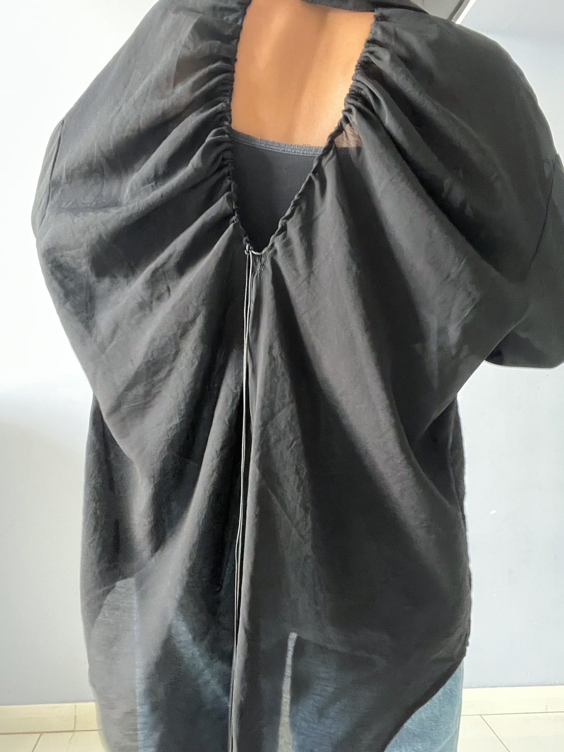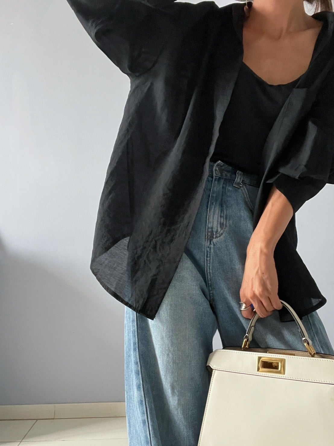 軽やかなポリエステルシアー素材は、ほのかな透け感で黒でも重くならず、さらりとした肌触りで快適にご着用いただけます。ゆったりとしたオーバーサイズシルエットで、体型をさりげなくカバーしながらリラックス感のある着こなしに。