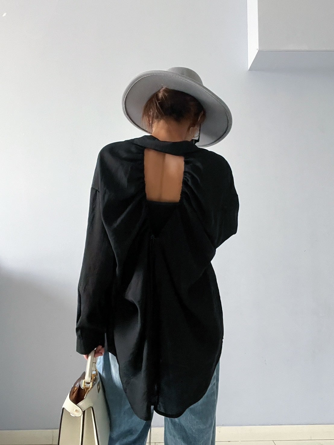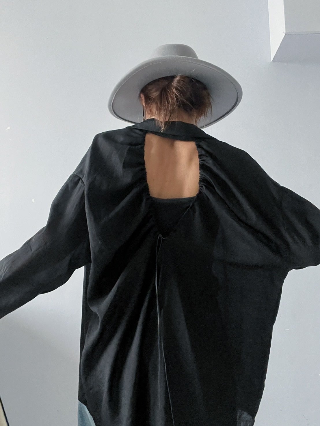 大胆に開いたバックスタイルに、ドローストリングで寄せたギャザーデザインが生み出す美しいドレープが印象的。動くたびにしなやかに揺れ、女性らしいエレガントなシルエットを描きます。インナーにキャミソールやタンクトップを合わせて、ヘルシーな肌見せスタイルもおすすめです。