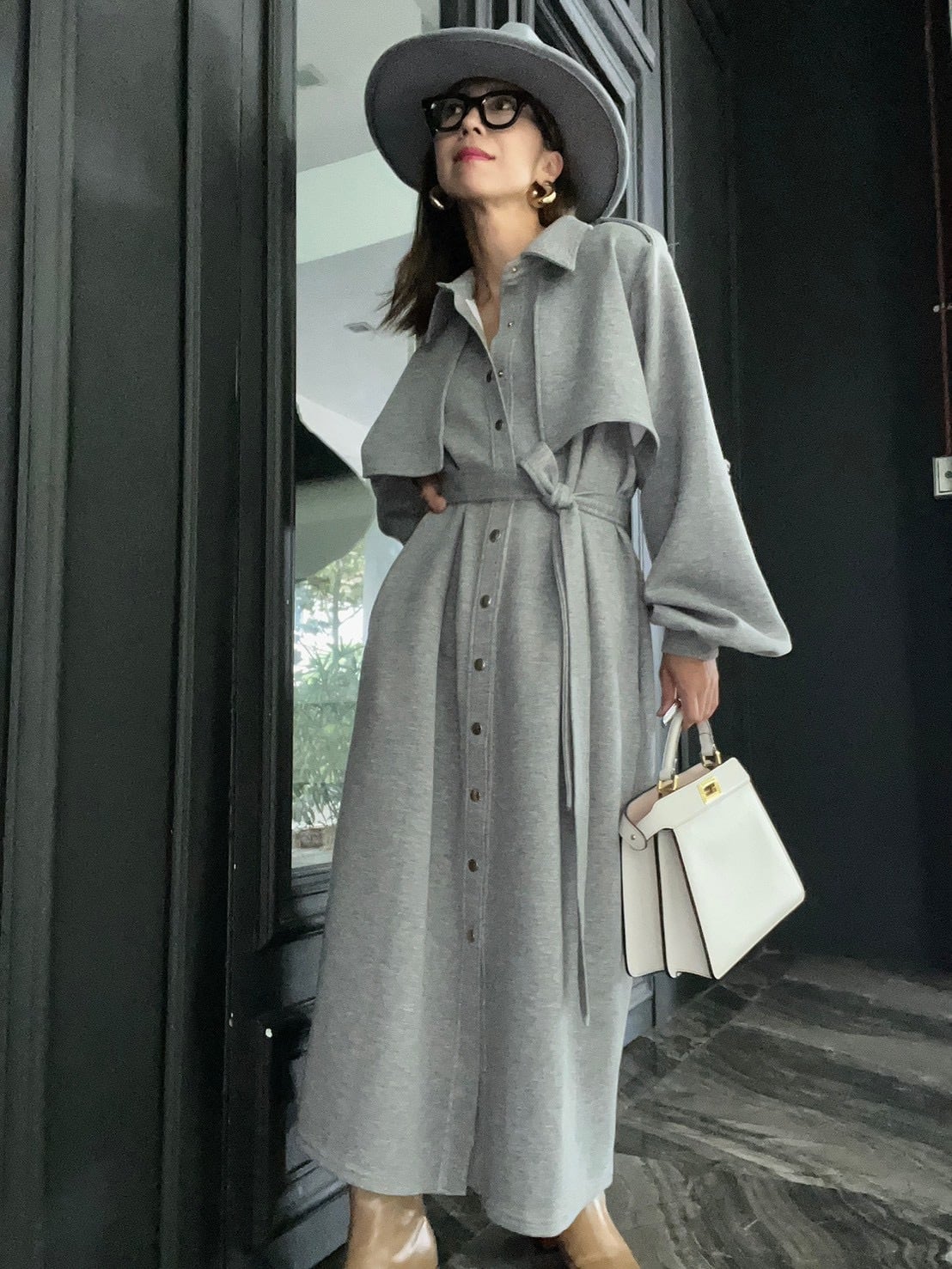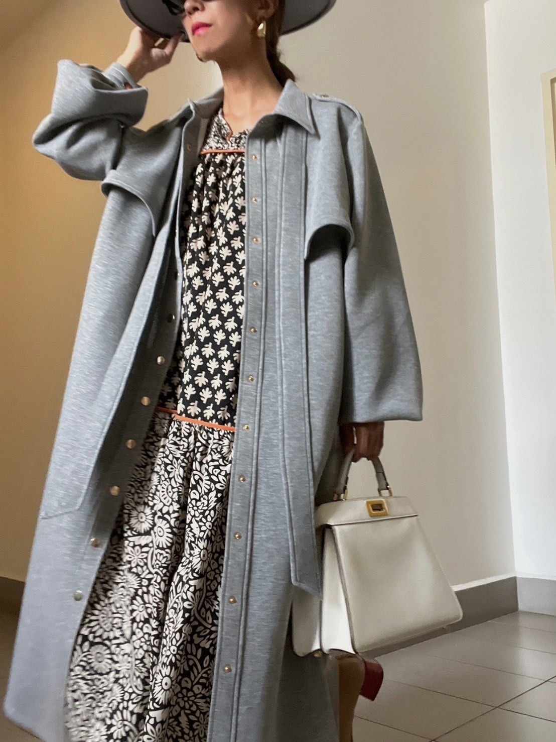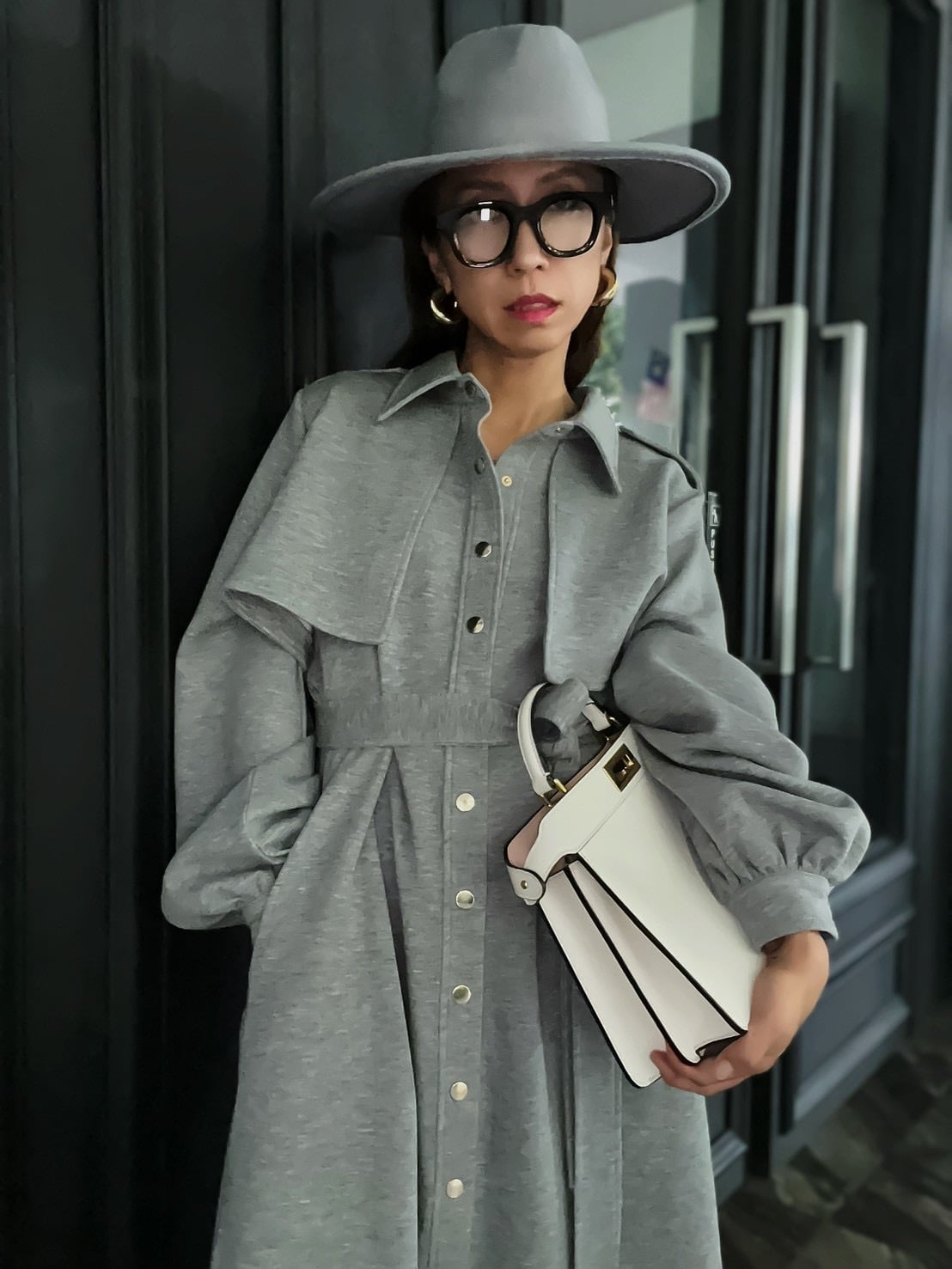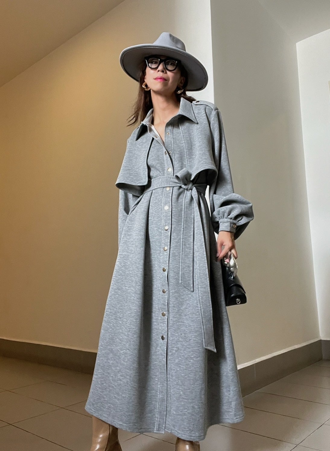 フロントのゴールドスナップボタンをすべて留めて、付属のベルトリボンでウエストマークすれば、上品なロングワンピースのようなスタイルに。また、前を開けてさらっと羽織れば、ケープデザインが際立つモードなライトアウターとしても活躍します。