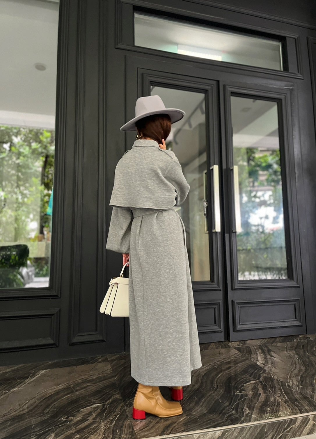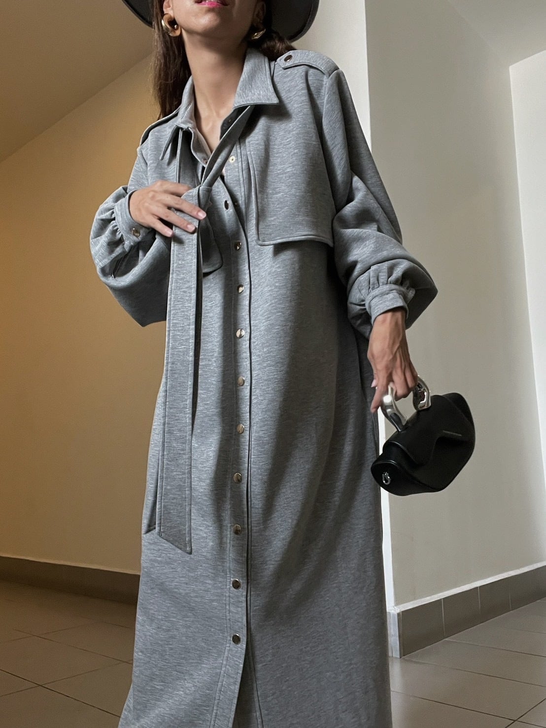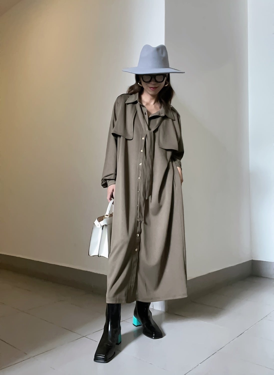 フロントのゴールドスナップボタンをすべて留めて、付属のベルトリボンでウエストマークすれば、上品なロングワンピースのようなスタイルに。また、前を開けてさらっと羽織れば、ケープデザインが際立つモードなライトアウターとしても活躍します。