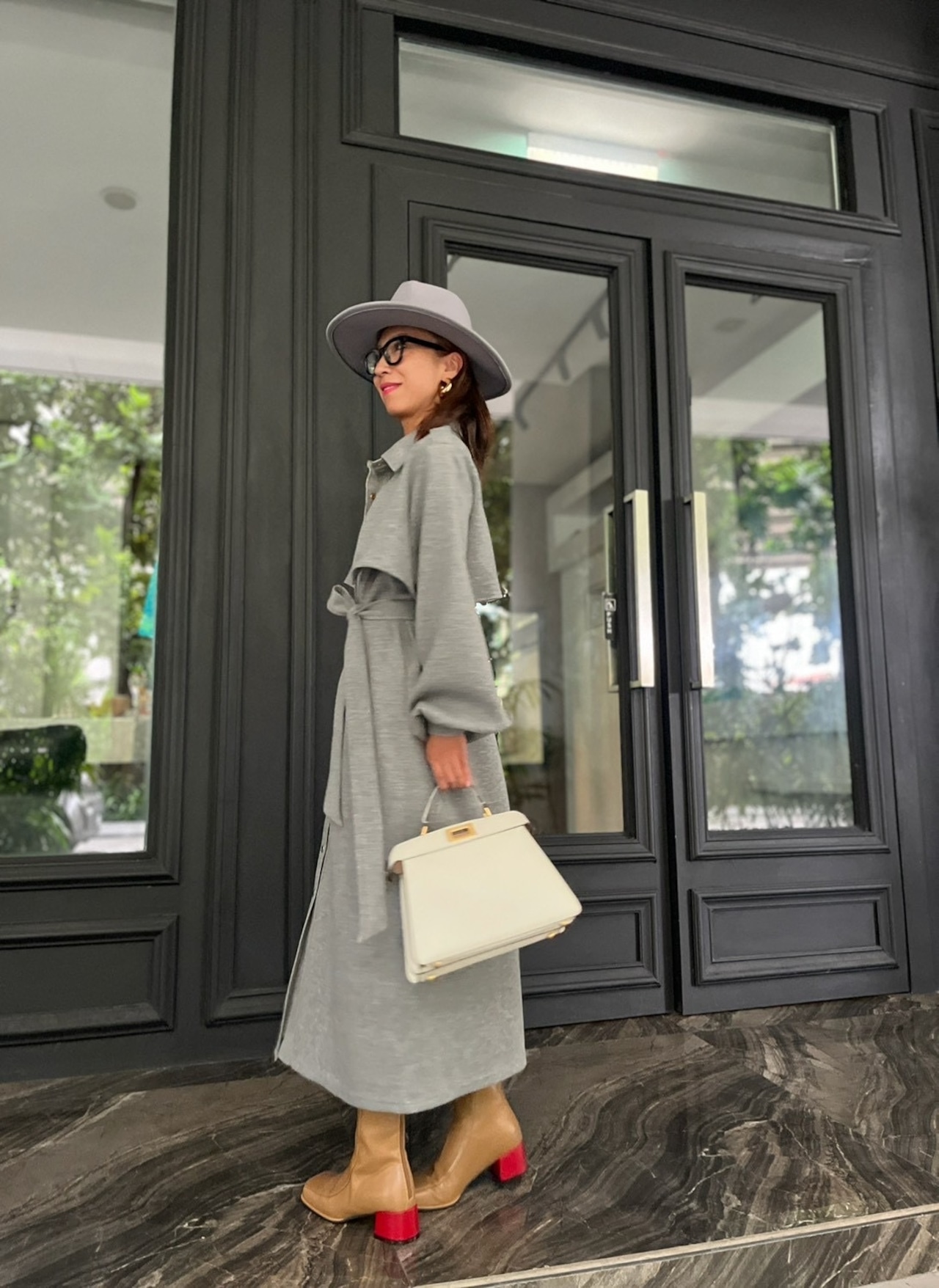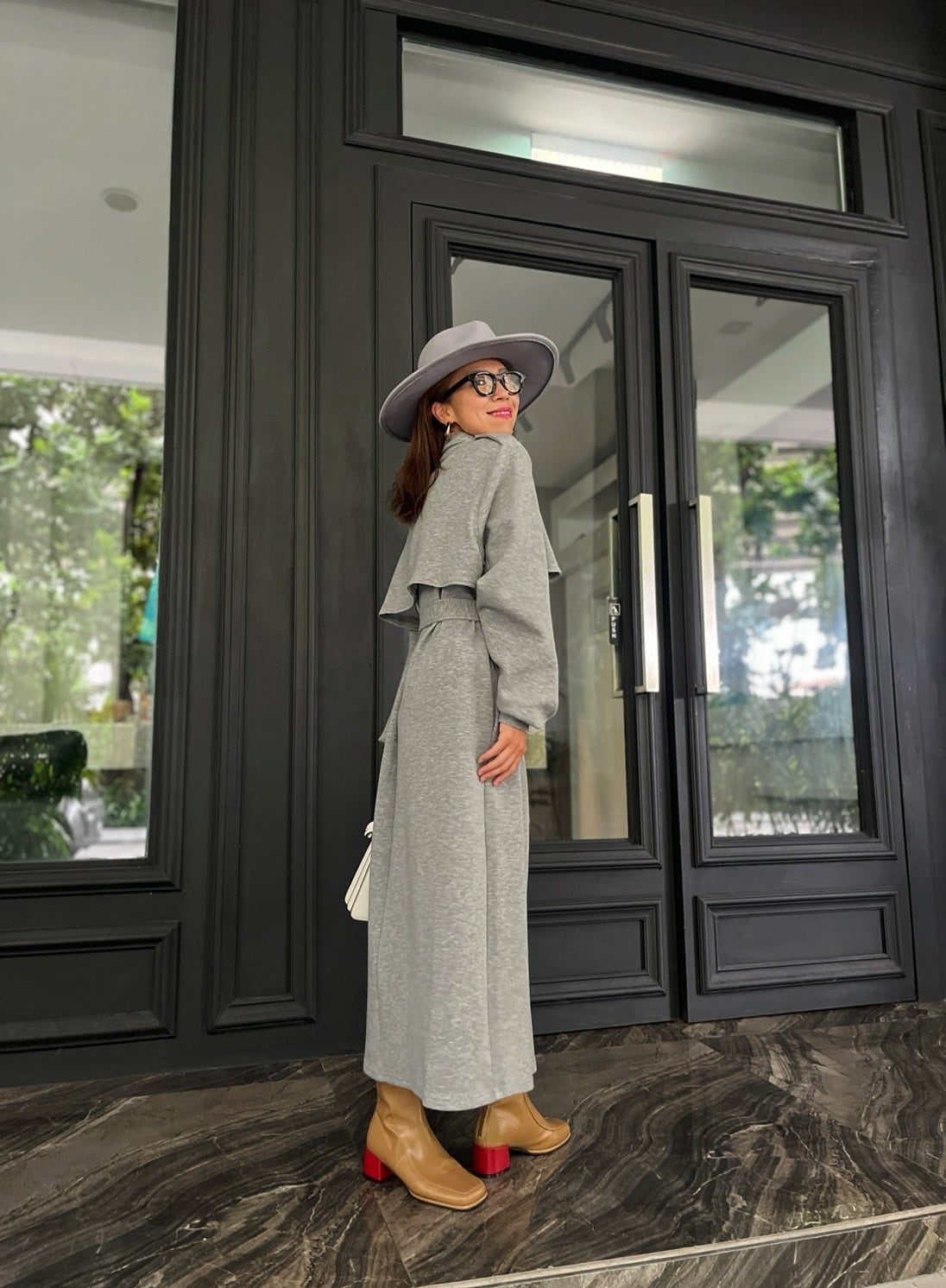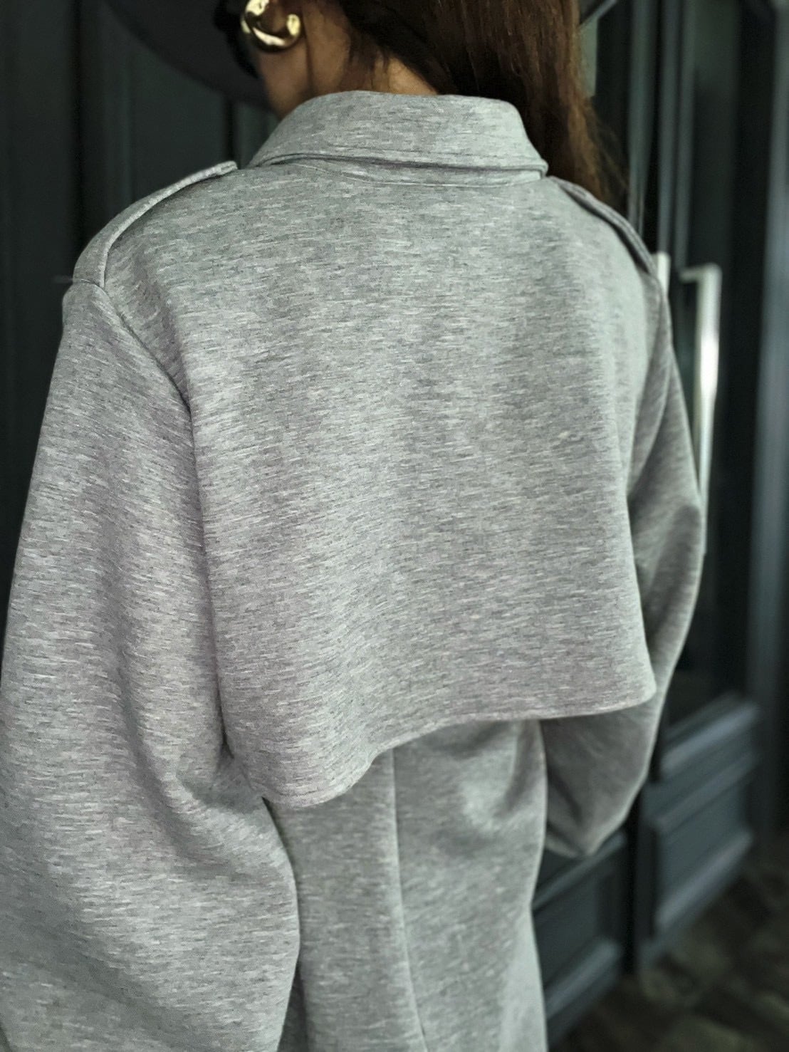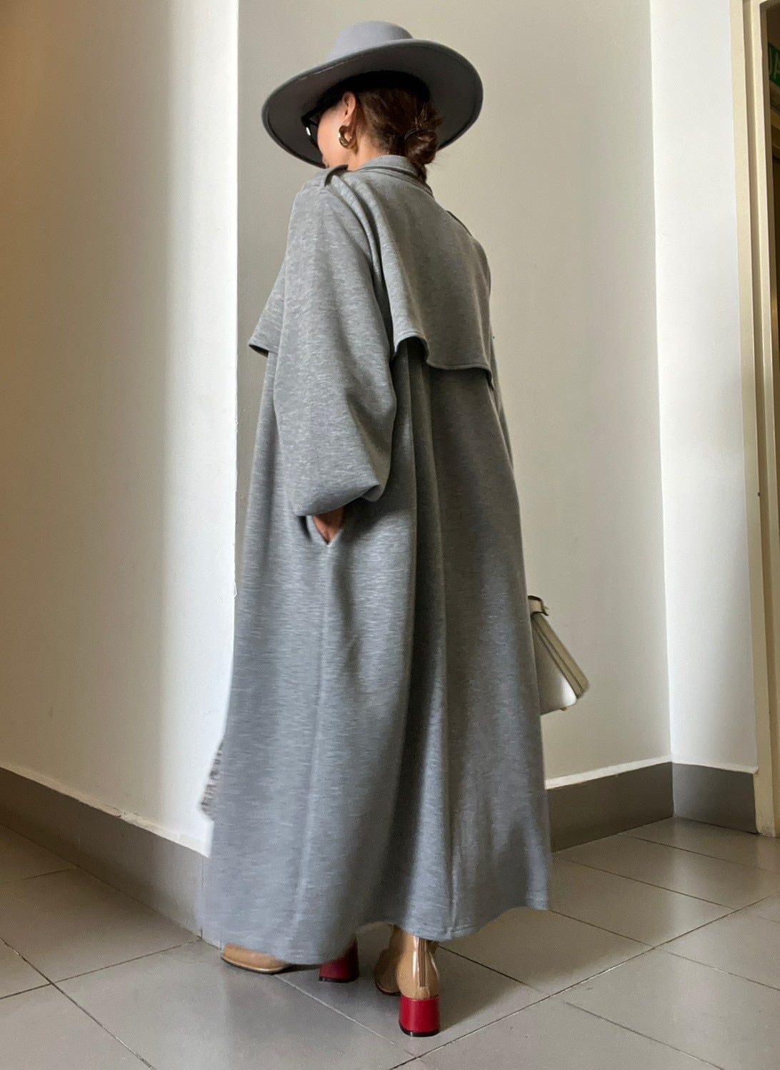 フロントのゴールドスナップボタンをすべて留めて、付属のベルトリボンでウエストマークすれば、上品なロングワンピースのようなスタイルに。また、前を開けてさらっと羽織れば、ケープデザインが際立つモードなライトアウターとしても活躍します。