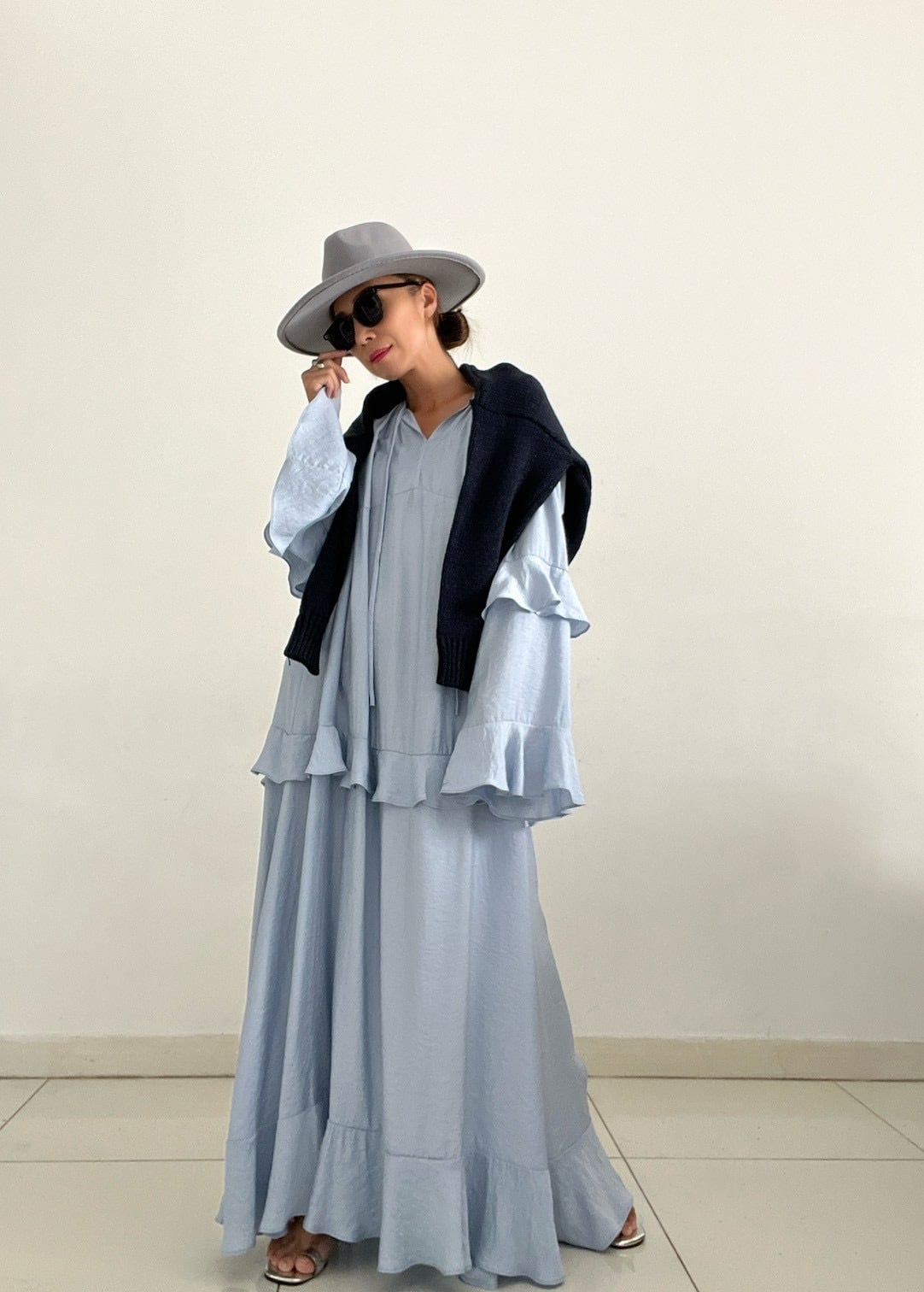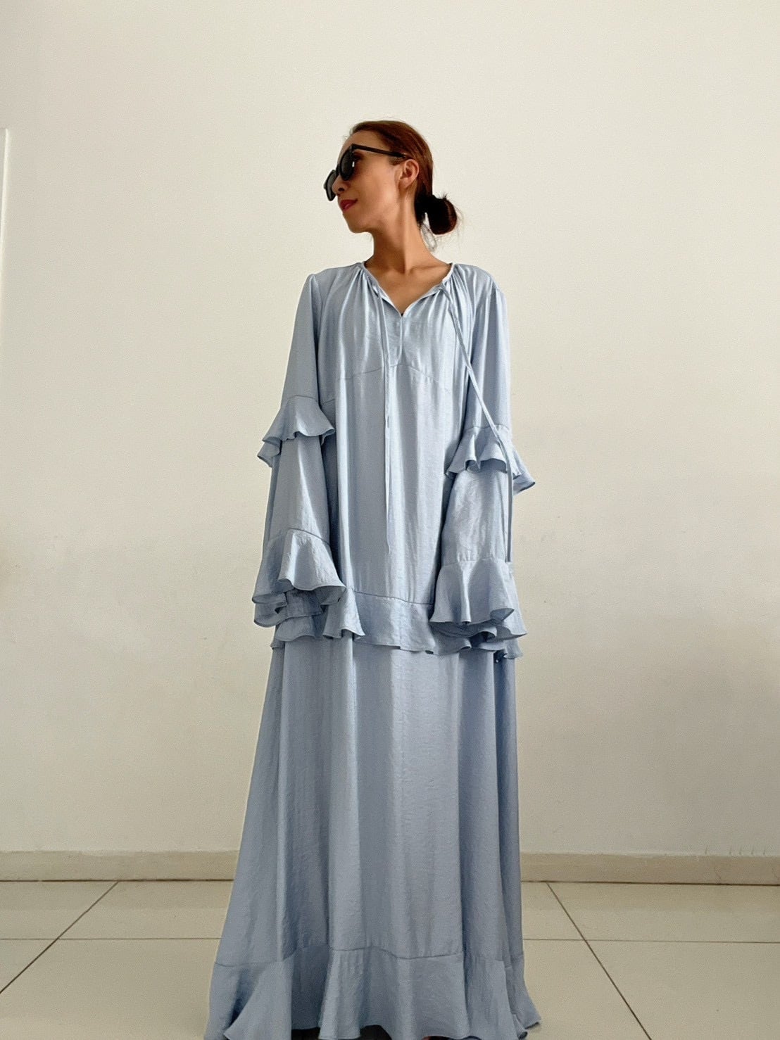 腕の動きに合わせてしなやかに揺れる、ボリュームたっぷりのティアードフリルスリーブが印象的。
