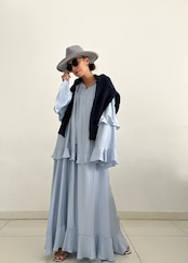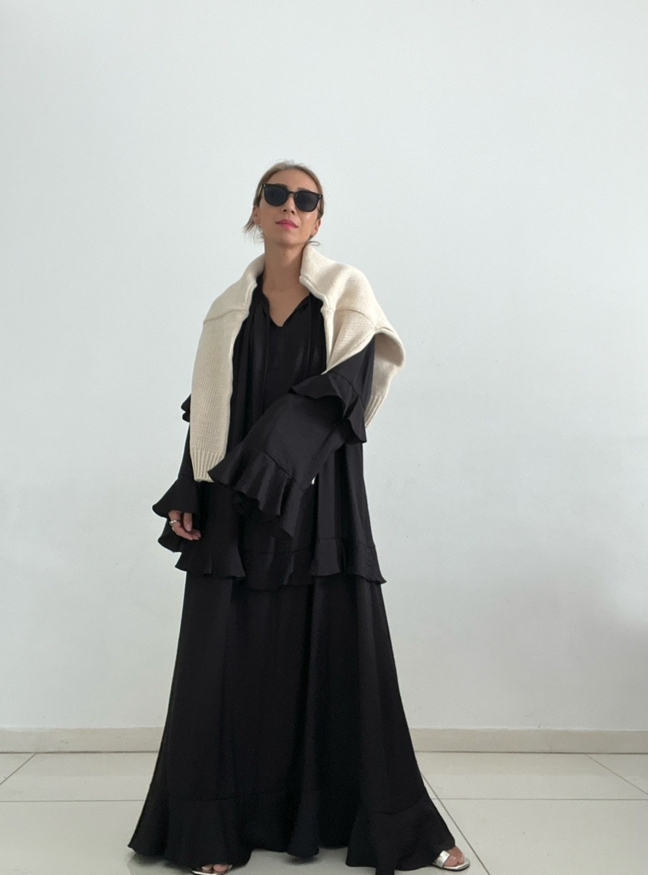 ・ざっくりとしたオーバーサイズニットを重ねるスタイルはニットの柔らかな質感と、フリルの軽やかな素材感のコントラストが際立ち、洗練された冬の装いに。