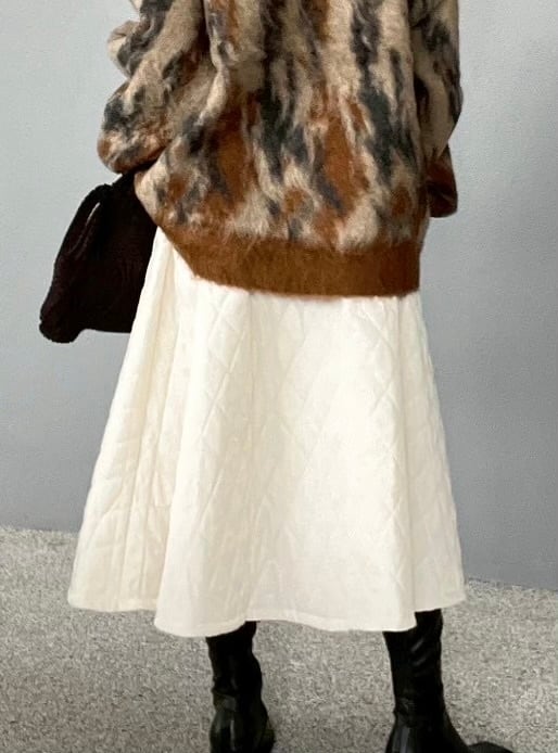 シーズンライクな中綿のキルティング素材であたたかさと、立体的なフレアシルエットでモードなデザイン性も兼ね備えた映える大人のキルティングスカートです。