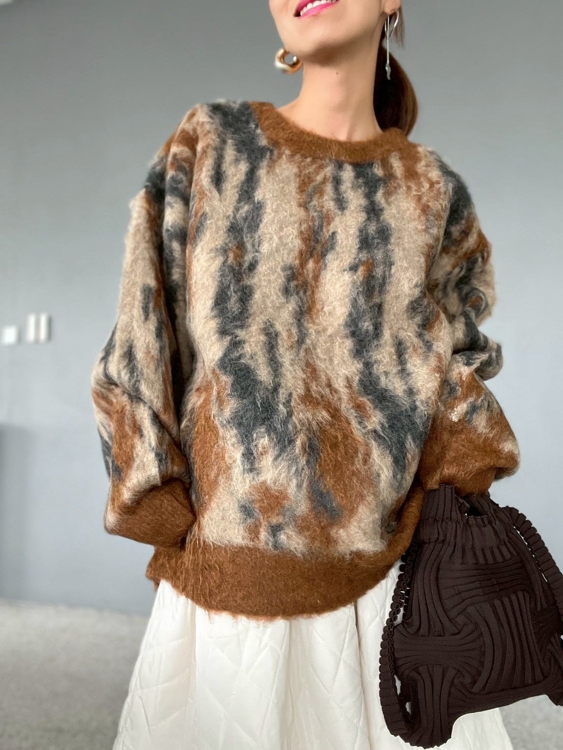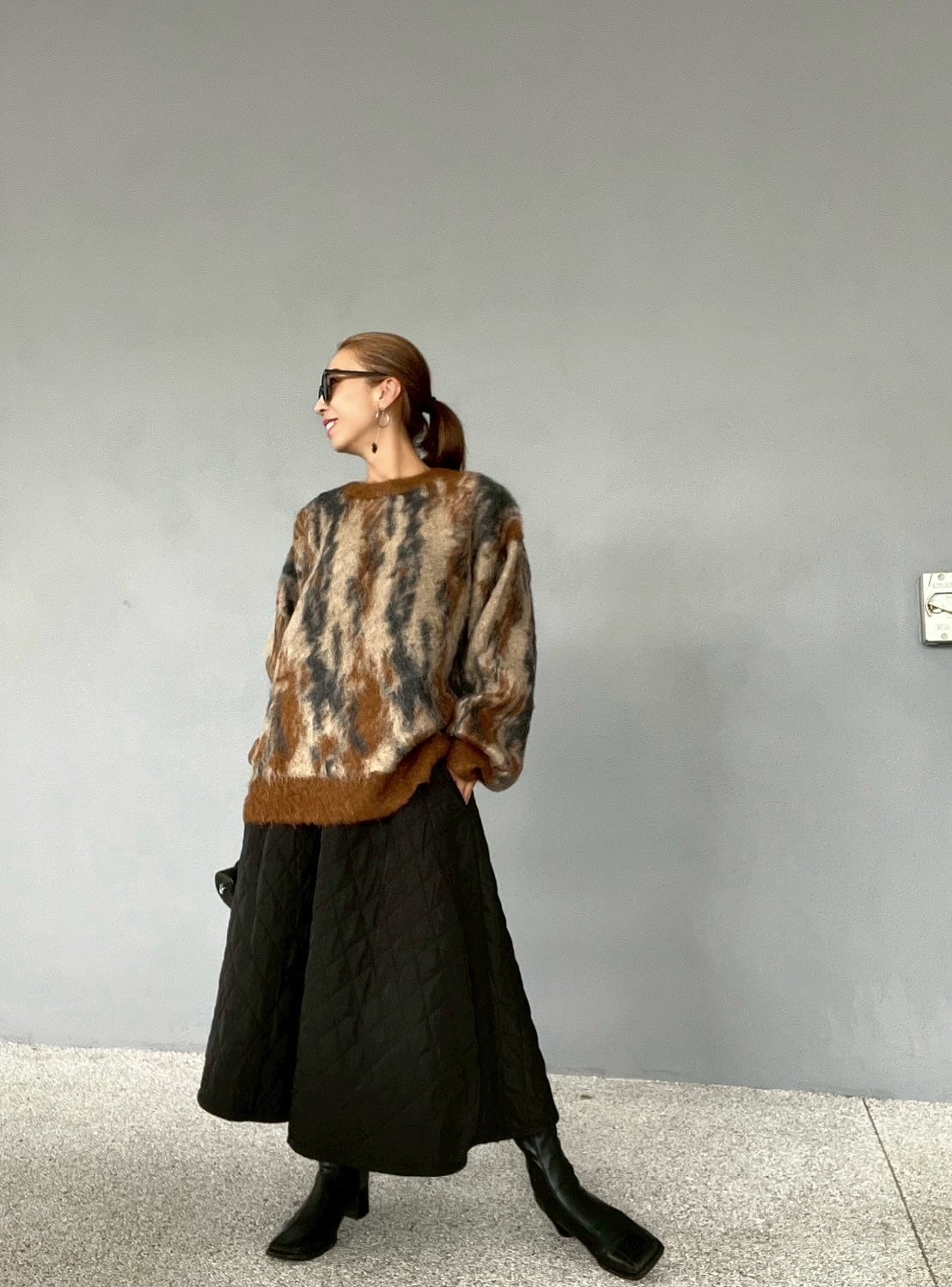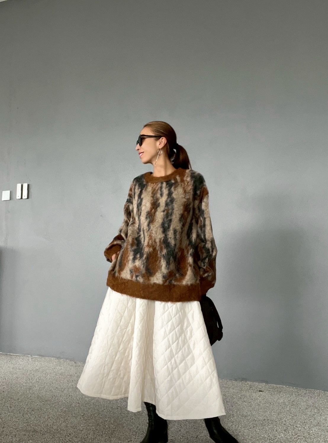AWオリジナルのこだわりニットは、大胆なアソート柄がモードな気分を格上げしてくれ、オーバーサイズでお尻が隠れる丈となっております。