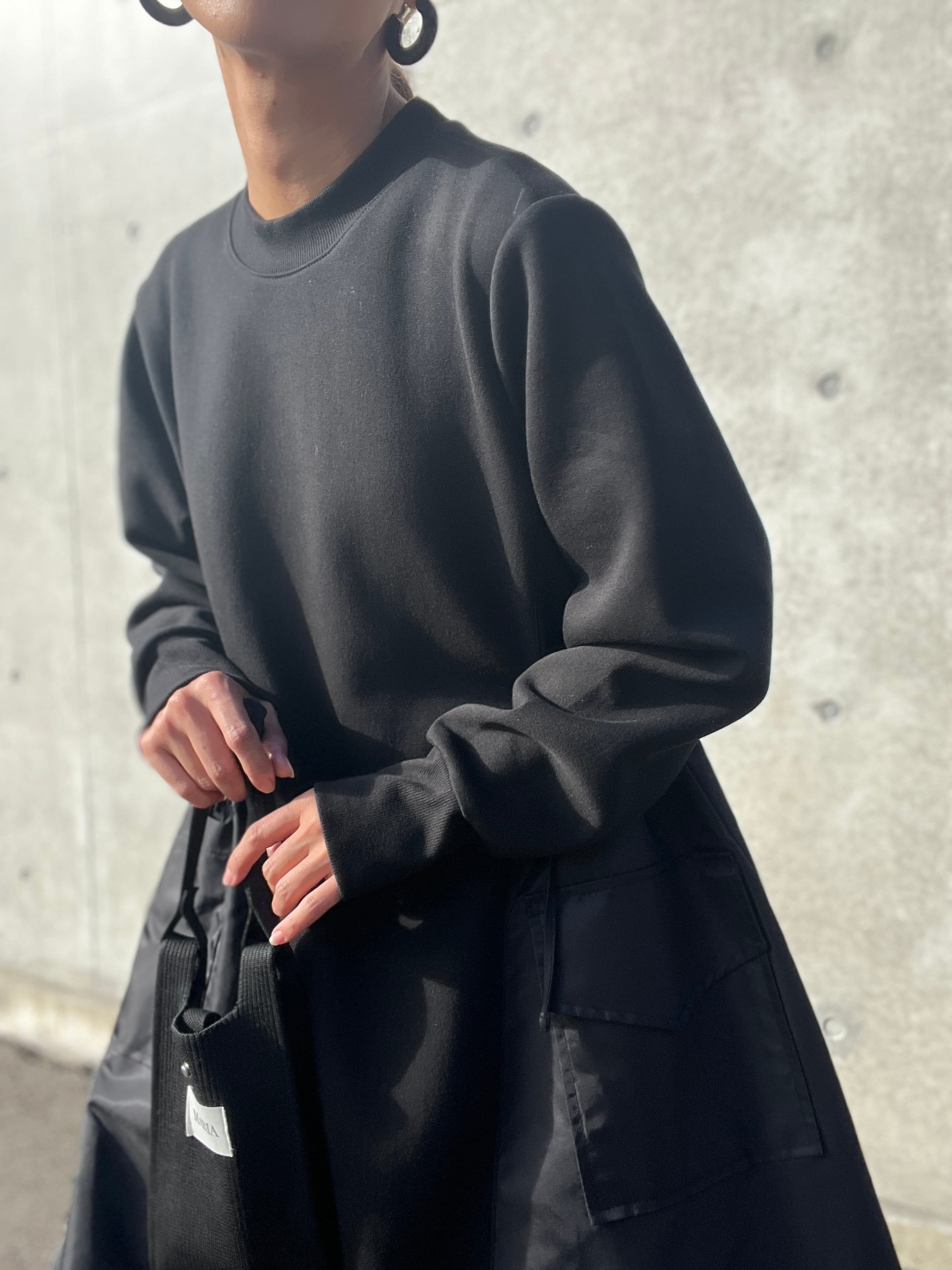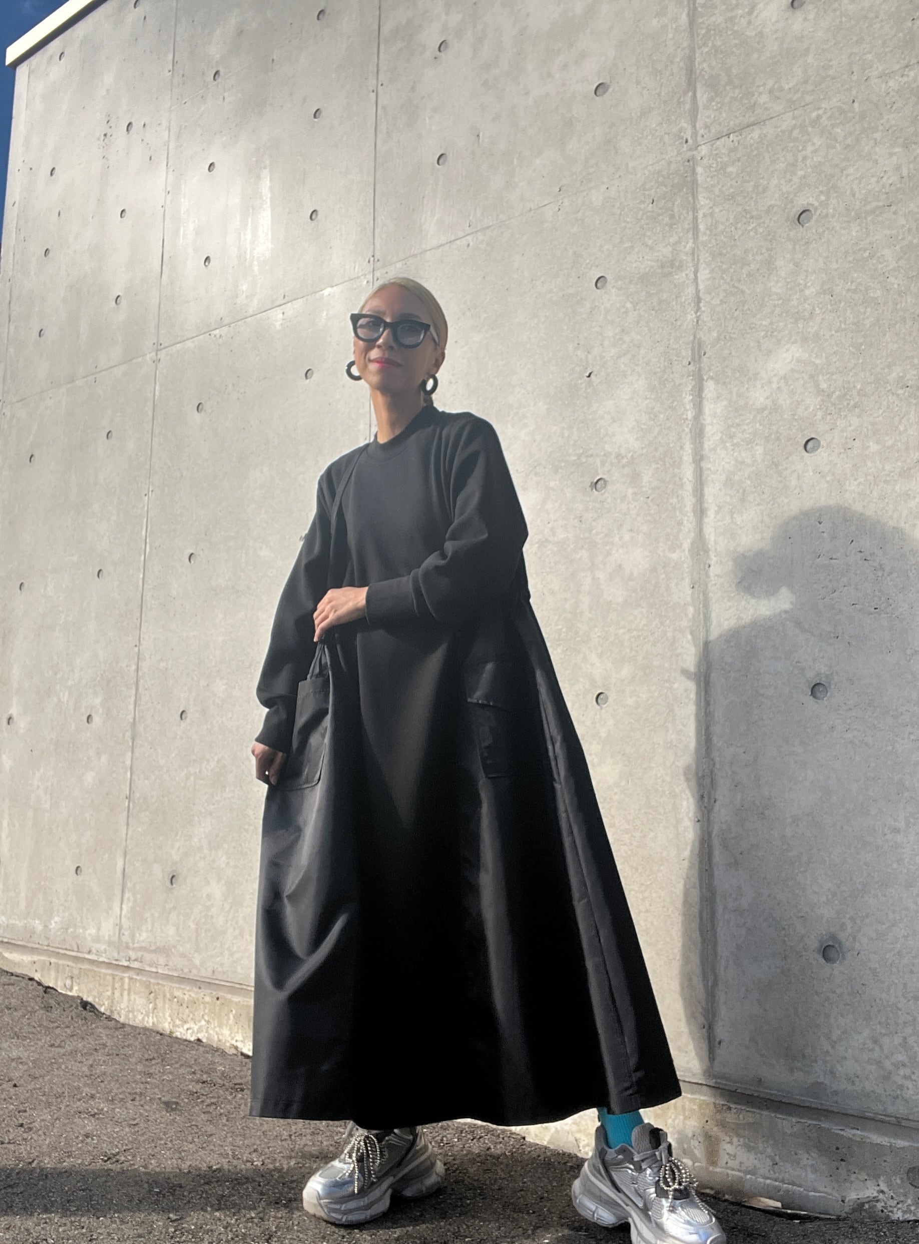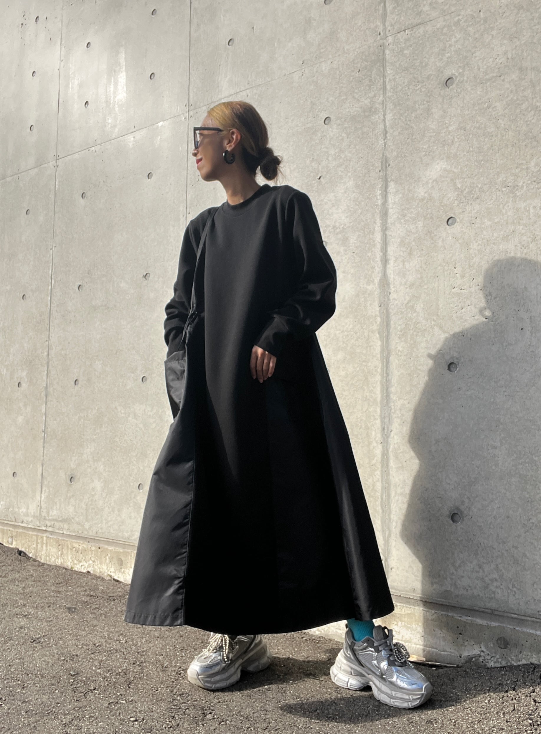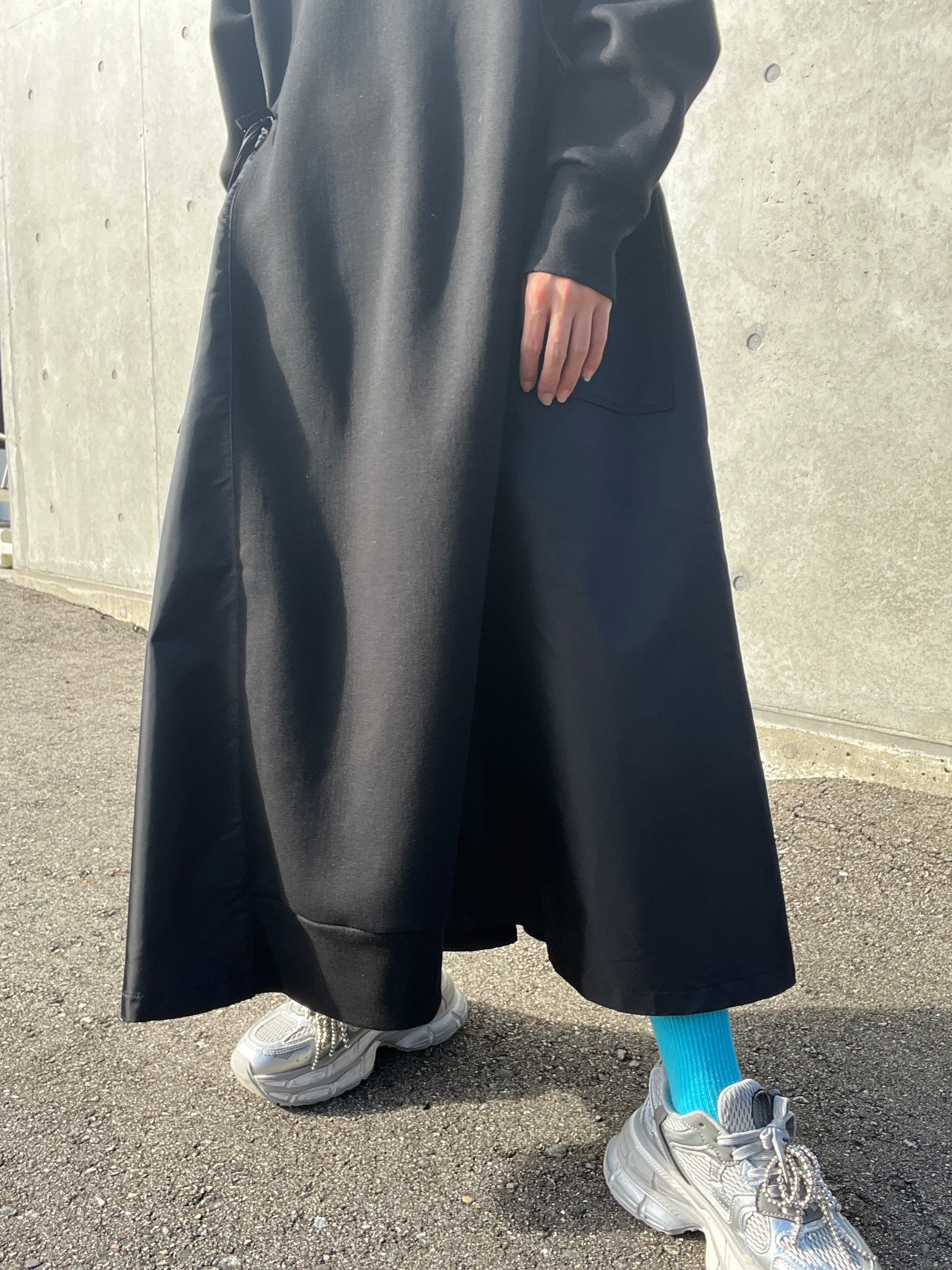 サイドパネルのナイロンパネルにスウェットのドッキングワンピースはお家コーデからお出かけまで幅広くご着用頂ける1枚でございます。