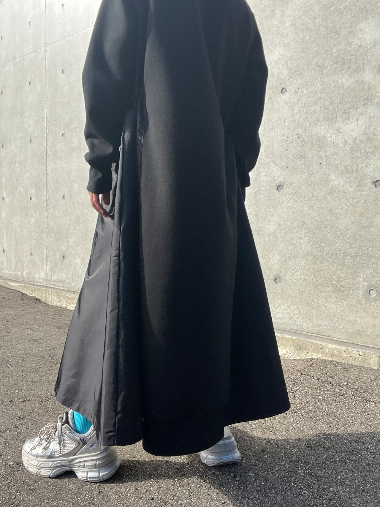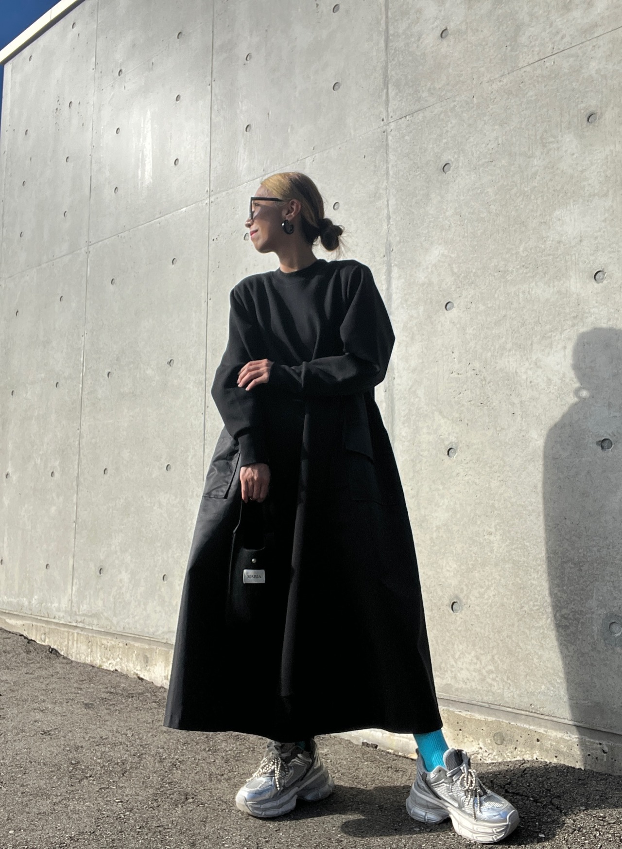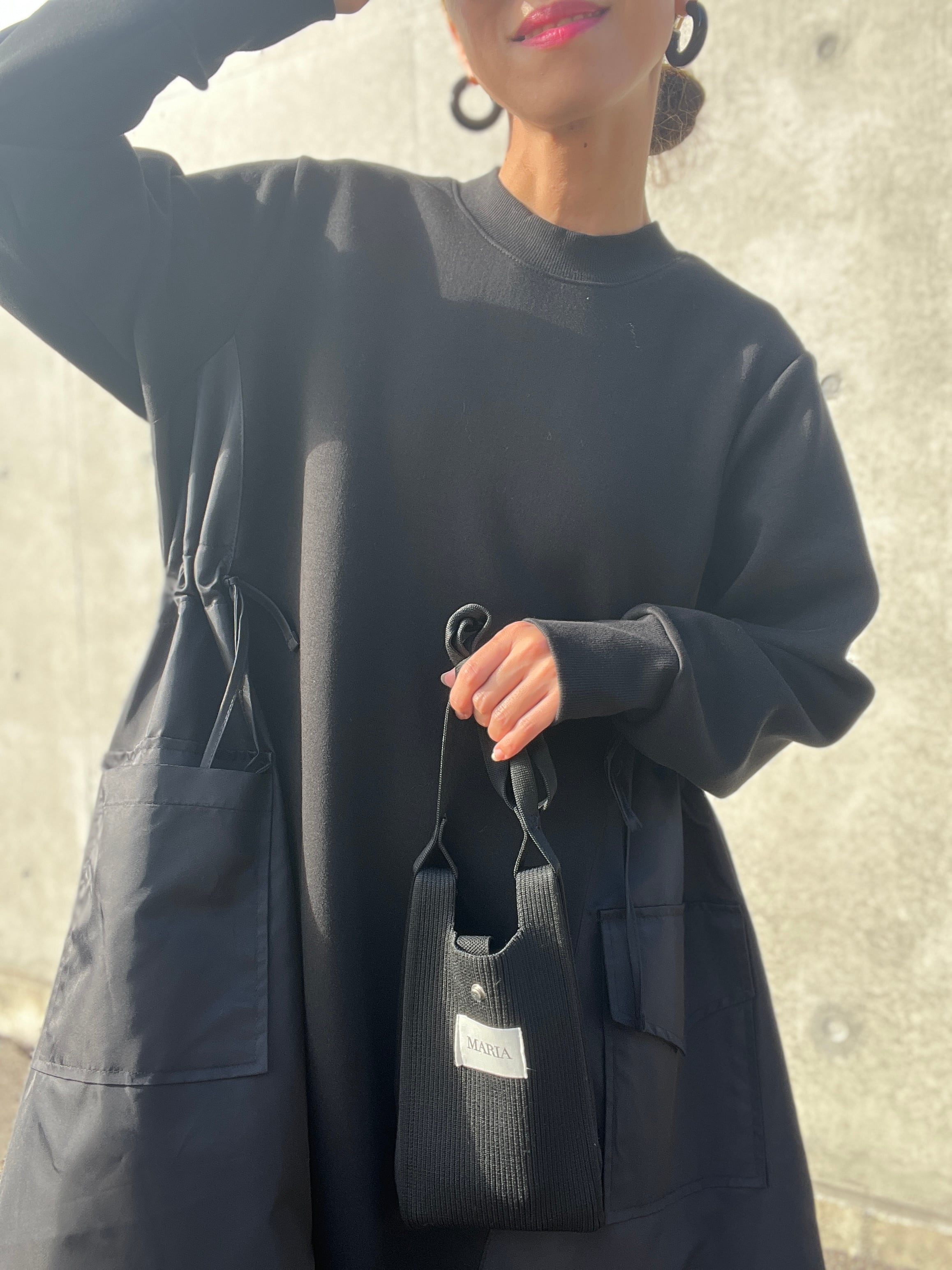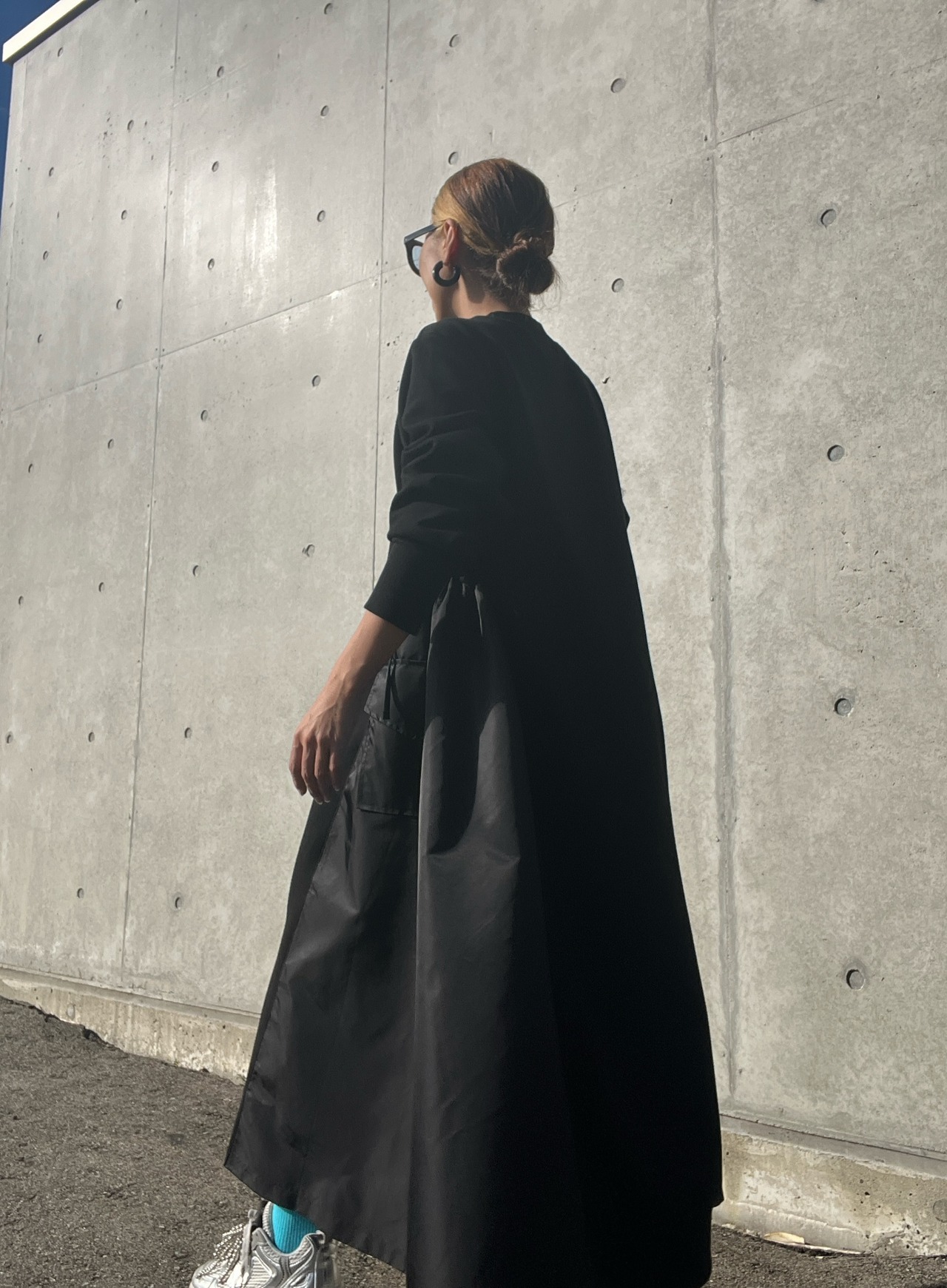 サイドパネルのナイロンパネルにスウェットのドッキングワンピースはお家コーデからお出かけまで幅広くご着用頂ける1枚でございます。
