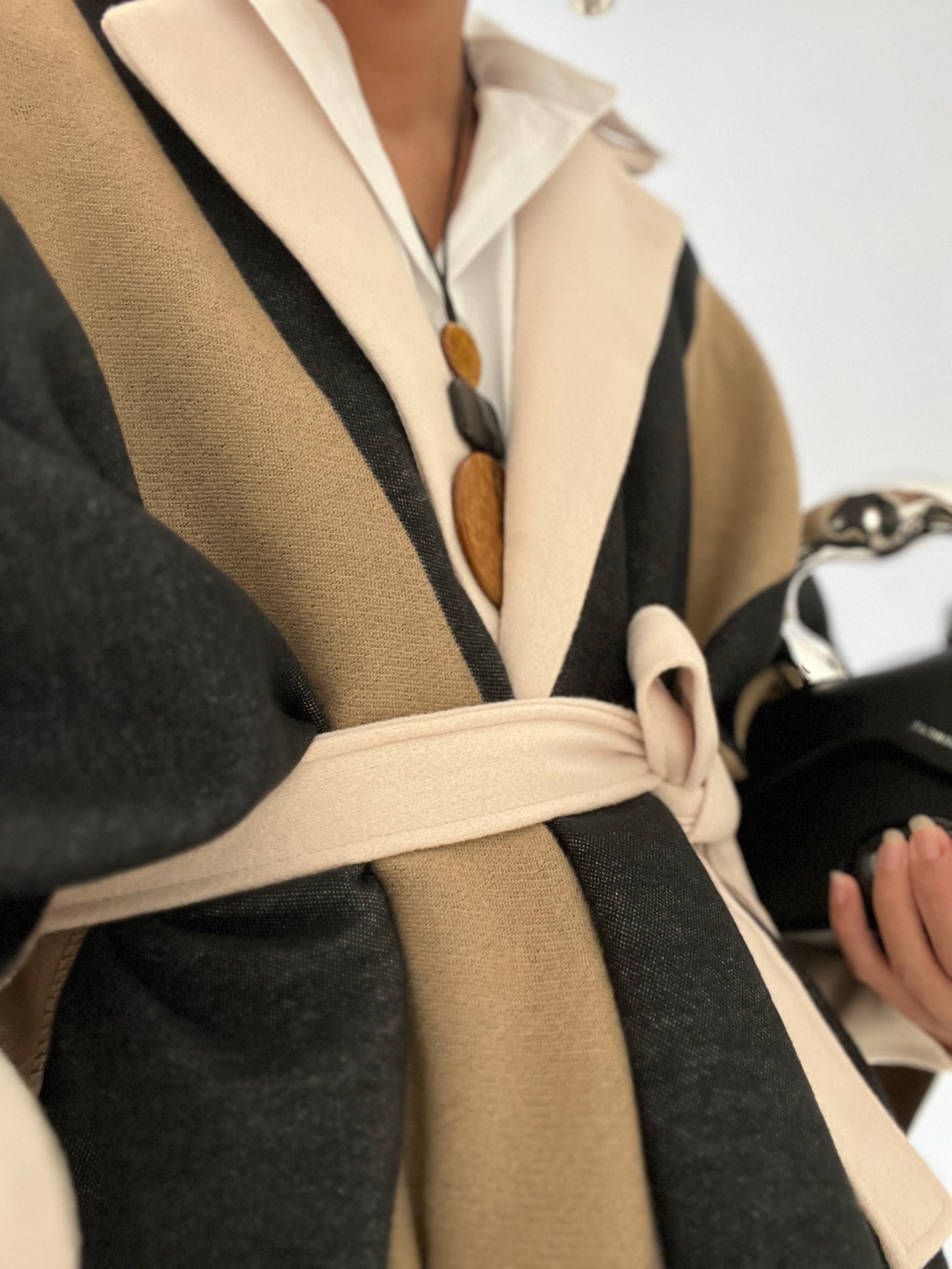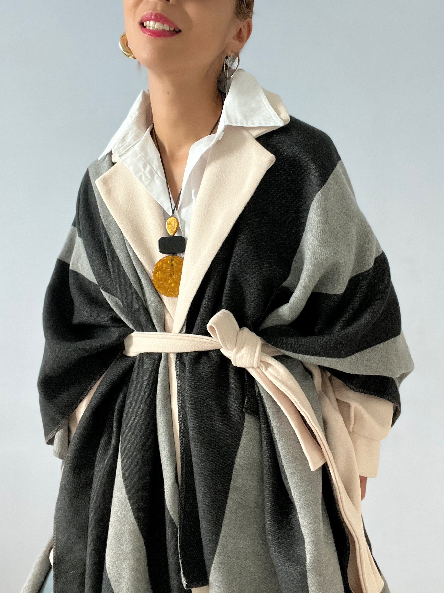 片側にはベルトループが付いており片方を通す事で表情を変えて変形ショールをお楽しみ頂けます。