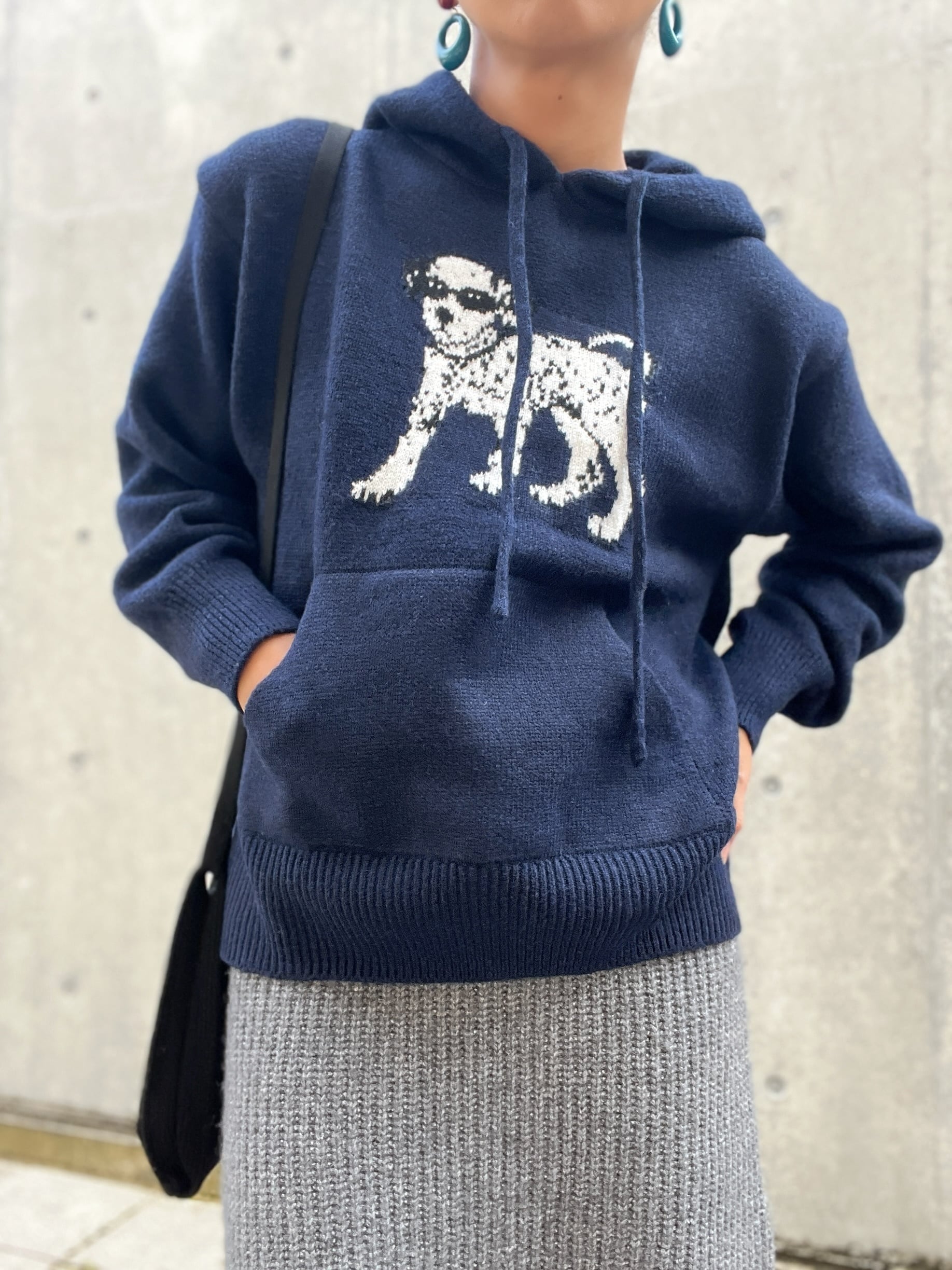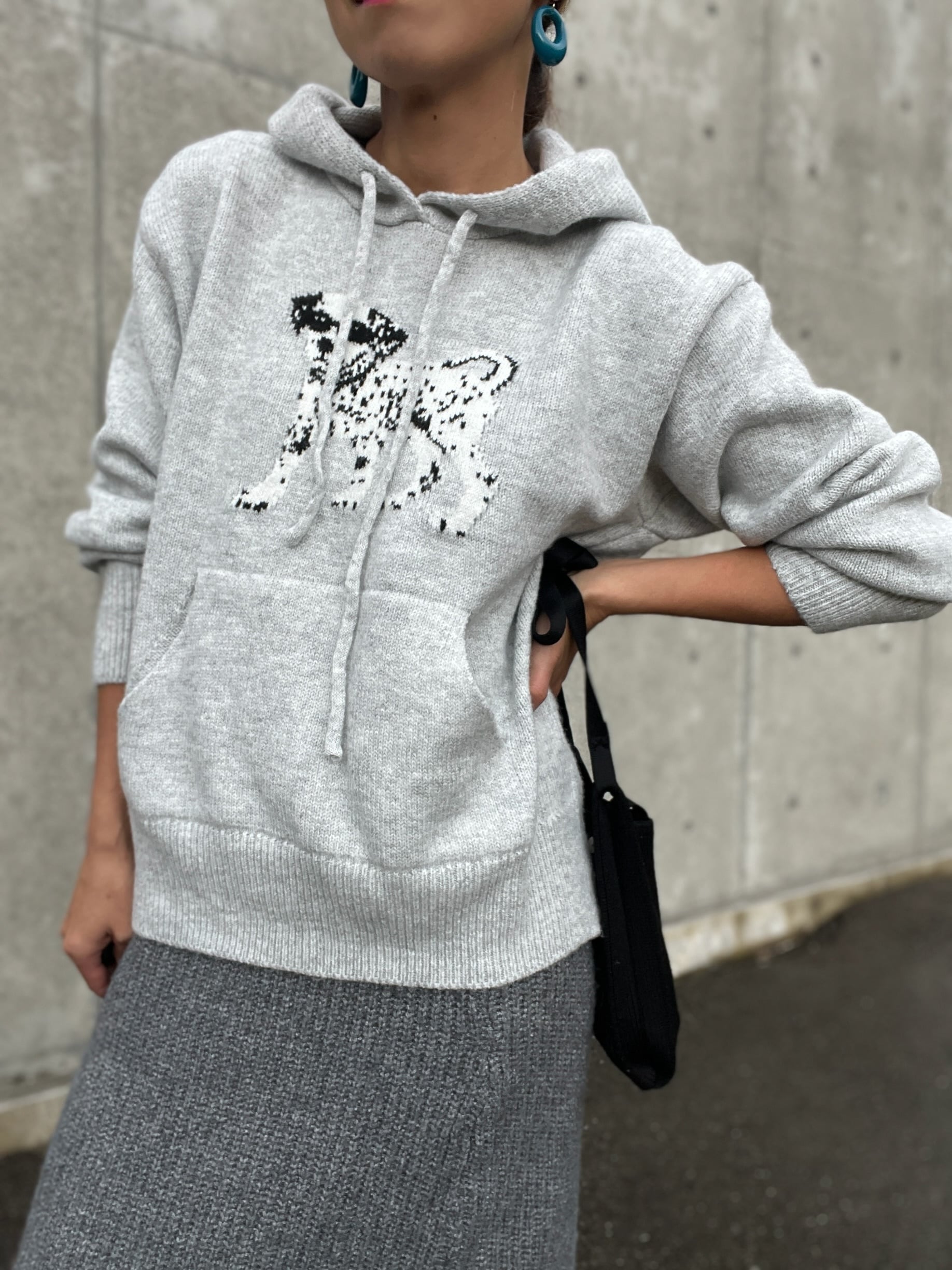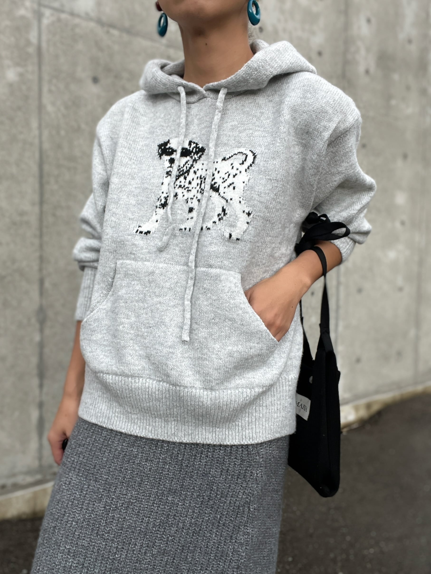 ダルメシアンアイコンのフーディーニットはハイゲージで編み込まれたジャガードニット。