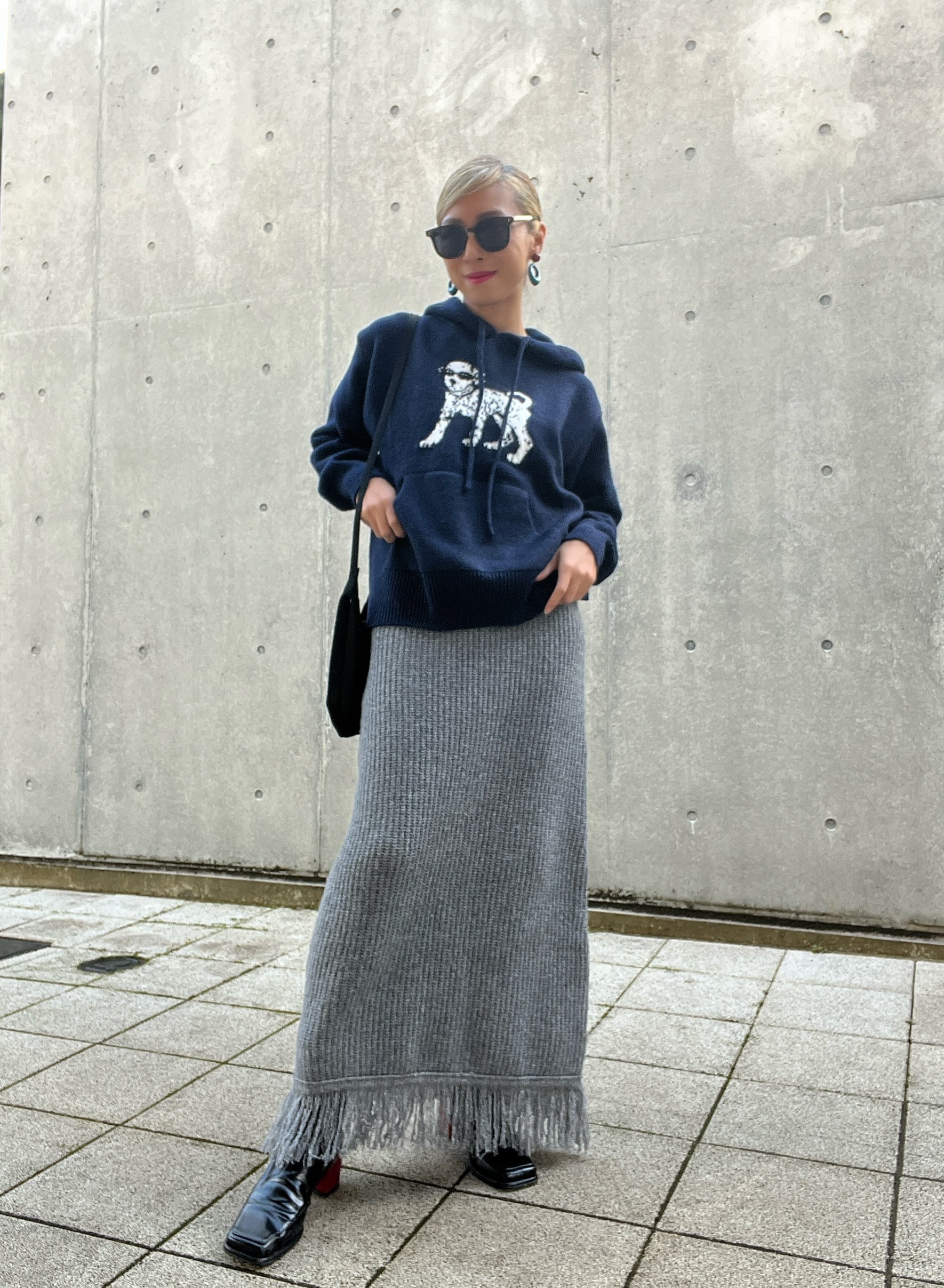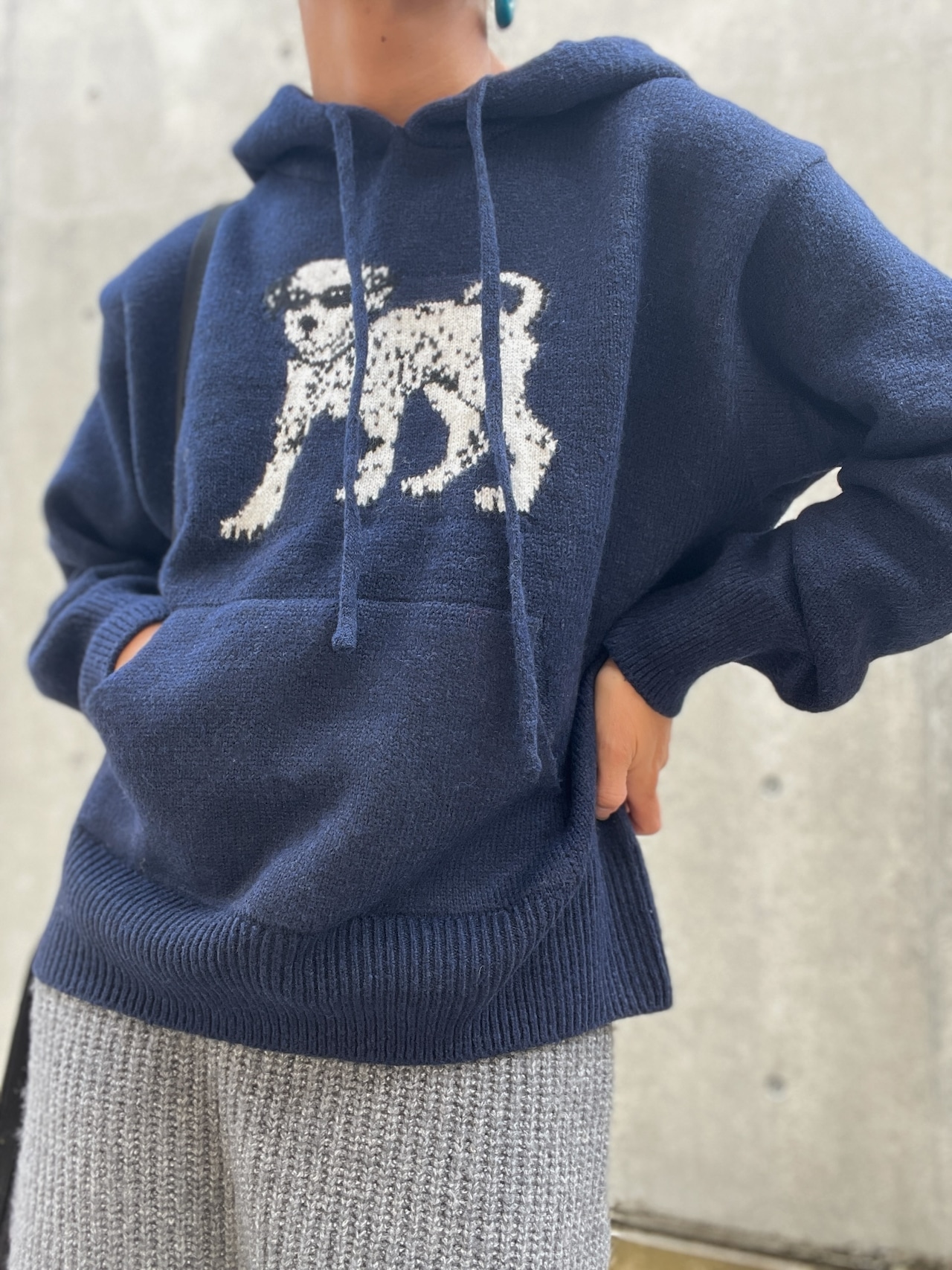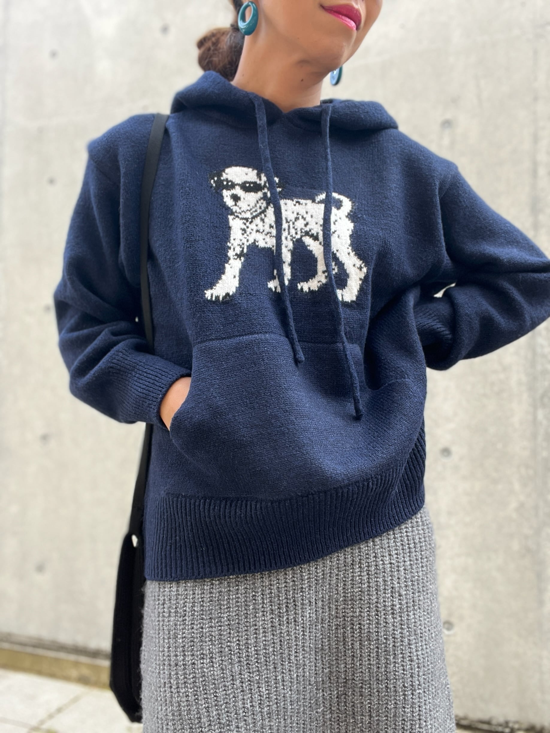ダルメシアンアイコンのフーディーニットはハイゲージで編み込まれたジャガードニット。
