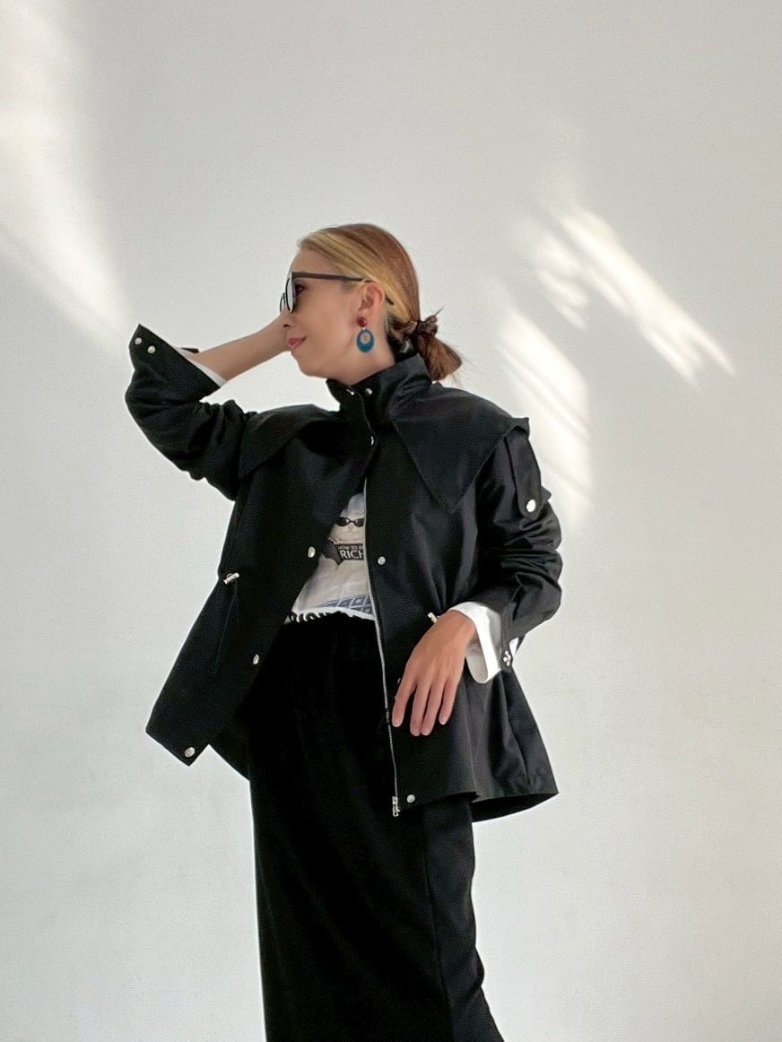 上品なセーラー襟と実用的なフーディーを融合させたブルゾン。