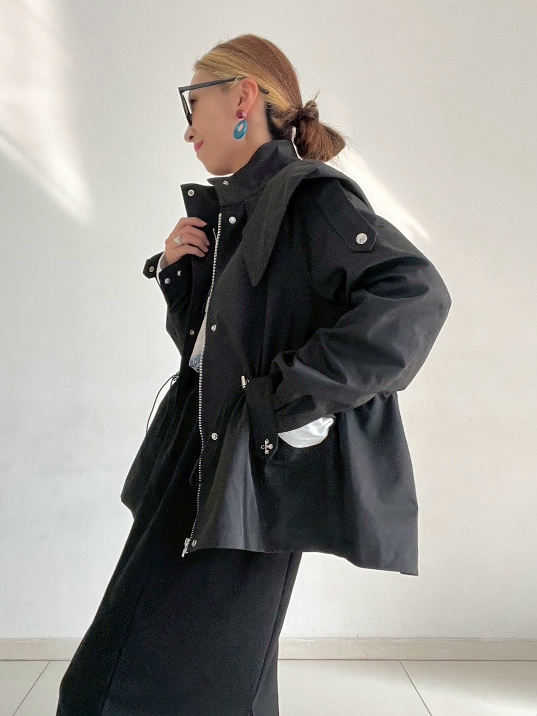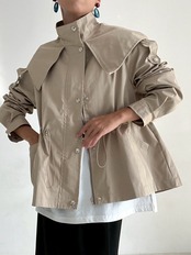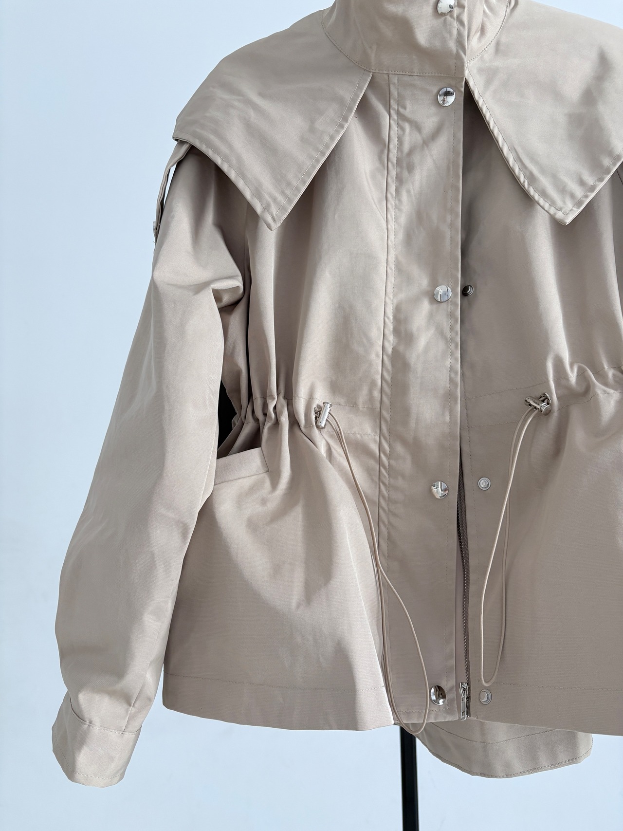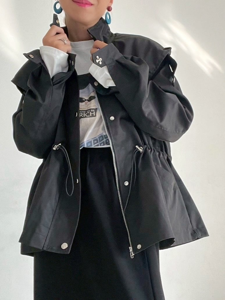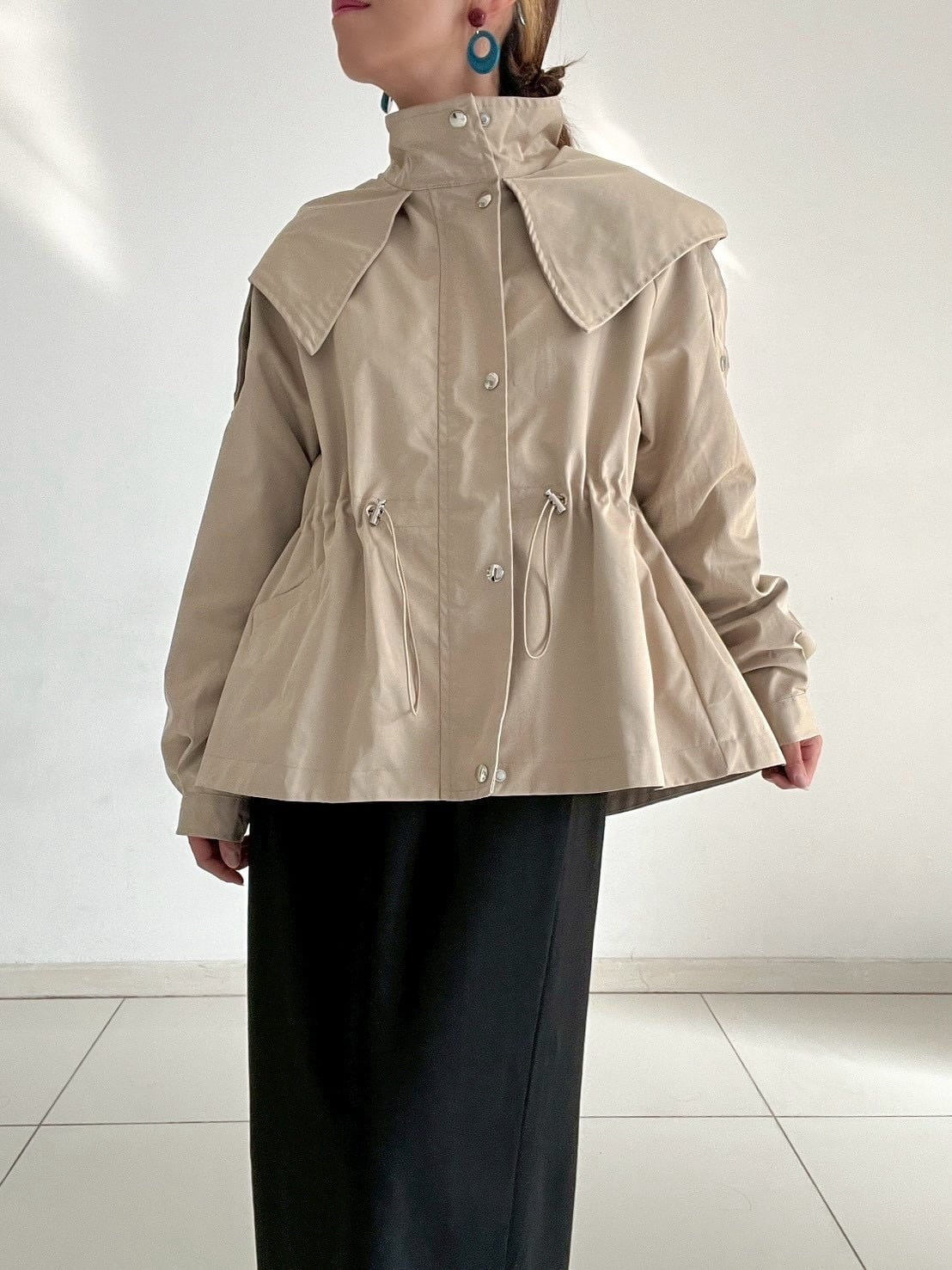 ウエストのドロストコードを絞ればメリハリのあるシルエットに、緩めれば柔らかなフレアラインへと表情が変化。フロントはジップ+スナップボタン仕様で、スタンドカラーにして上のボタンを留めると、自然なAラインが生まれ、こなれた印象に仕上がります。