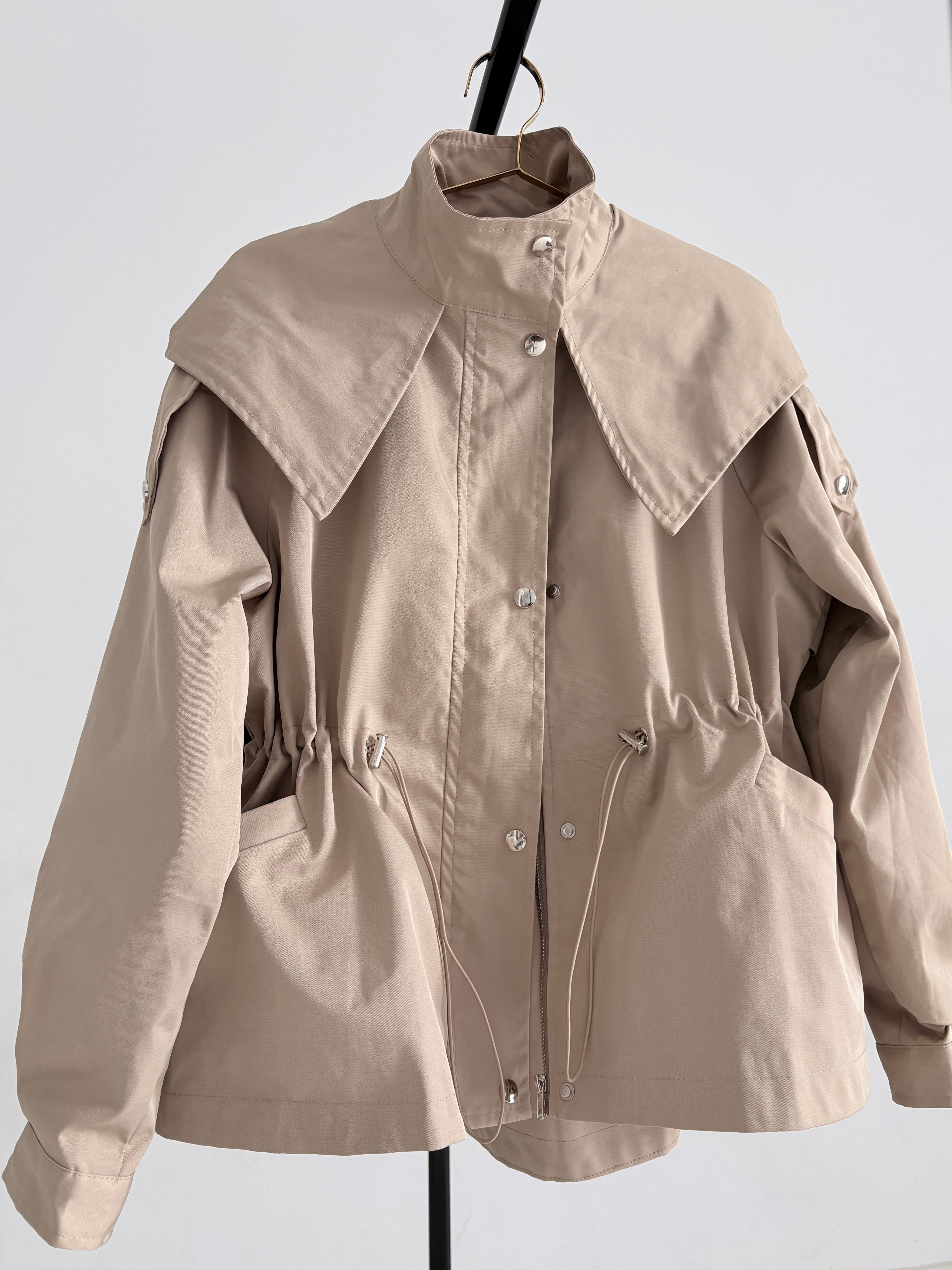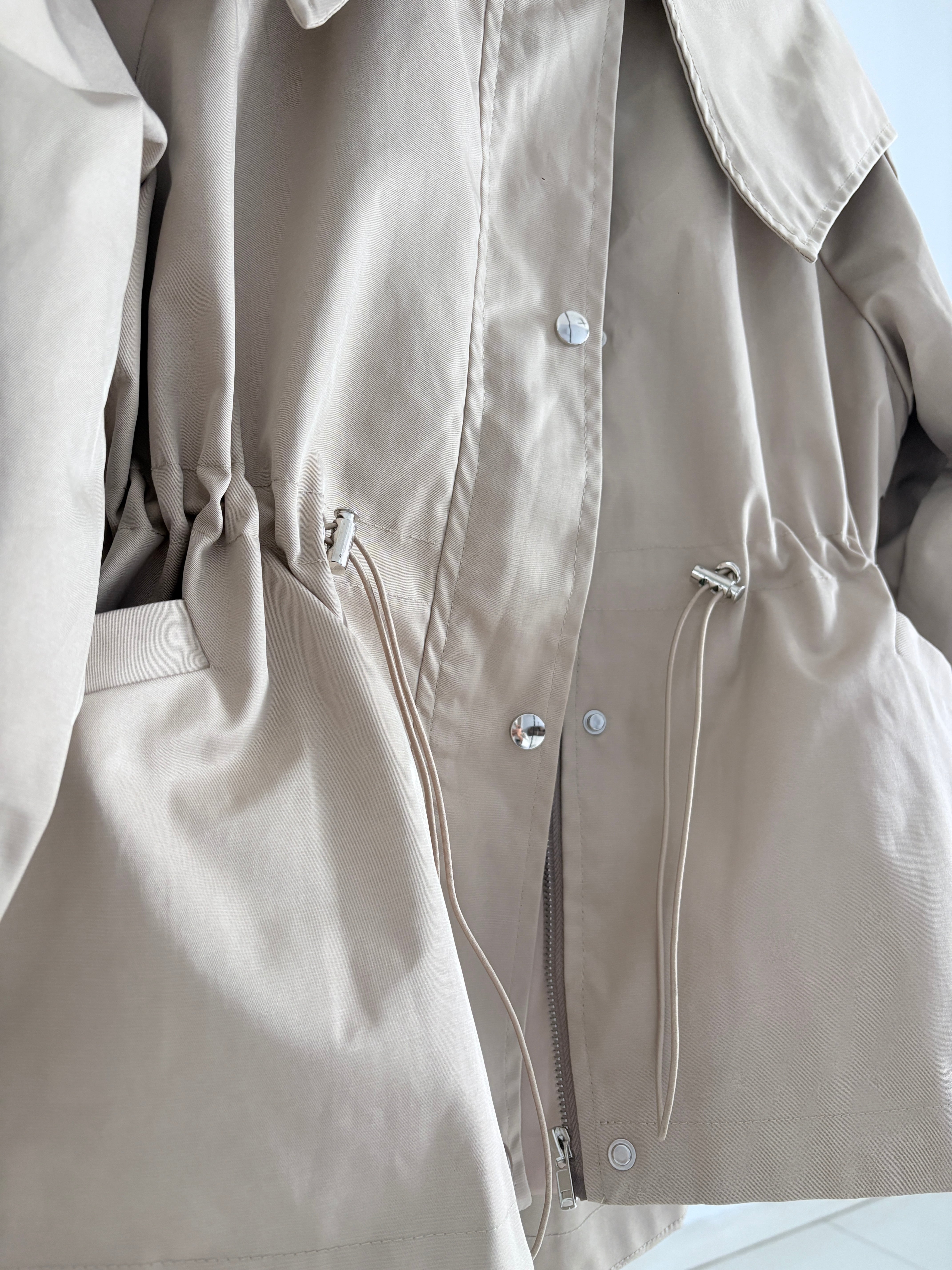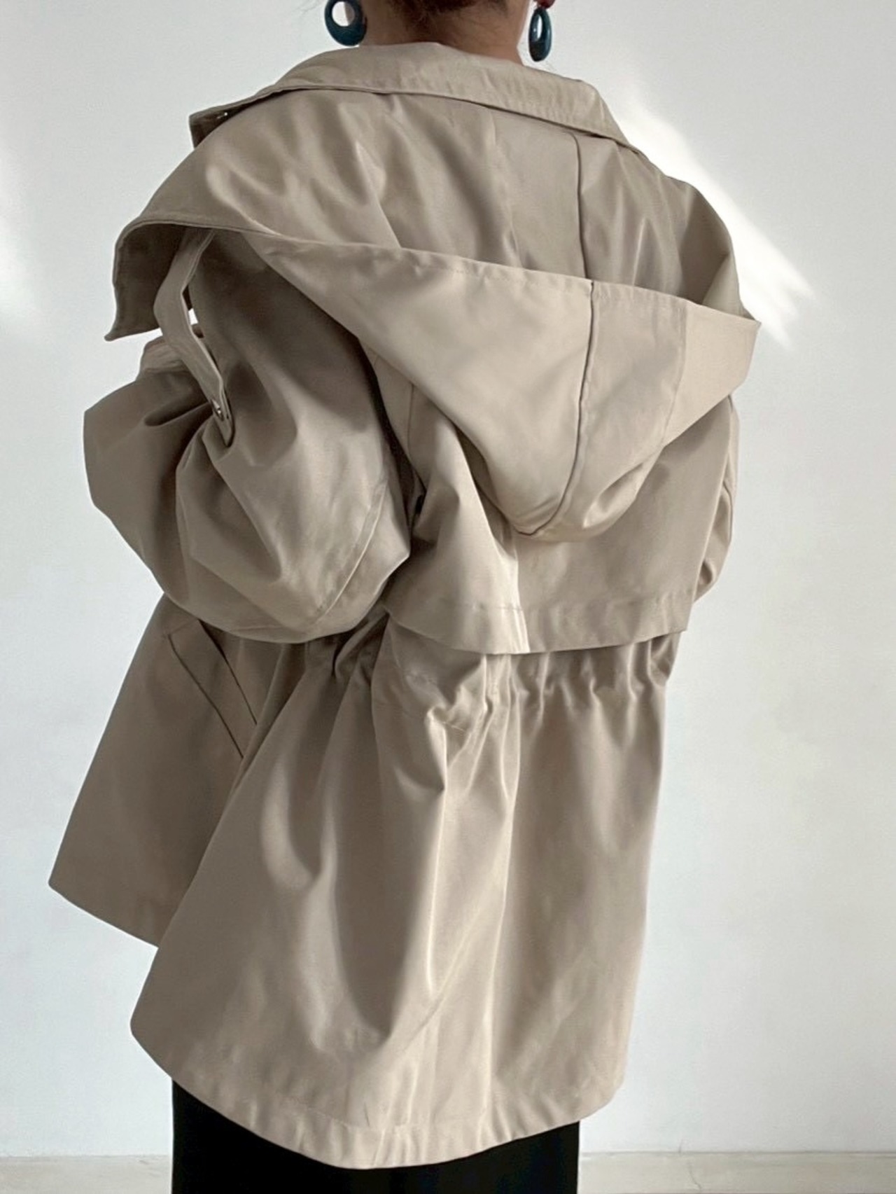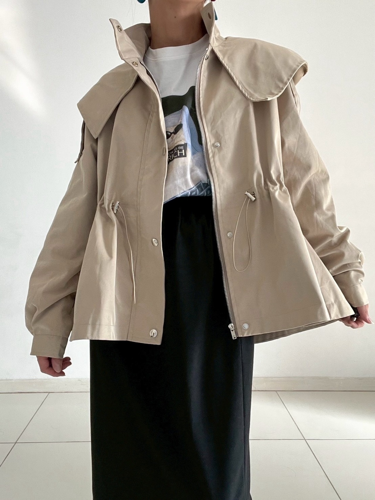 ウエストのドロストコードを絞ればメリハリのあるシルエットに、緩めれば柔らかなフレアラインへと表情が変化。フロントはジップ+スナップボタン仕様で、スタンドカラーにして上のボタンを留めると、自然なAラインが生まれ、こなれた印象に仕上がります。