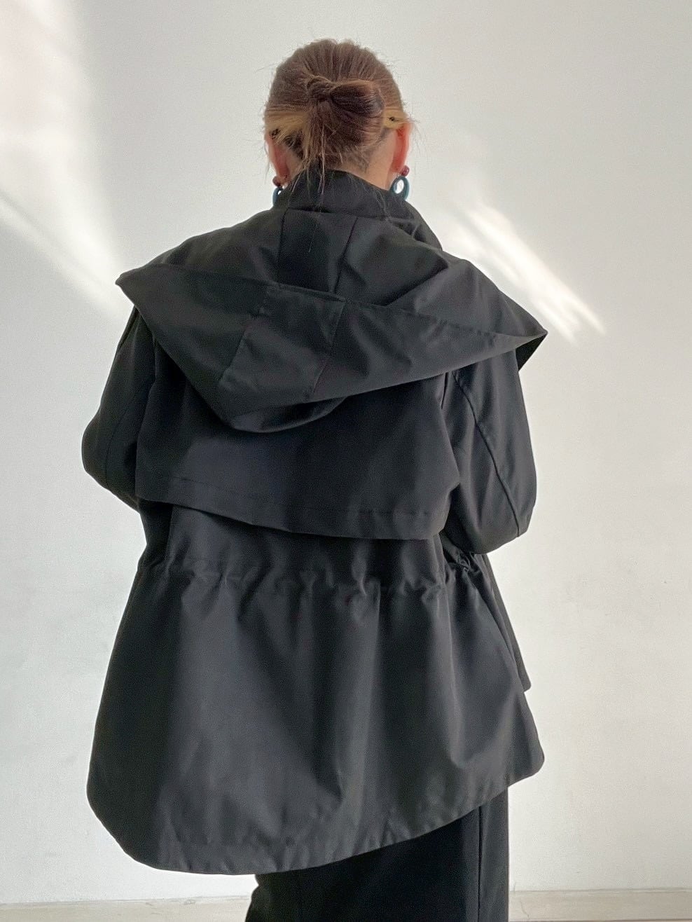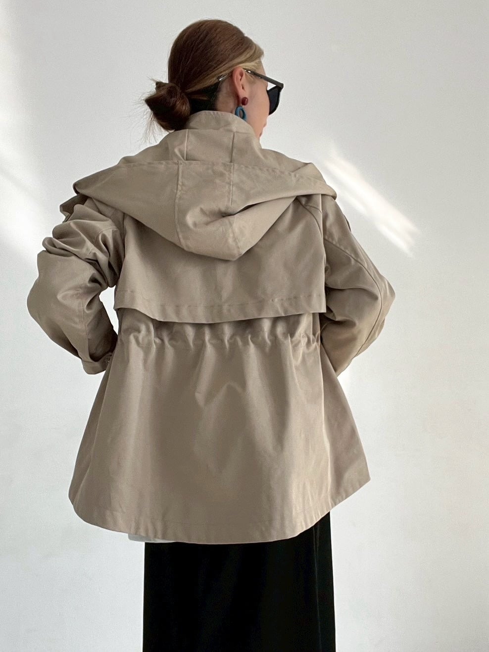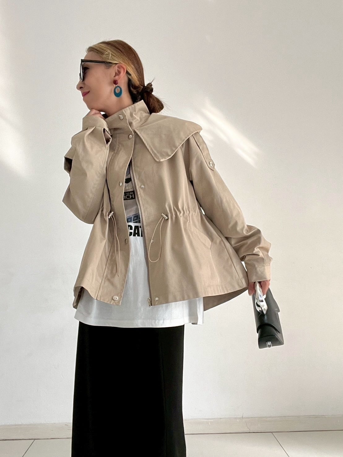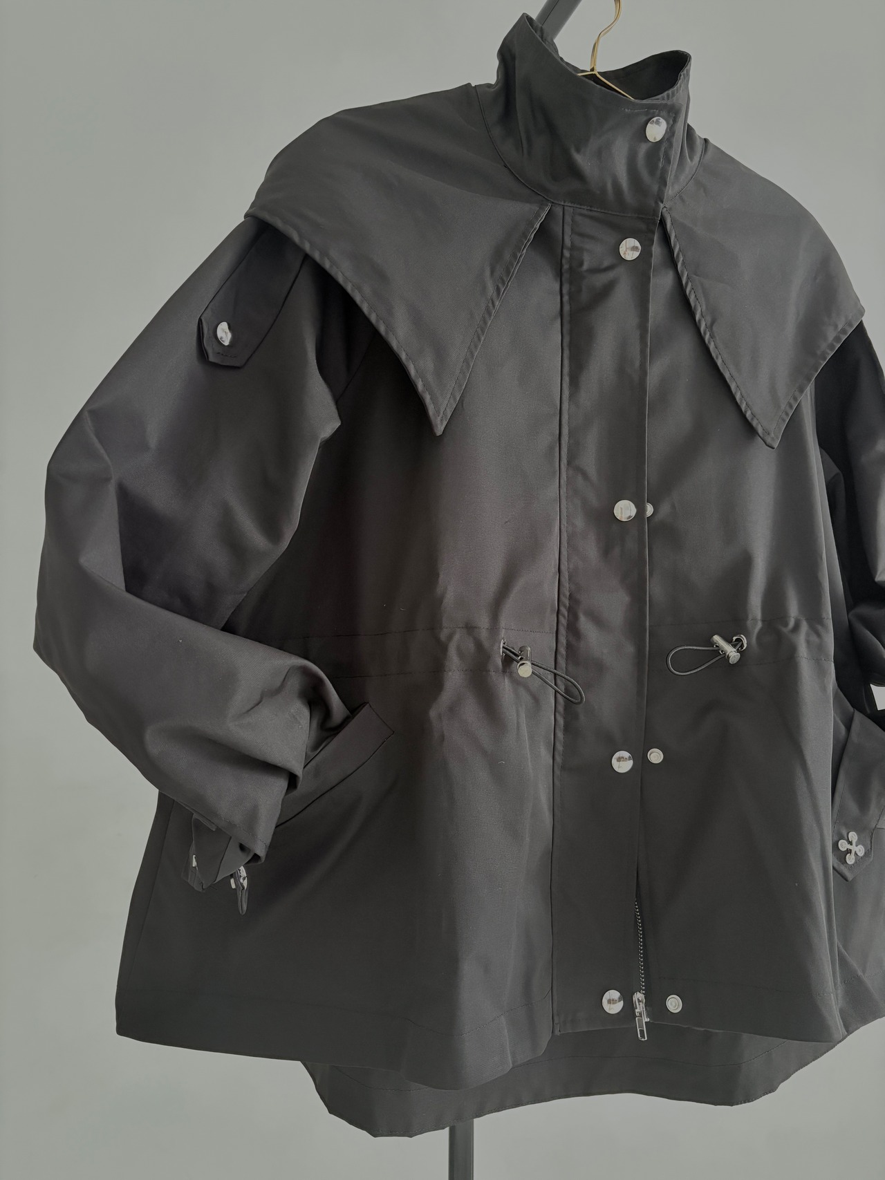 ウエストのドロストコードを絞ればメリハリのあるシルエットに、緩めれば柔らかなフレアラインへと表情が変化。フロントはジップ+スナップボタン仕様で、スタンドカラーにして上のボタンを留めると、自然なAラインが生まれ、こなれた印象に仕上がります。