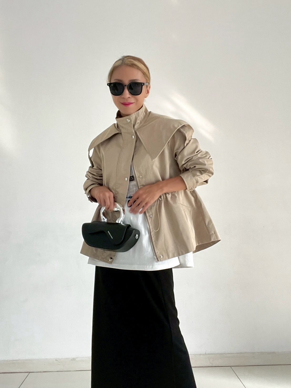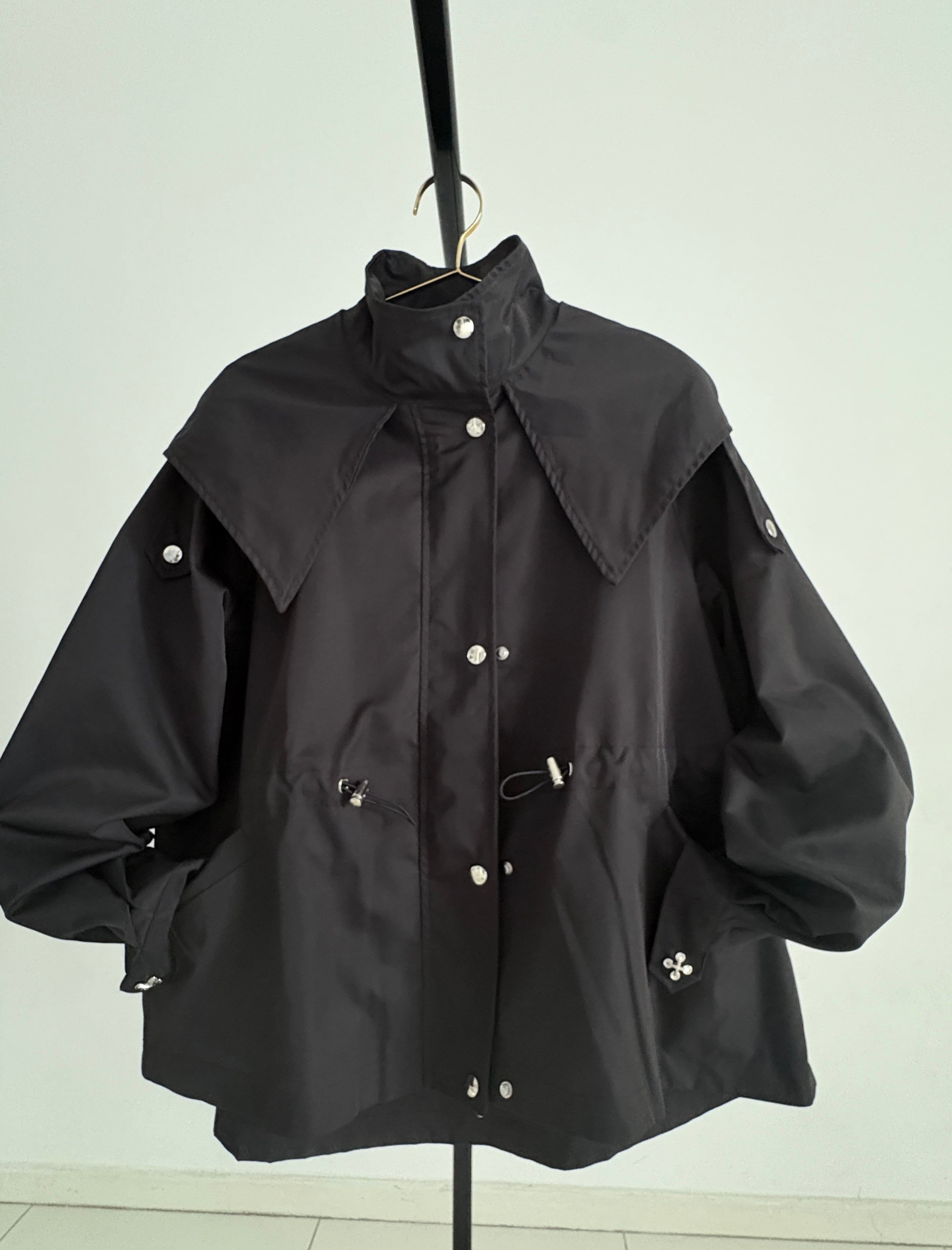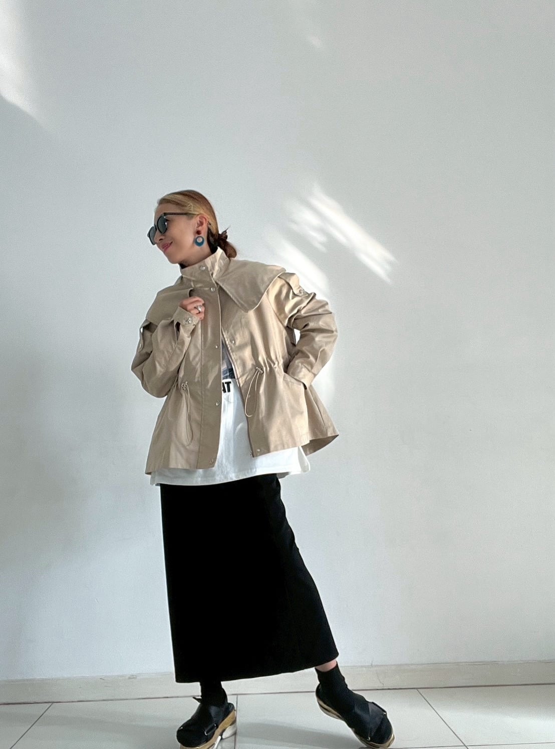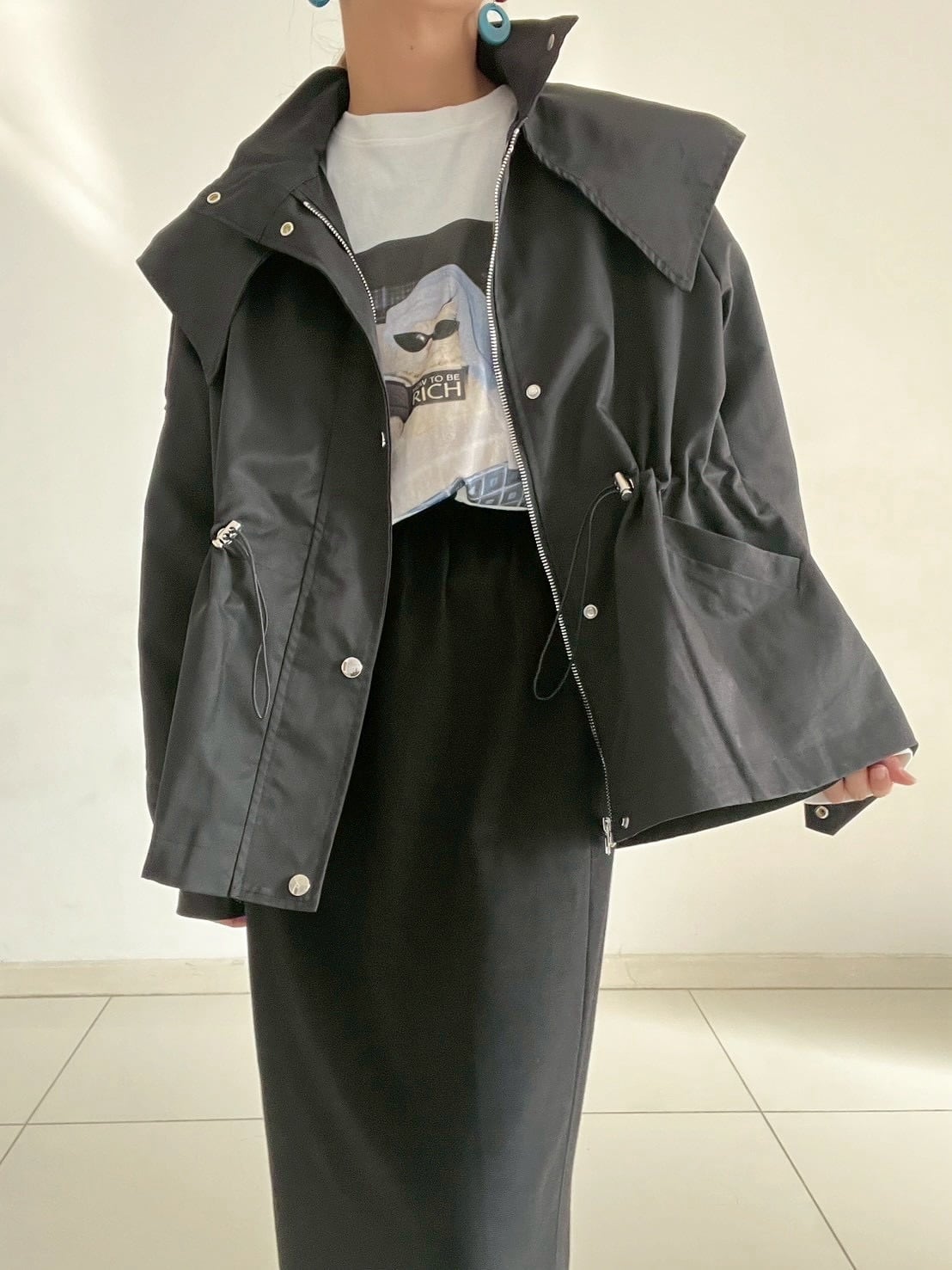 ウエストのドロストコードを絞ればメリハリのあるシルエットに、緩めれば柔らかなフレアラインへと表情が変化。フロントはジップ+スナップボタン仕様で、スタンドカラーにして上のボタンを留めると、自然なAラインが生まれ、こなれた印象に仕上がります。