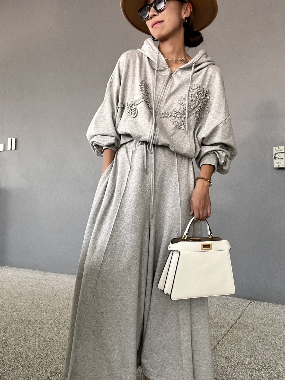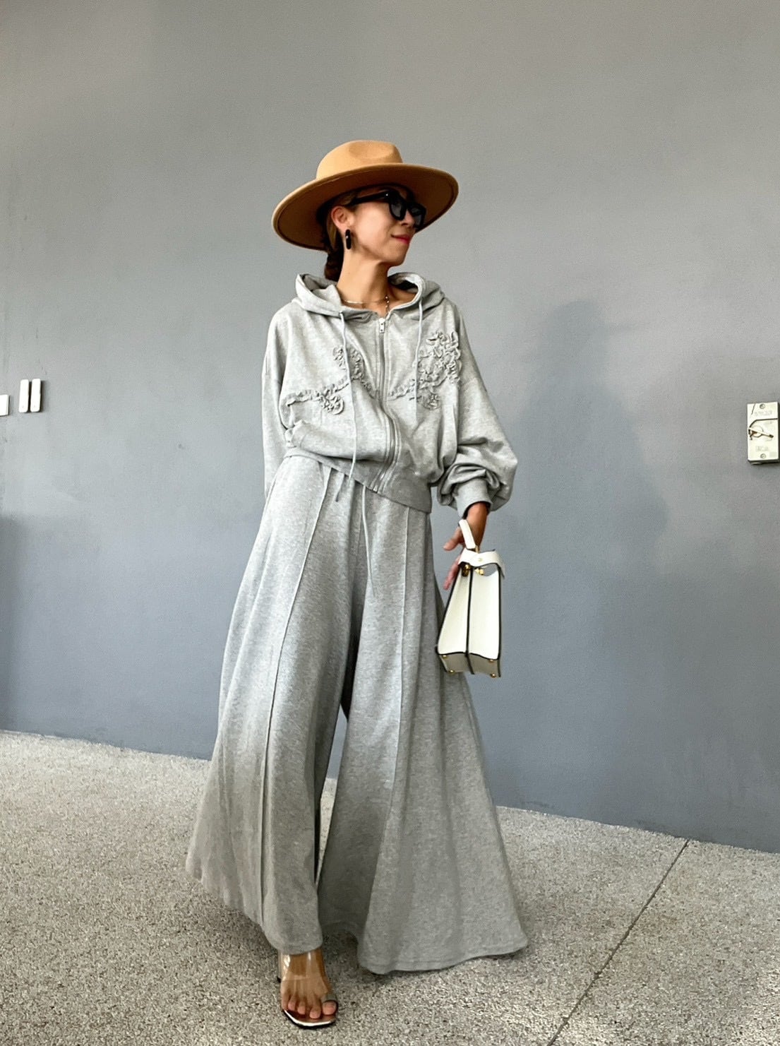 繊細な刺繍ではなく、あえてスウェット生地を「叩きつける」ことで、甘すぎないモードなカジュアルさを演出。