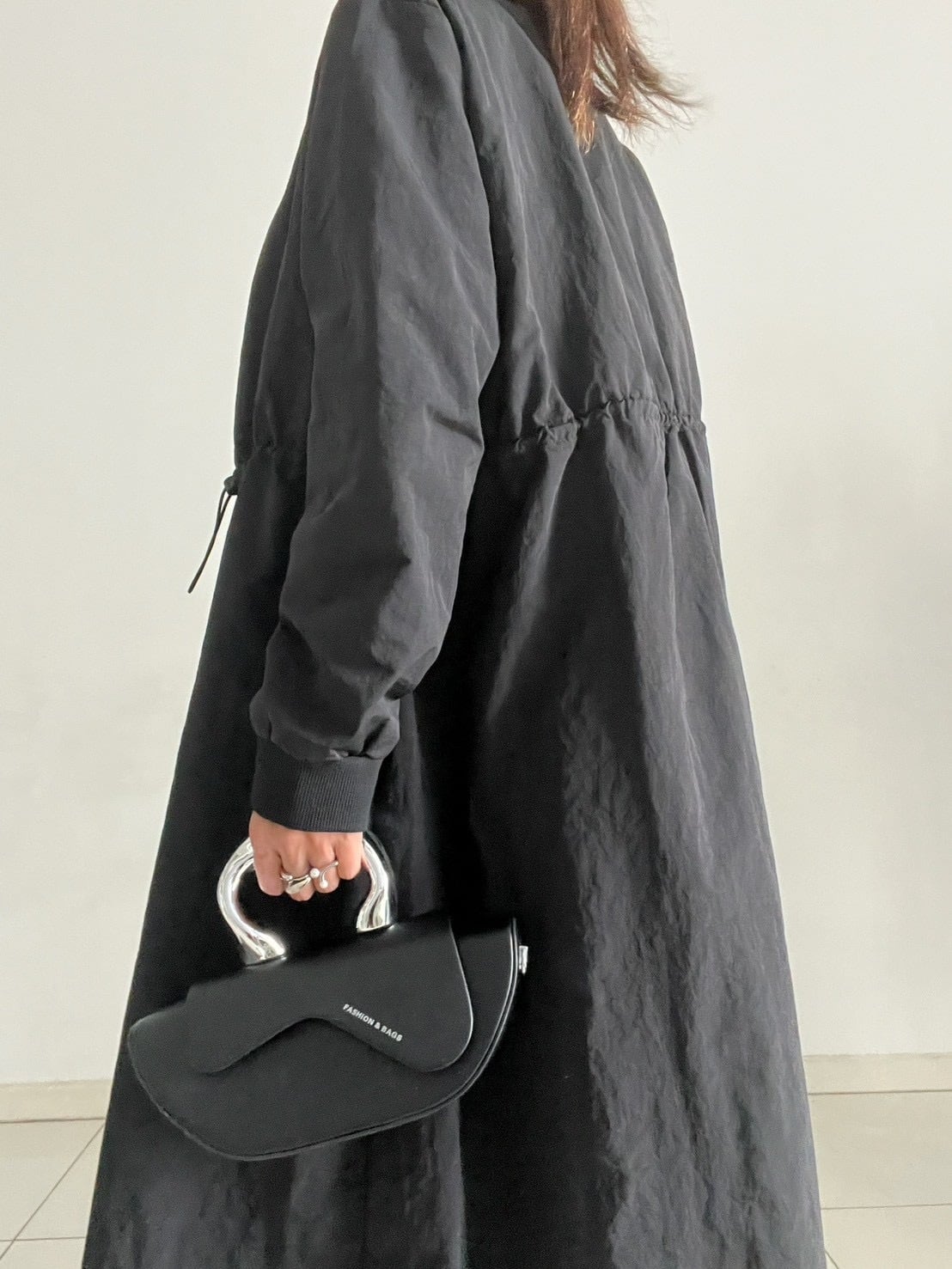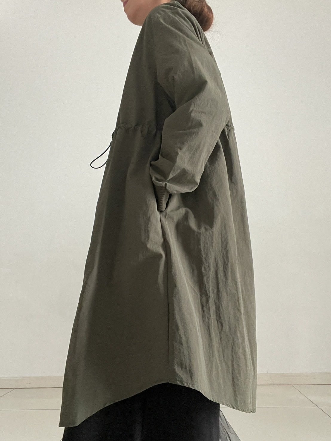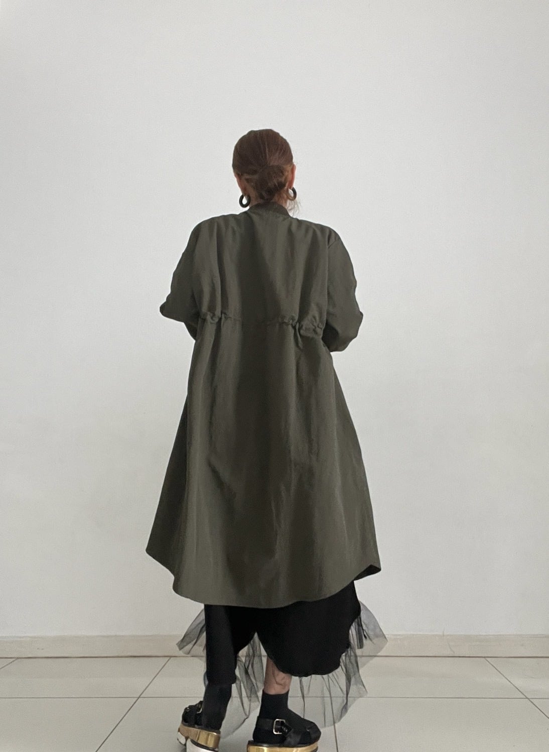 きゅっと絞ることで自然にギャザーが生まれ、メリハリのあるシルエットに。