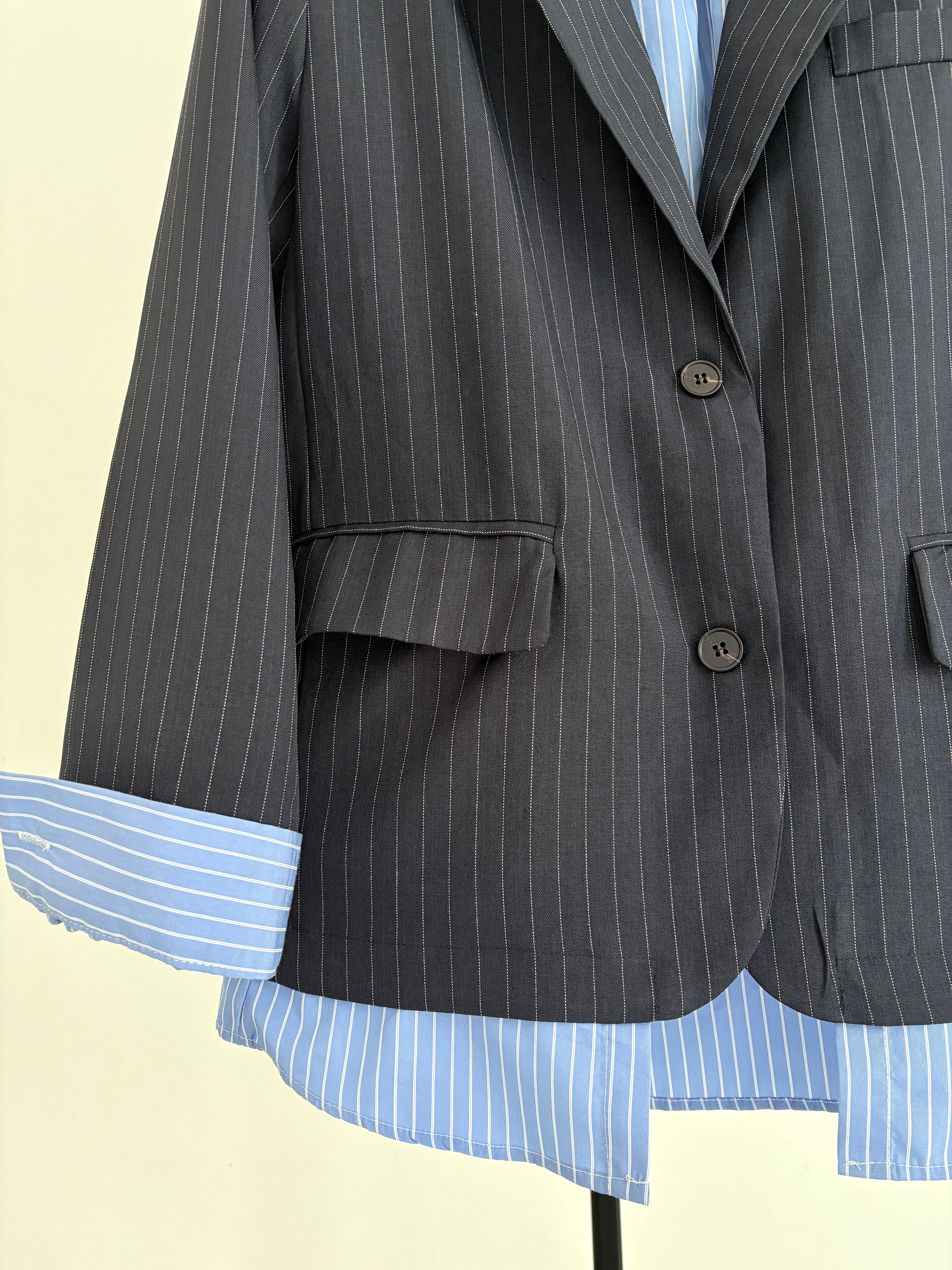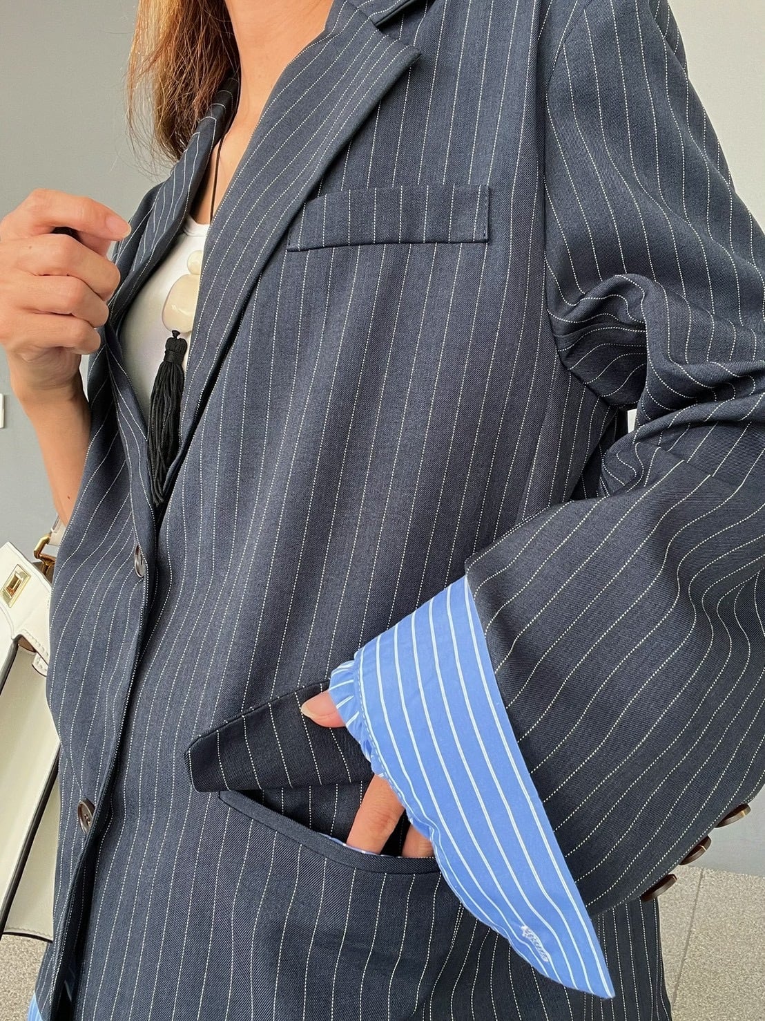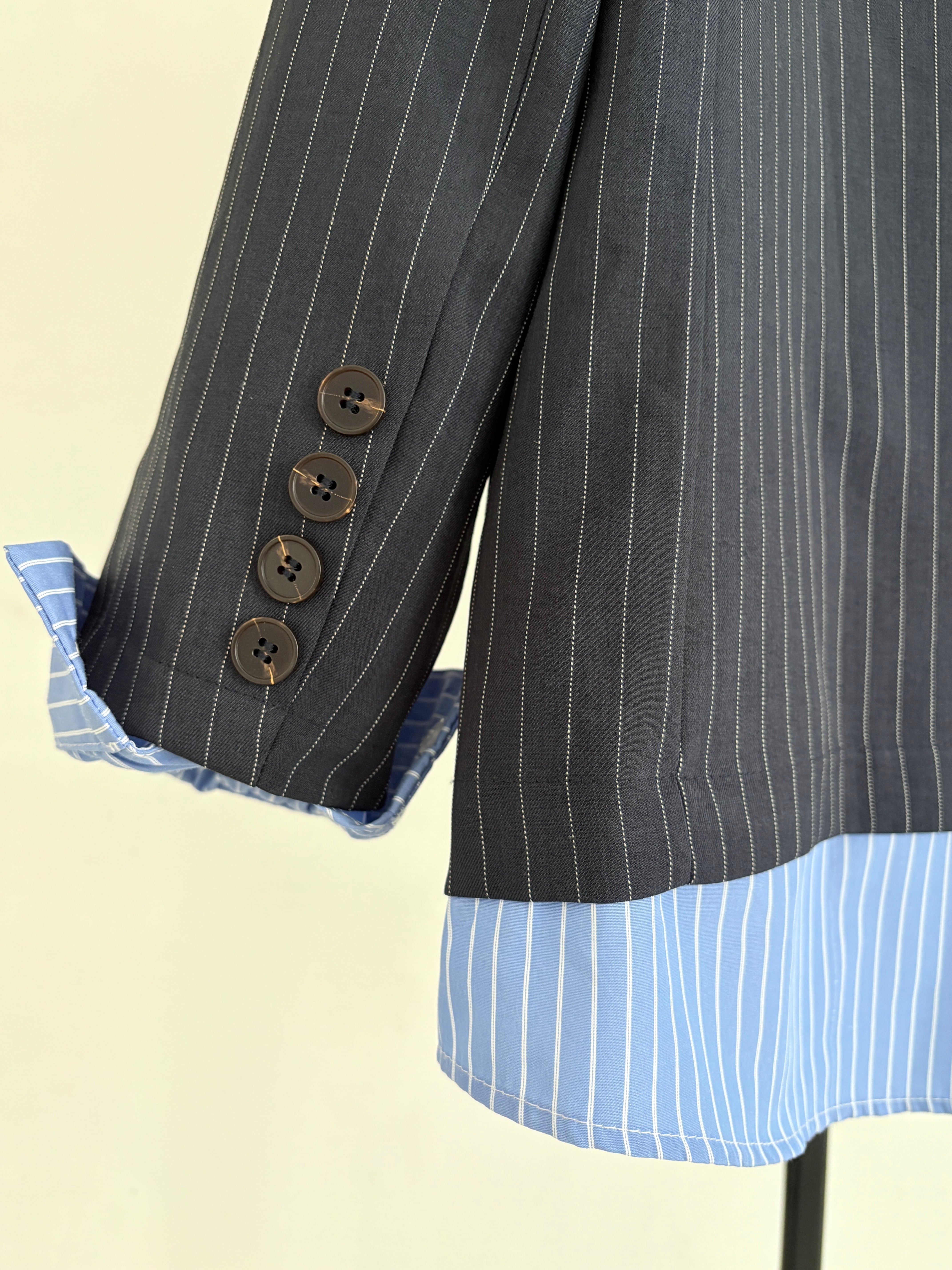 シックなネイビーピンストライプの表地から、鮮やかなブルーピンストライプの裏地が覗く、計算されたコントラストデザイン。