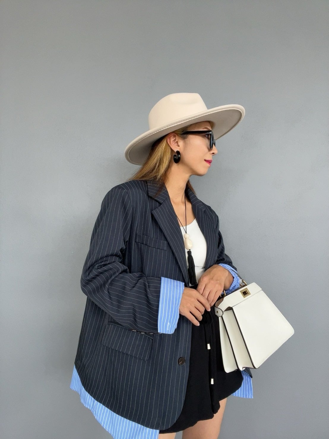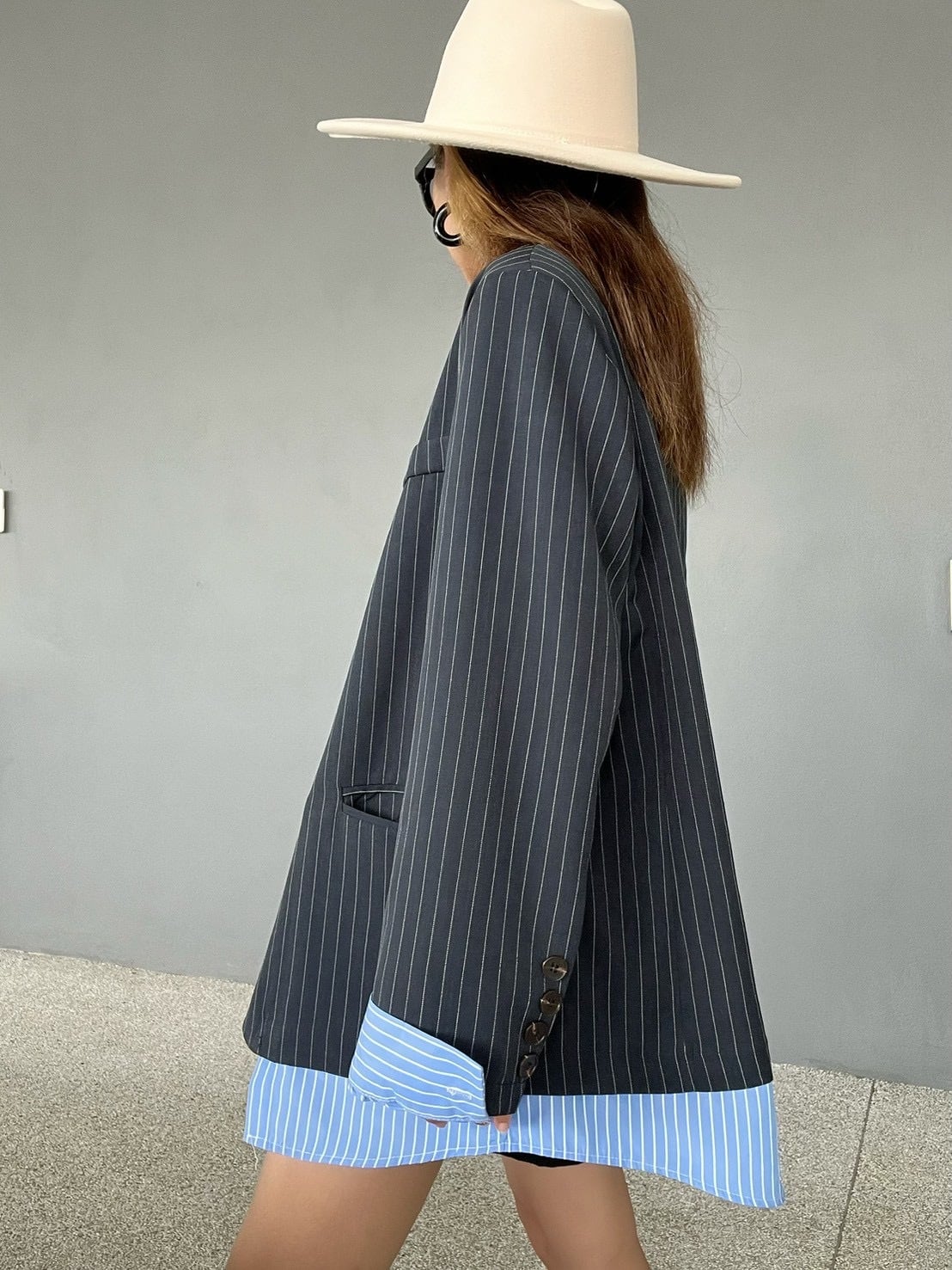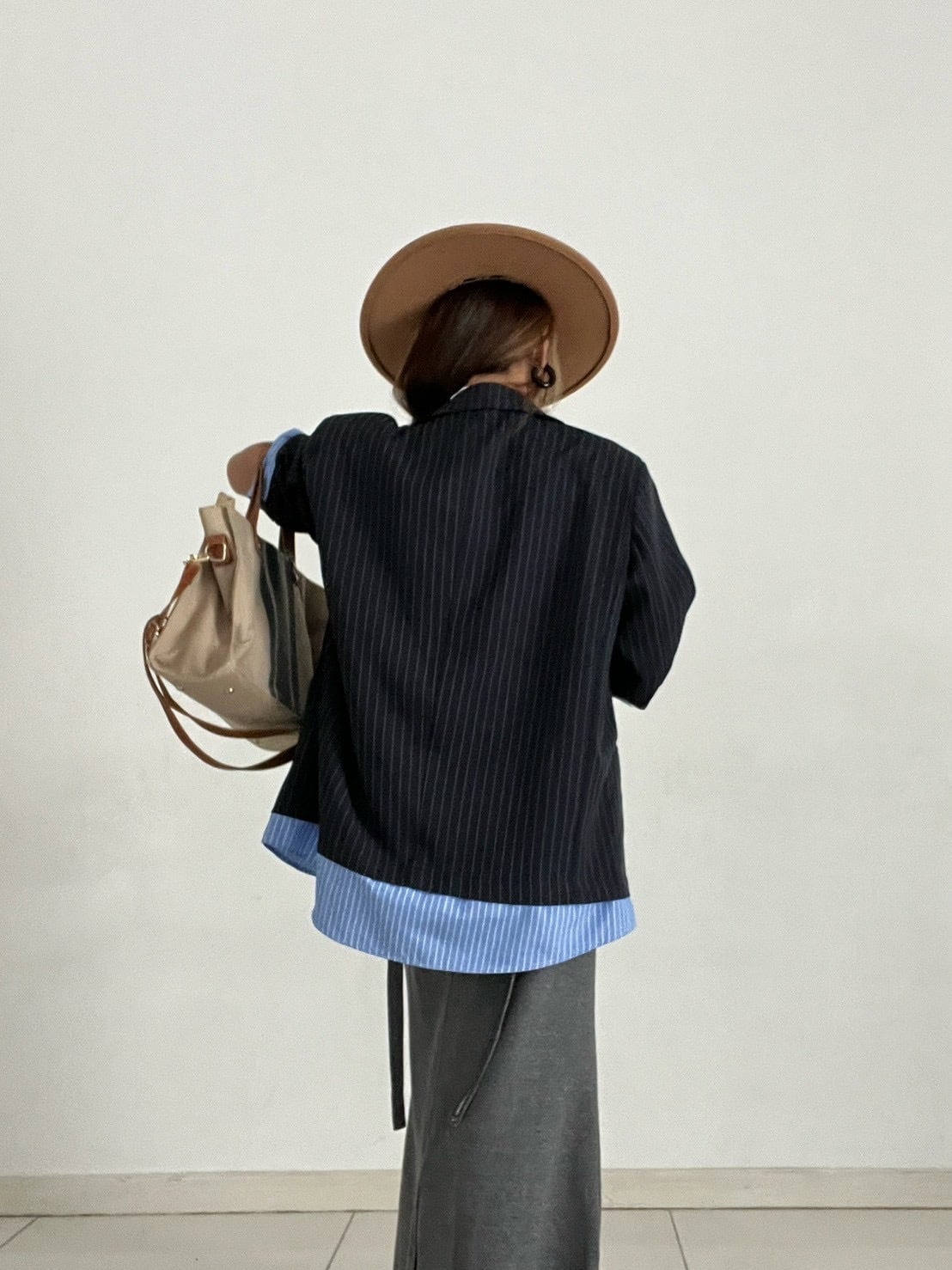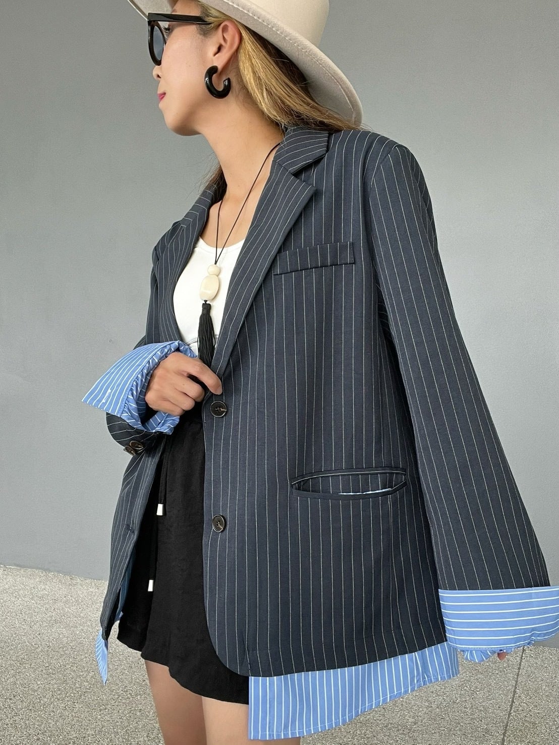 シックなネイビーピンストライプの表地から、鮮やかなブルーピンストライプの裏地が覗く、計算されたコントラストデザイン。