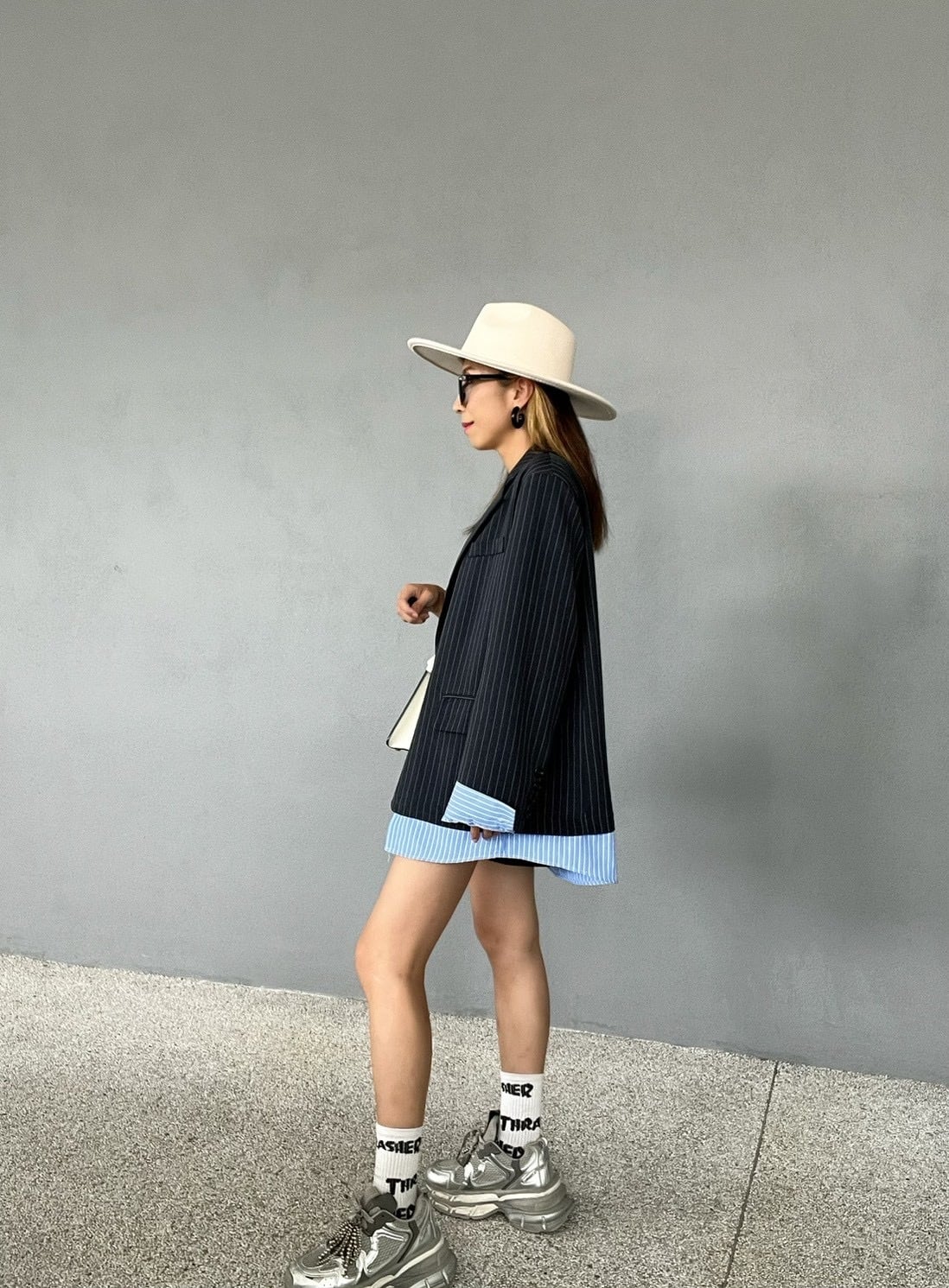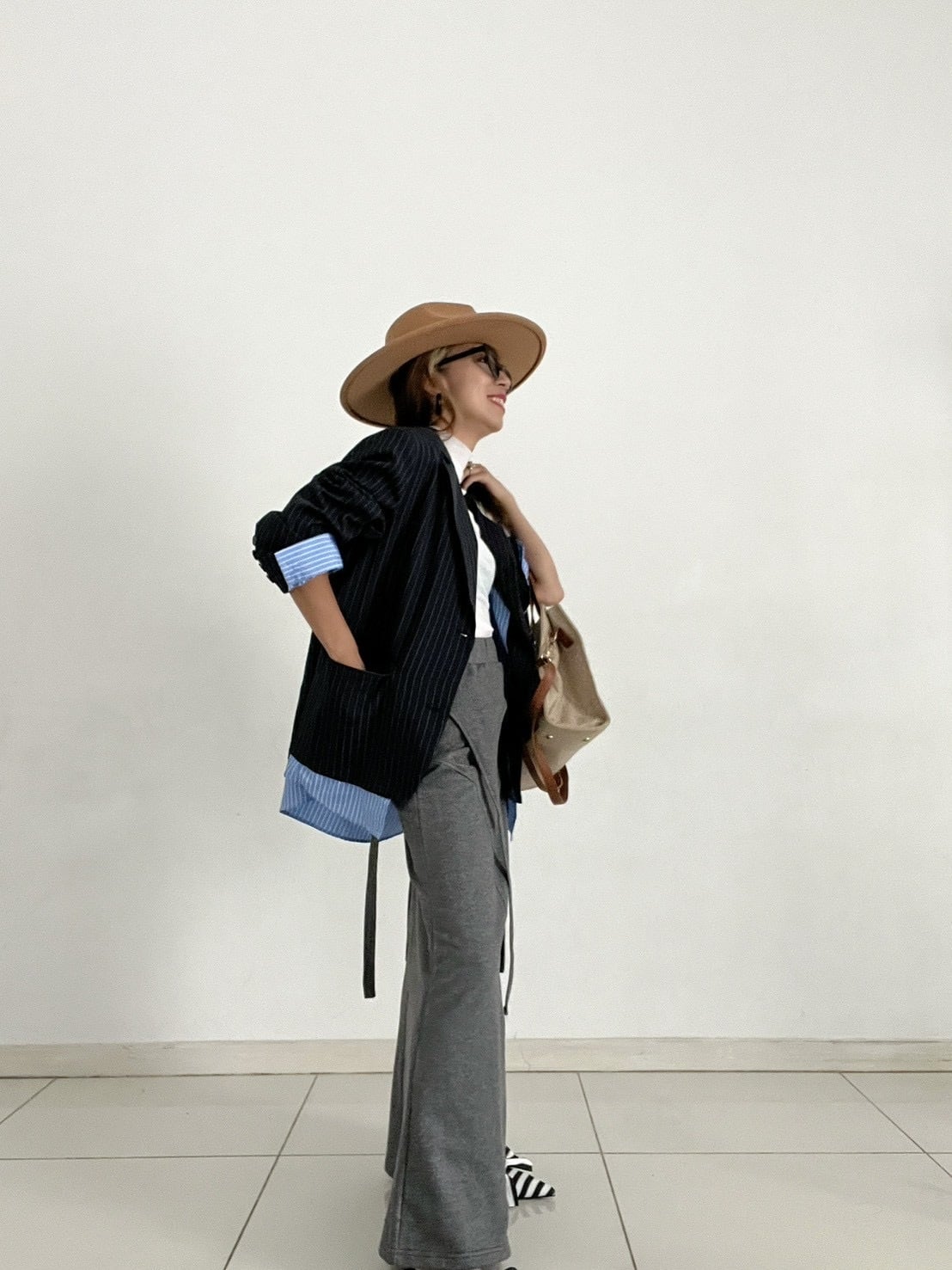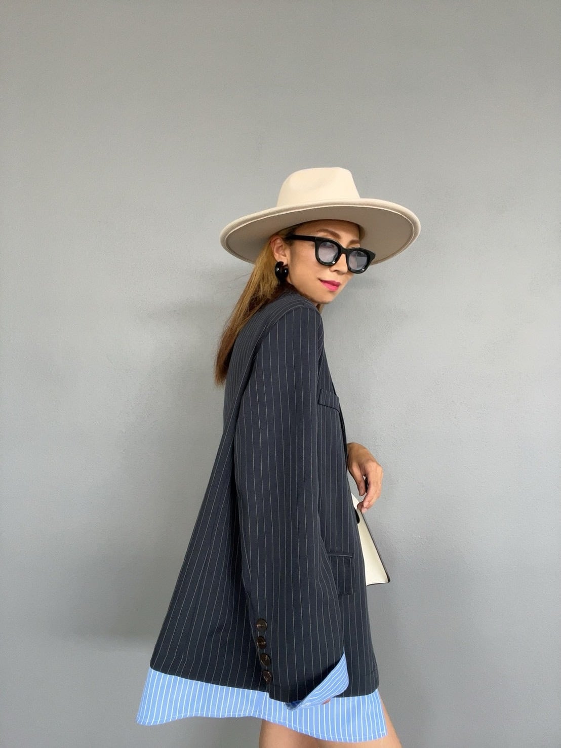 肩パッド入りでショルダーラインを整え、ゆとりのあるメンズライクなフォルムがモードで洗練された印象に。