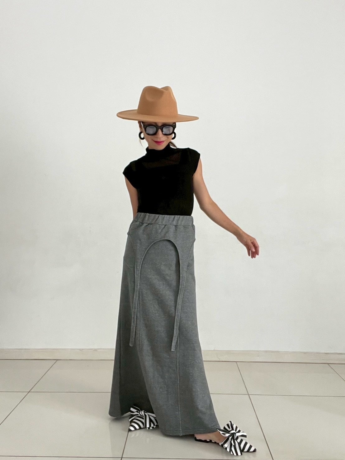 デコルテを上品に見せつつ、スポーティーな素材とのコントラストで洗練された印象に。