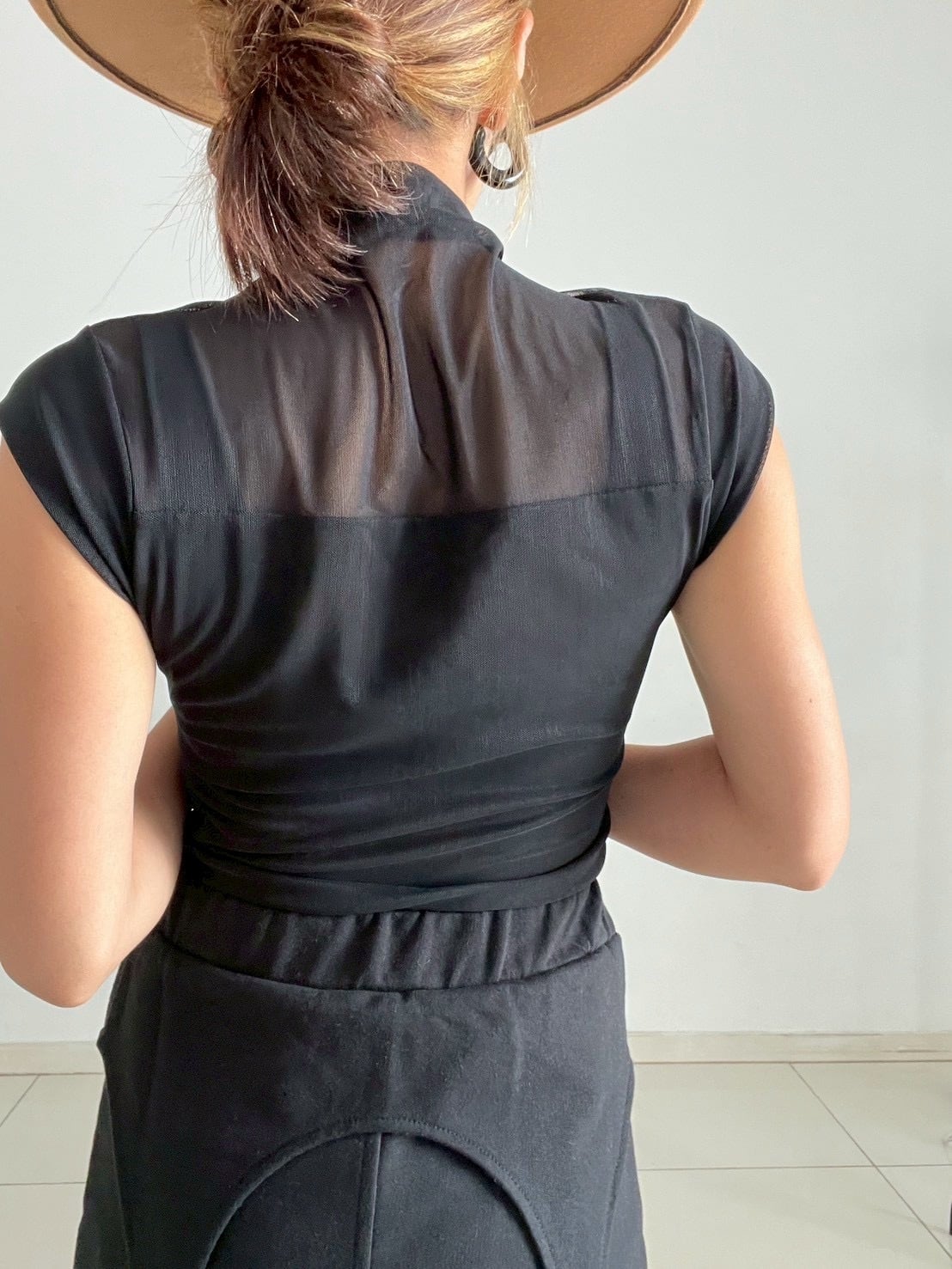 一見ノースリーブのように見えますが、肩先をほんの少し覆う絶妙なカッティング。