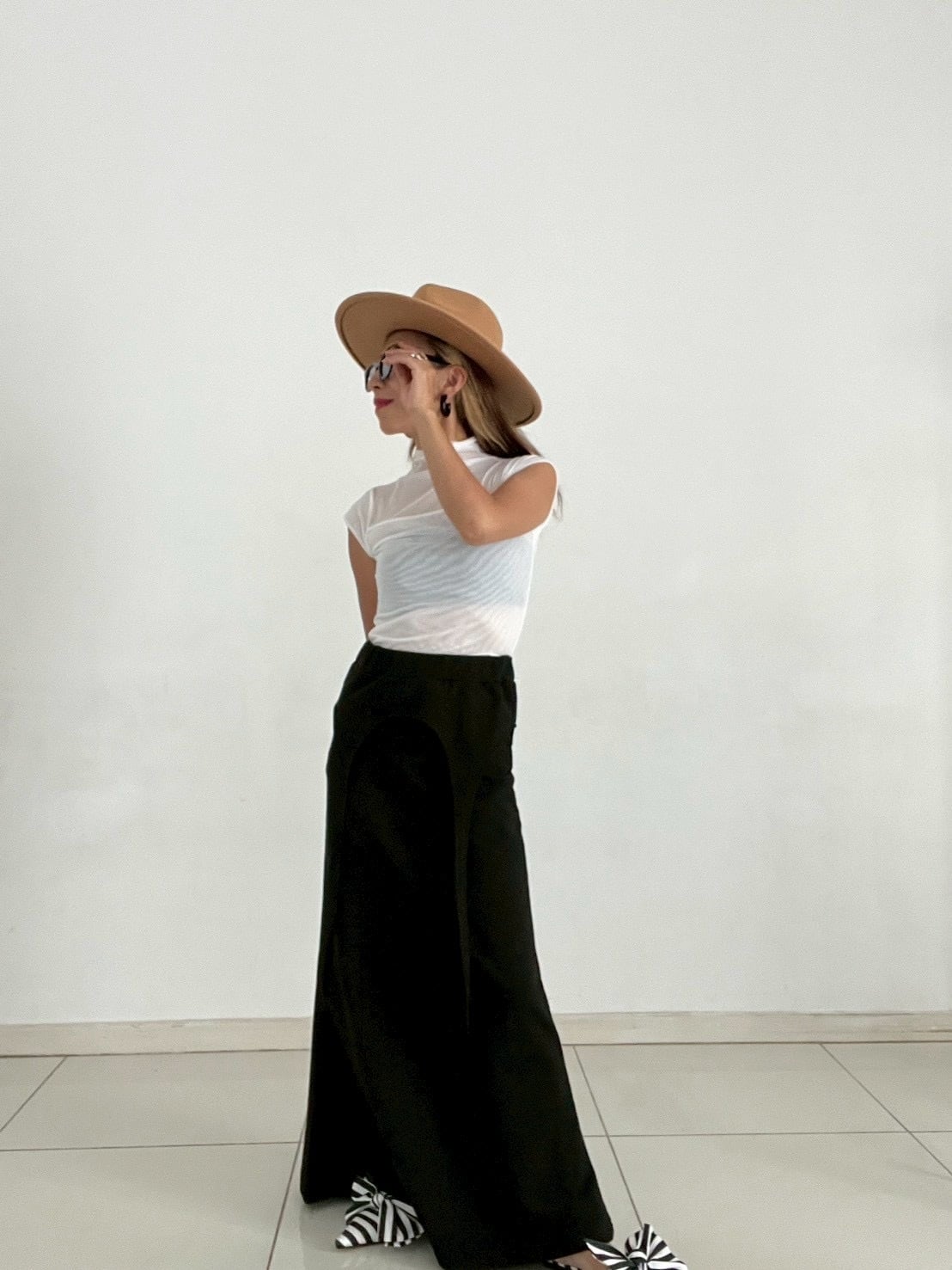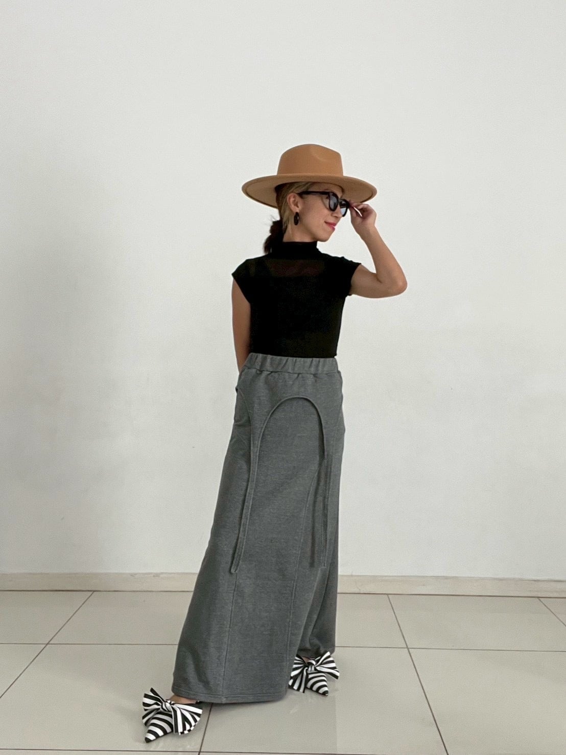 アーチ状のカットラインが腰位置を高く演出し、さりげなく女性らしいシルエットを引き立てる一着です。