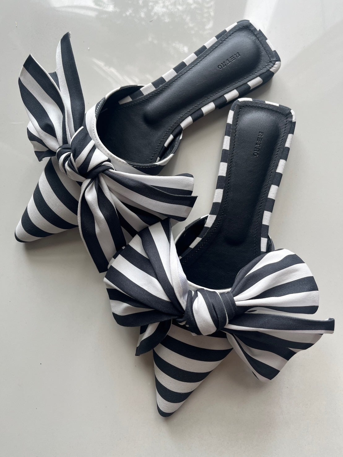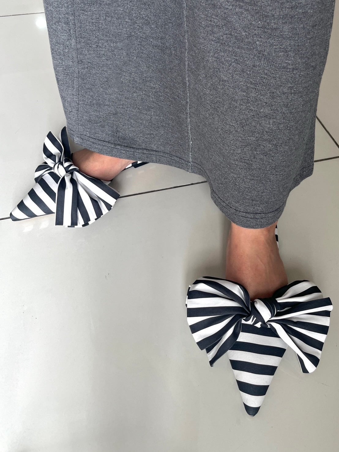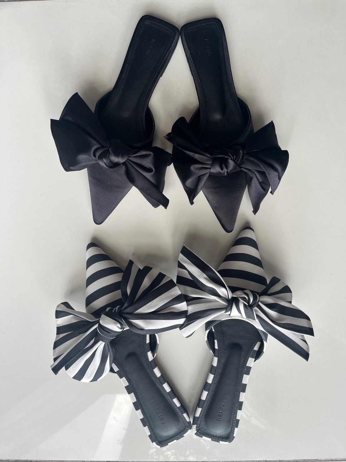 パッと目を引くビッグリボンが印象的な、フラットタイプのミュールスリッパ。