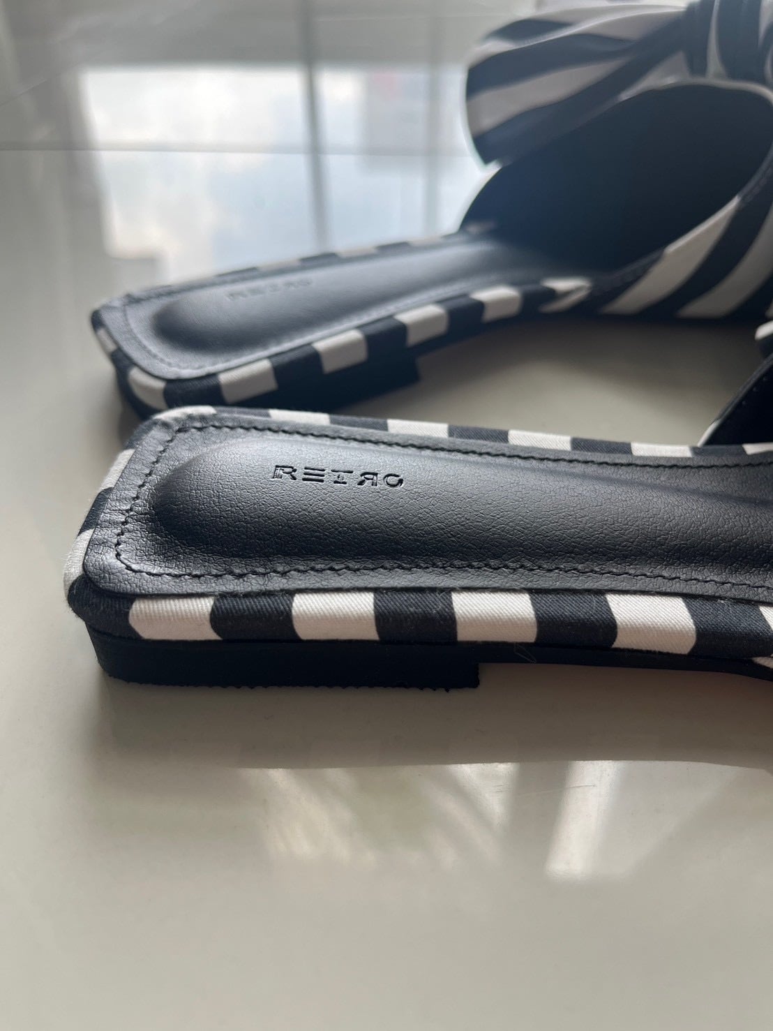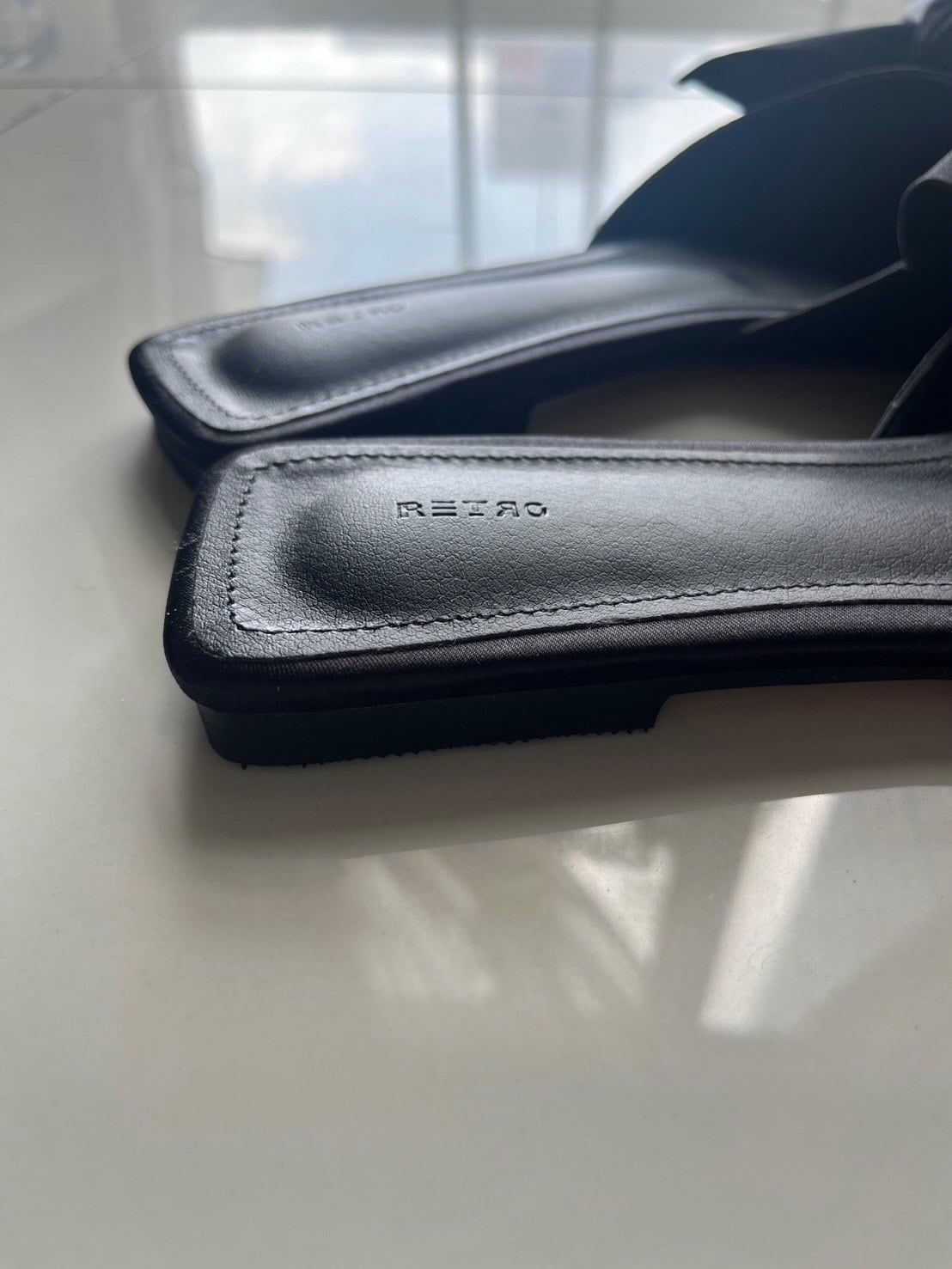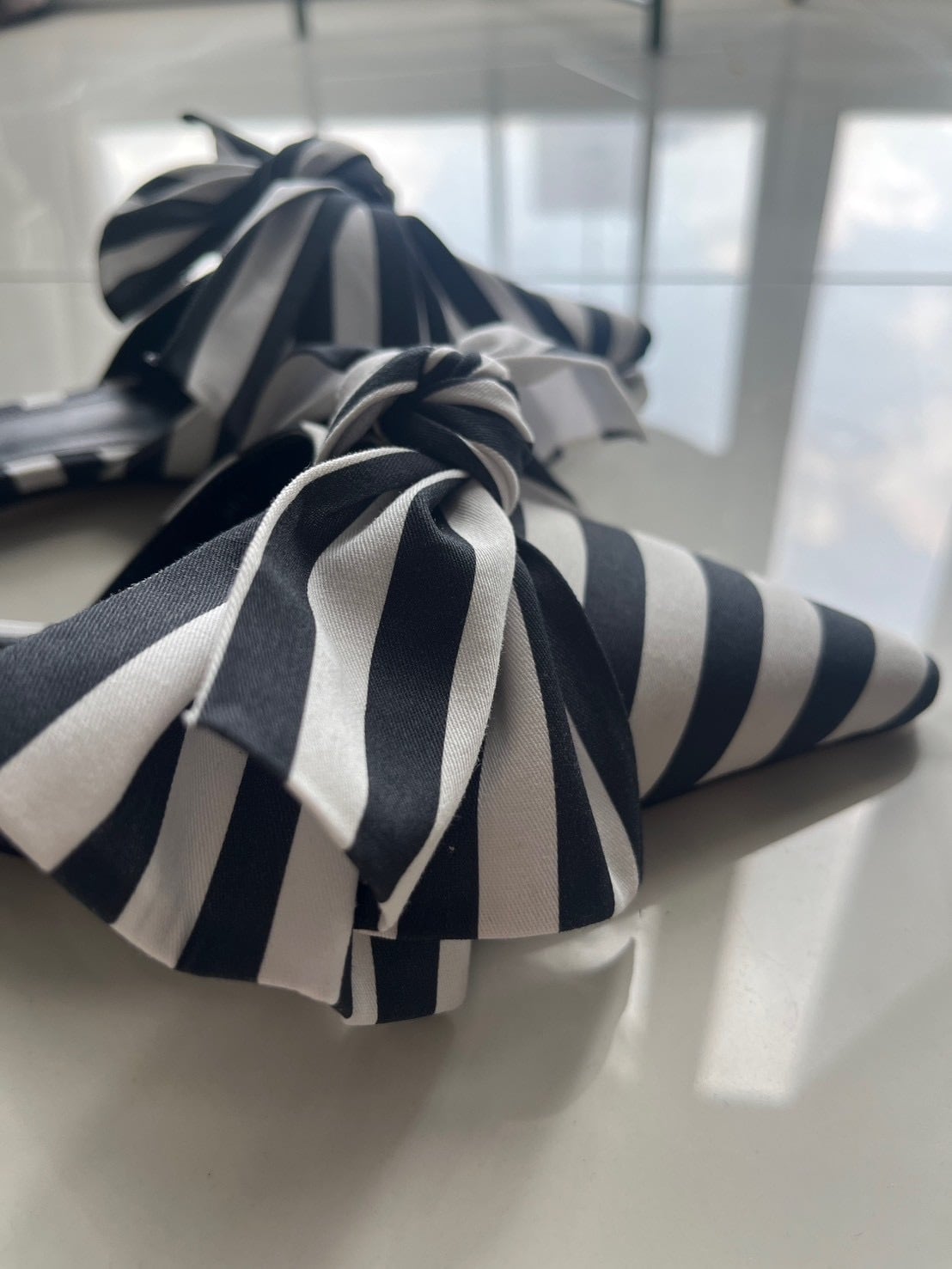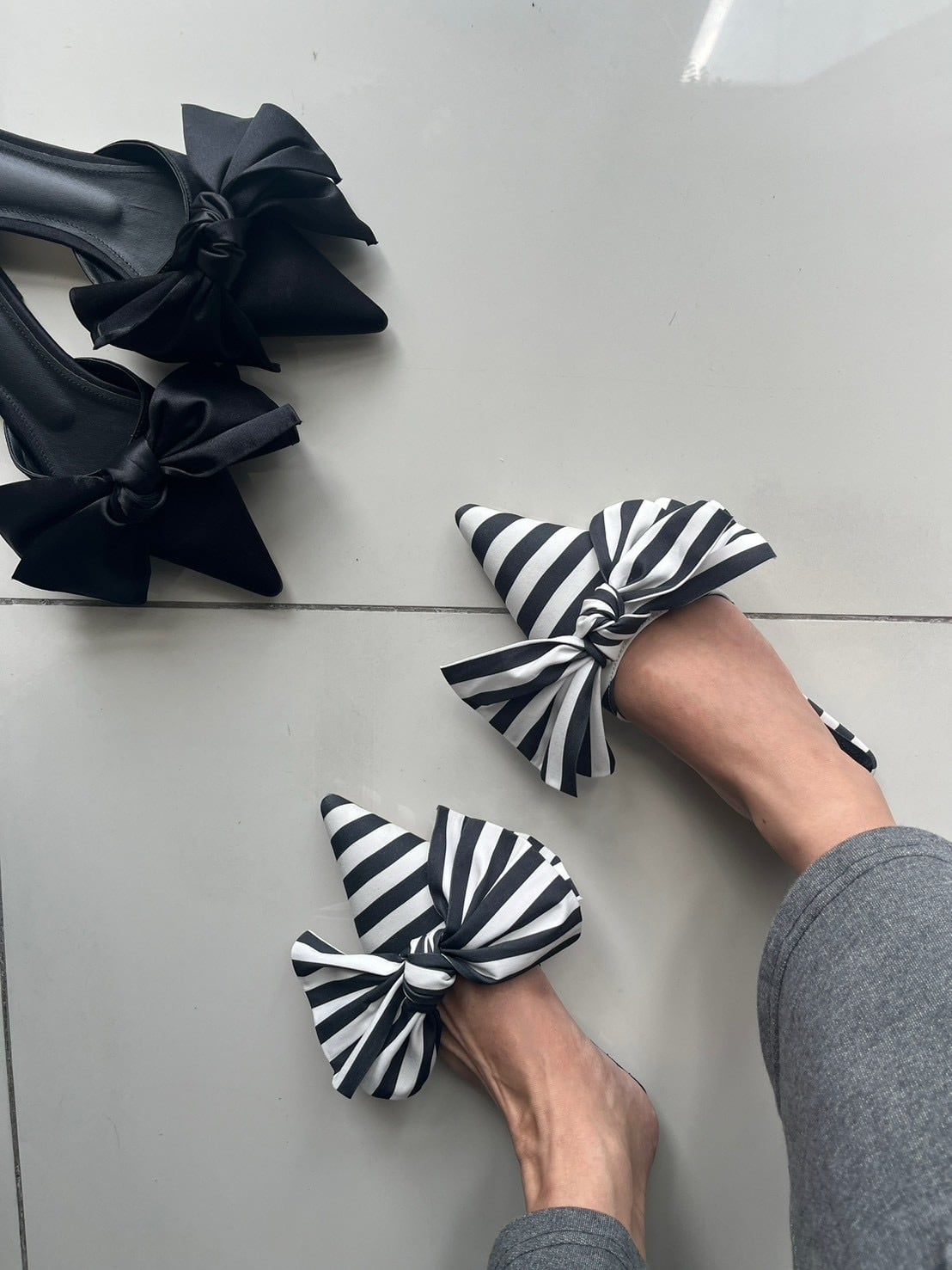 パッと目を引くビッグリボンが印象的な、フラットタイプのミュールスリッパ。