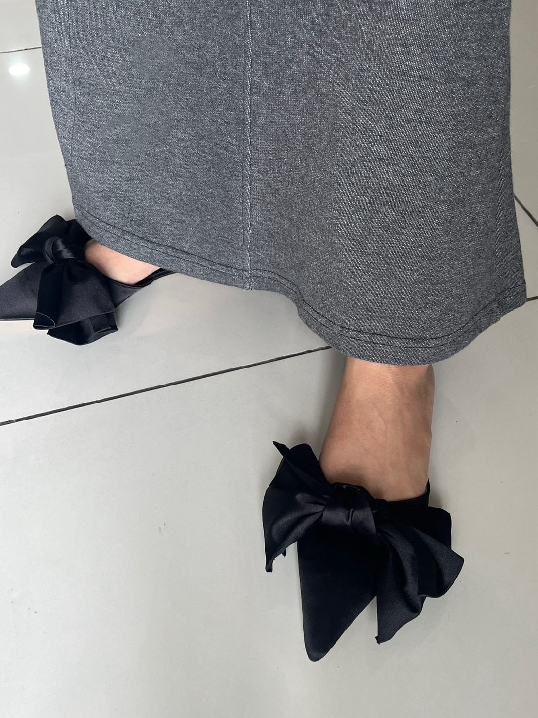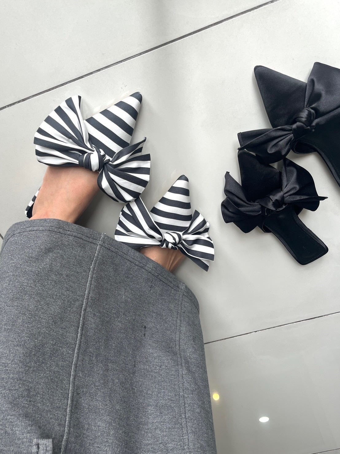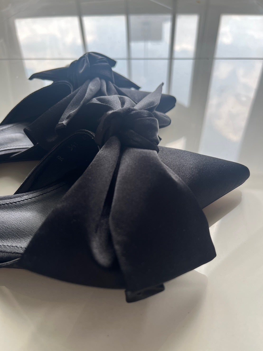 シャープなポインテッドトゥにボリュームのあるリボンを掛け合わせることで、甘さを抑えつつ、足元を華奢にそして華やかに演出します。