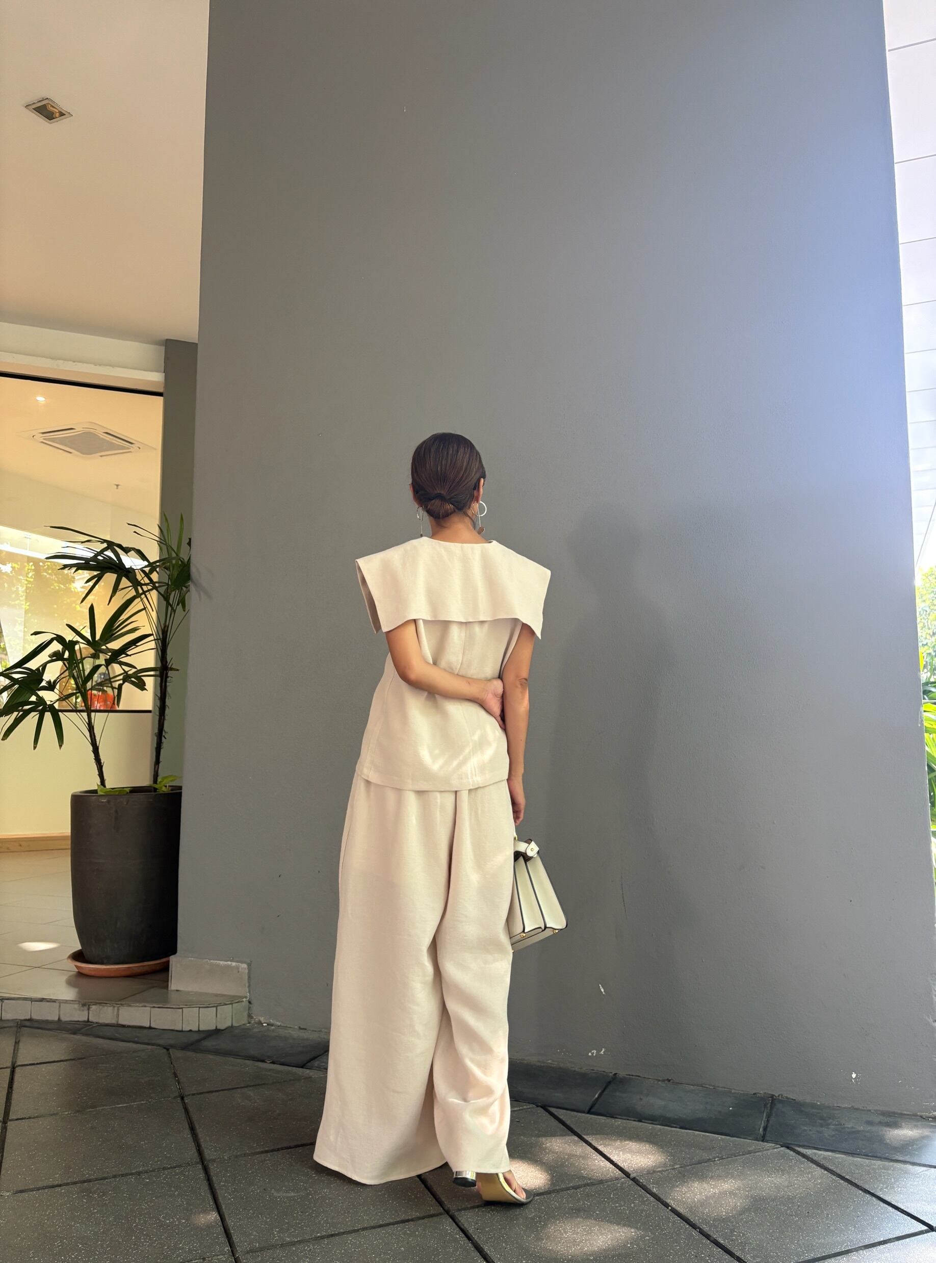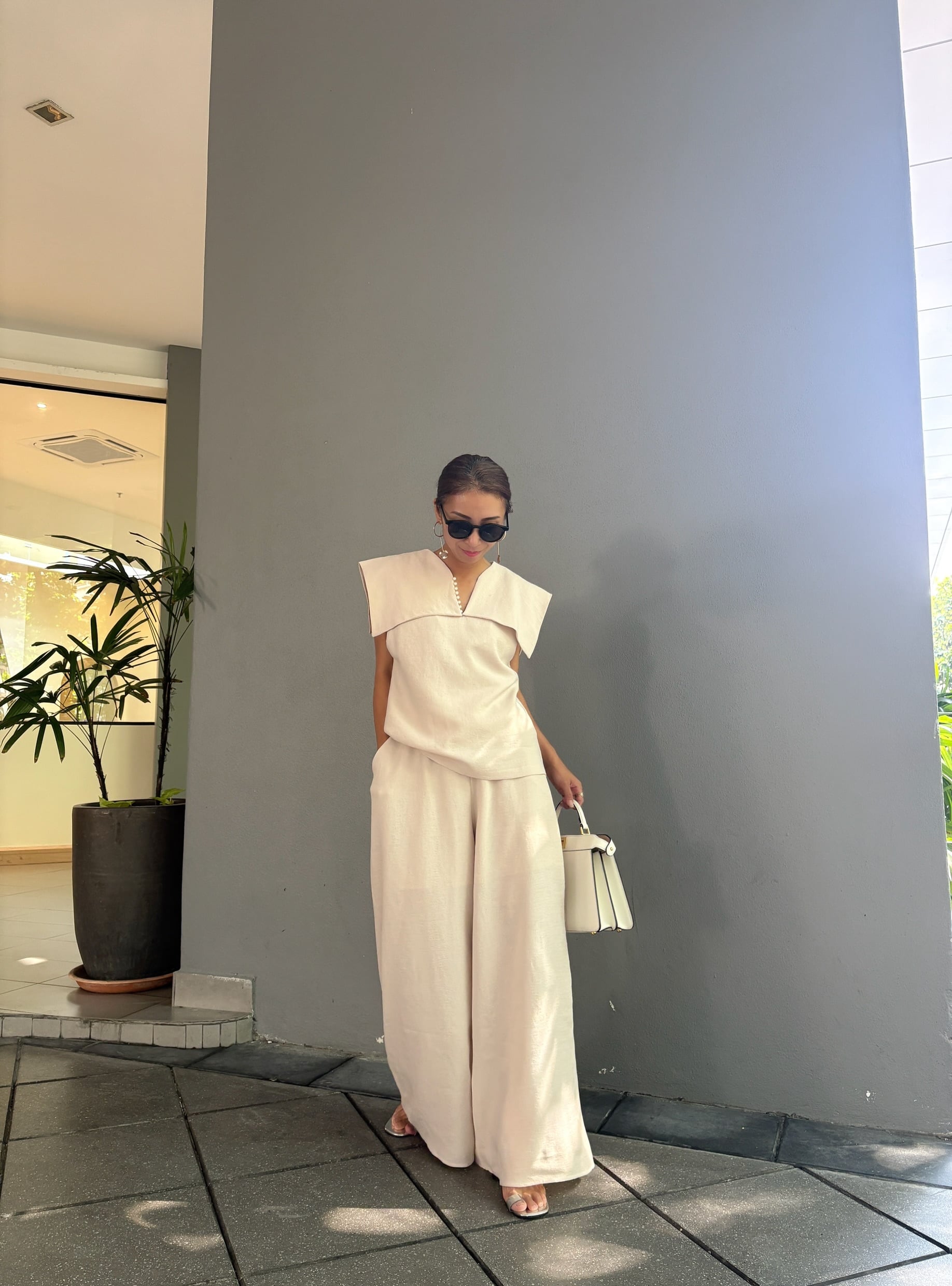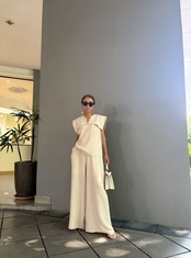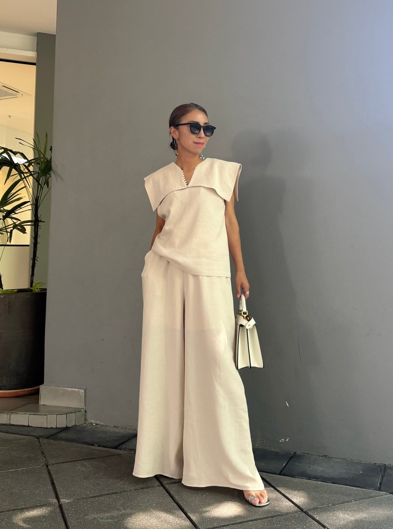全身をワントーンでまとめることで、セットアップならではの統一感と上品な印象を最大限に引き出せます。足元はサンダルやフラットシューズで軽やかに、ヒールを合わせればよりエレガントな装いに。大人の女性にふさわしい、上品でモードなセットアップで、新しい季節のスタイリングをお楽しみください。