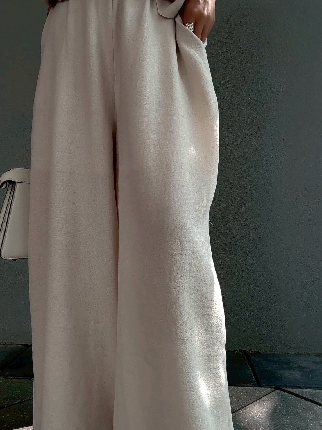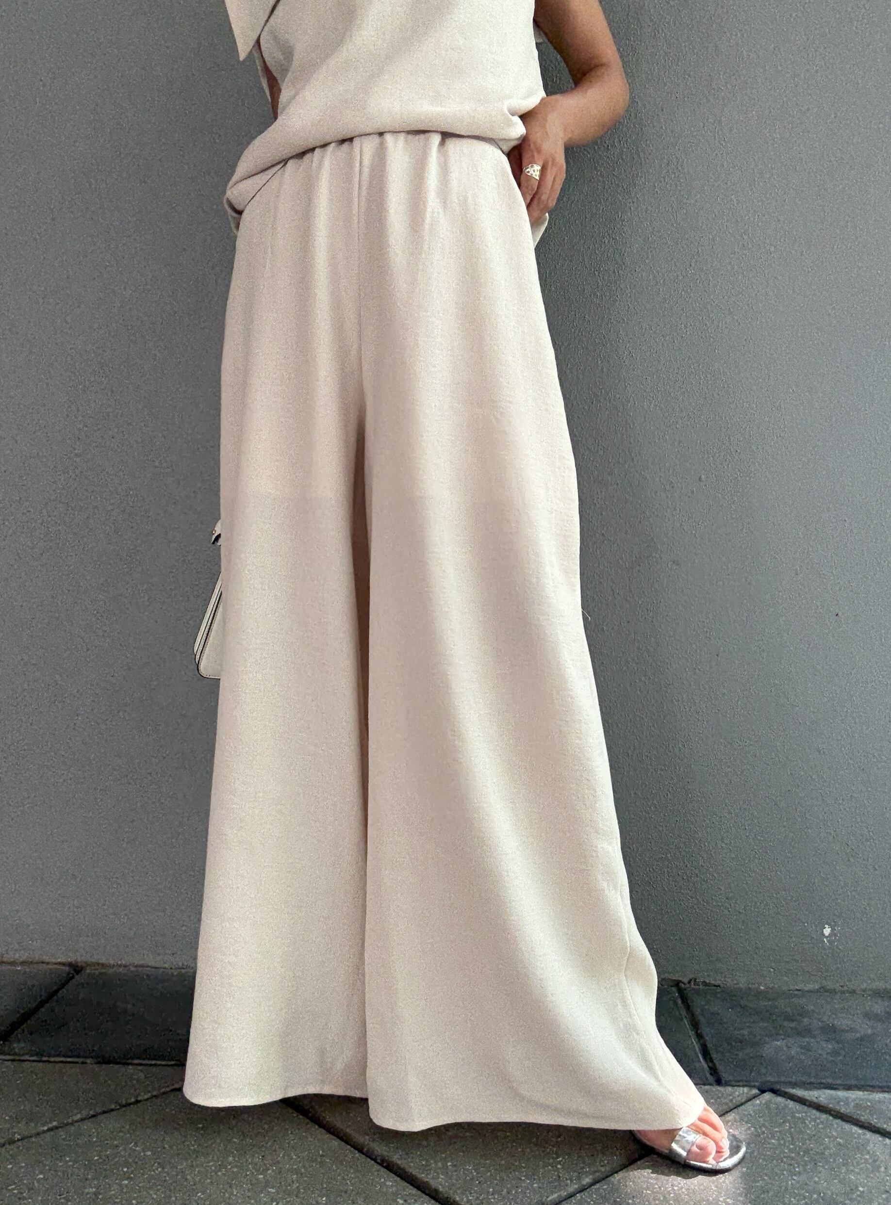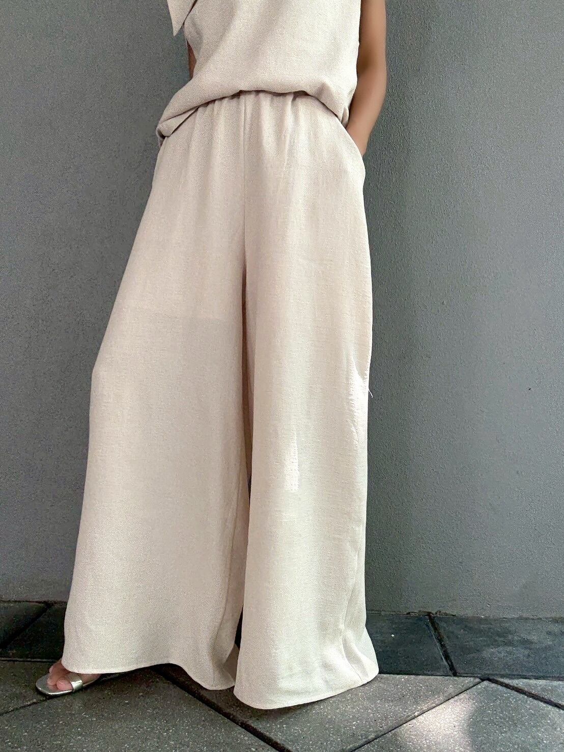 トップスと共布で仕立てられたワイドパンツは、落ち感があり、脚のラインを拾わないリラックスシルエット。ウエストはゴム仕様で、ストレスフリーな穿き心地です。両サイドにはポケットも付いており、機能性も兼ね備えています。上品な広がりが、歩くたびに優雅なドレープを生み出し、スタイルアップ効果があります。