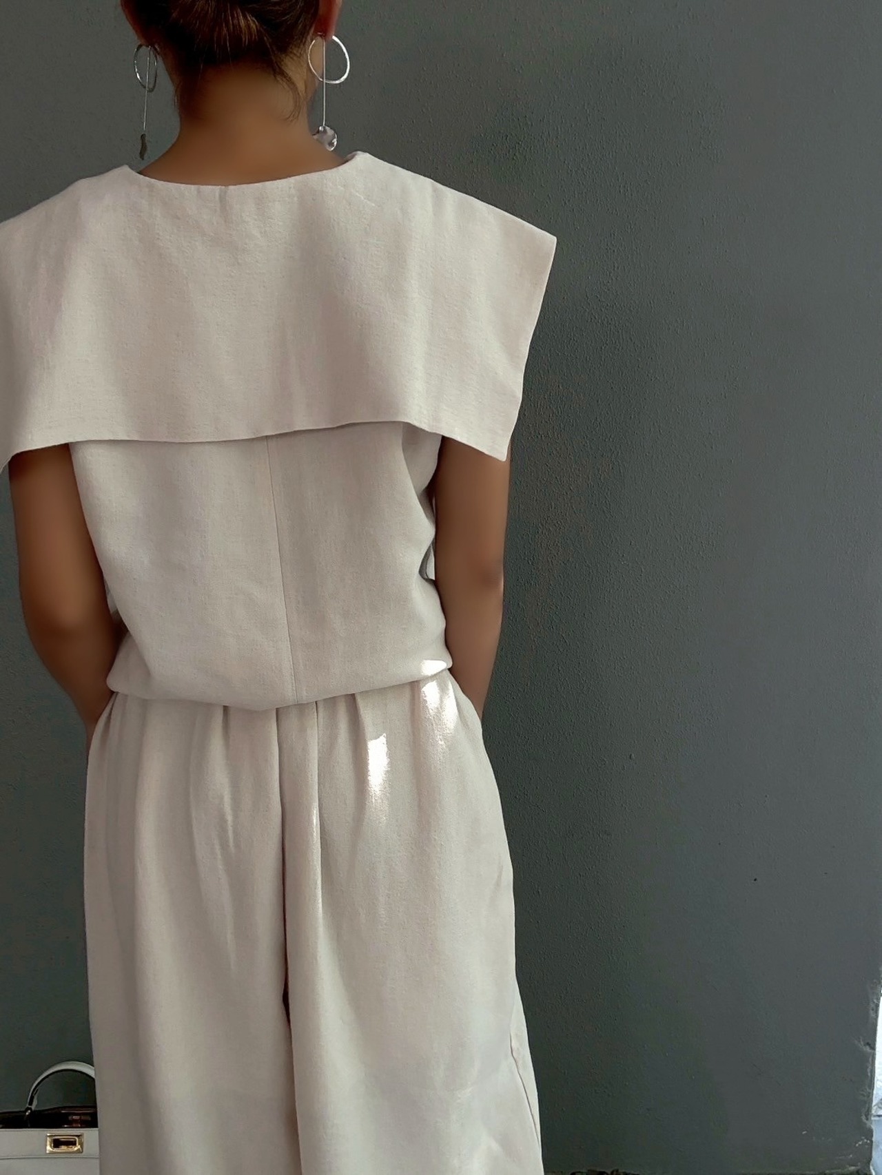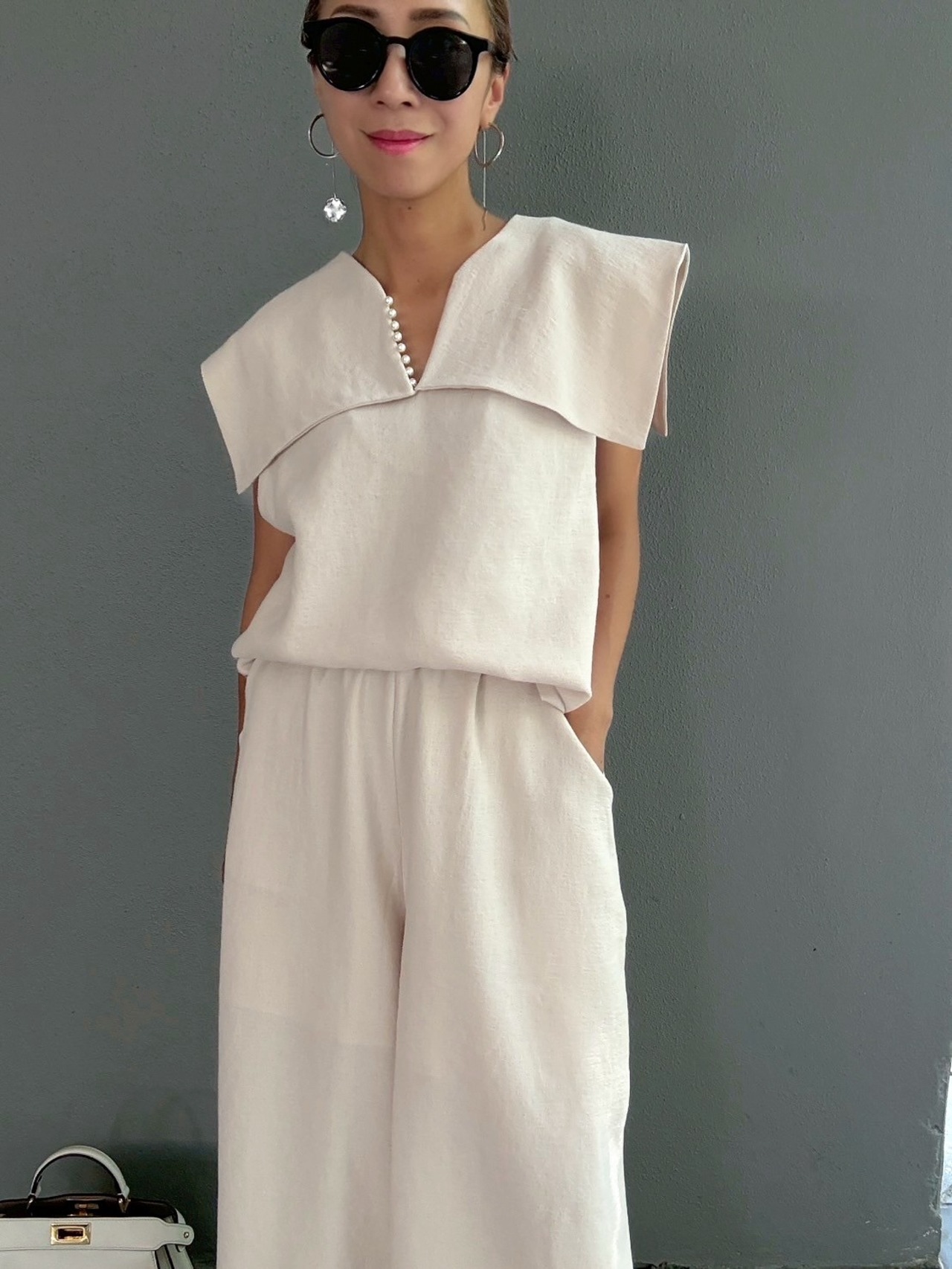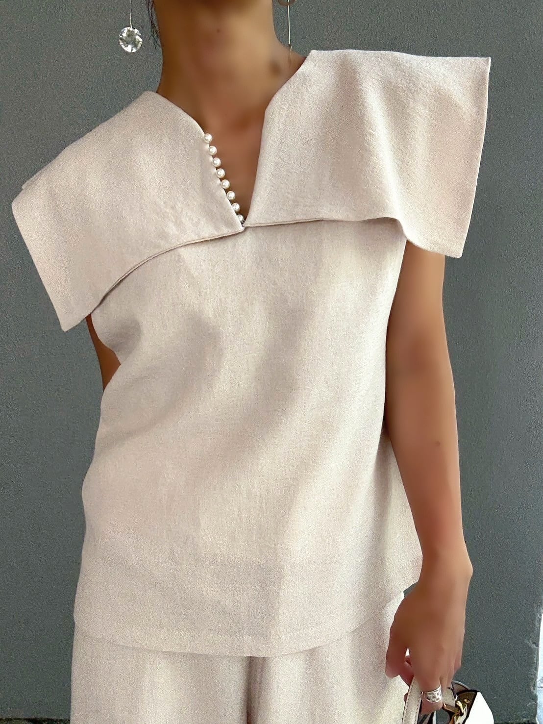 特徴的なセーラーカラーデザインのトップスは顔周りをすっきりと見せつつ、肩を覆うような幅広の襟が、モダンな雰囲気を醸し出します。首元のVネックラインには、細やかなパールがあしらわれ、デコルテに上品な輝きをプラス。後ろ姿も抜かりなく、洗練された印象を与えます。