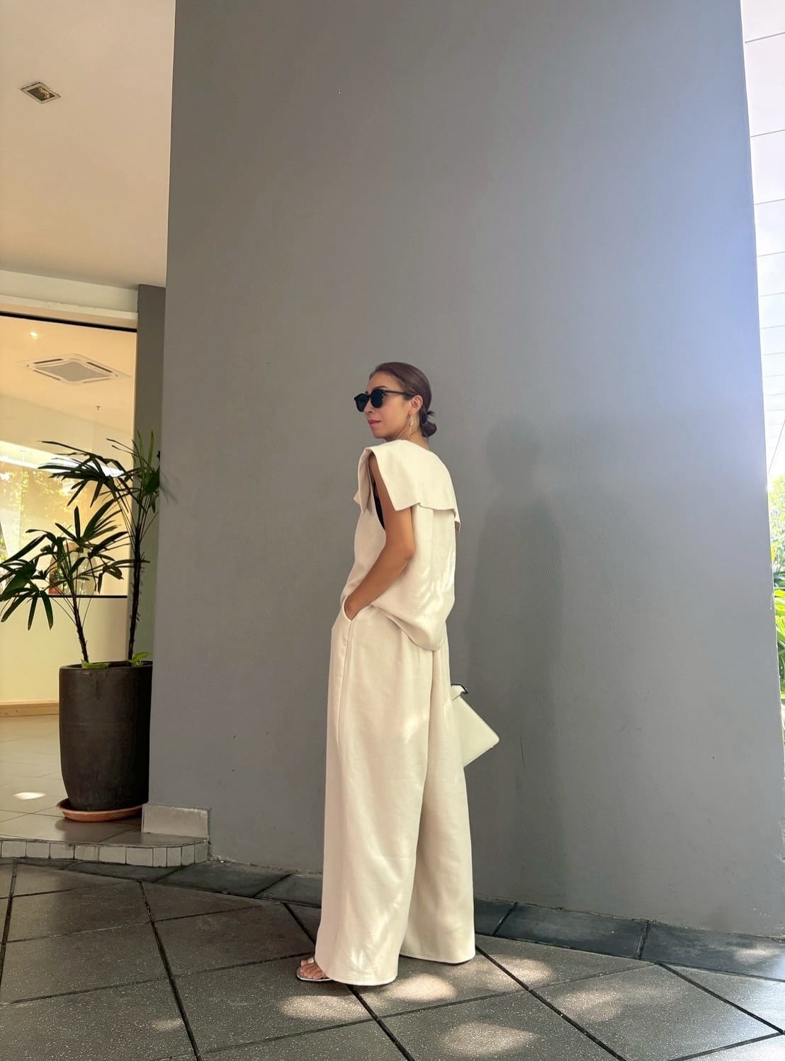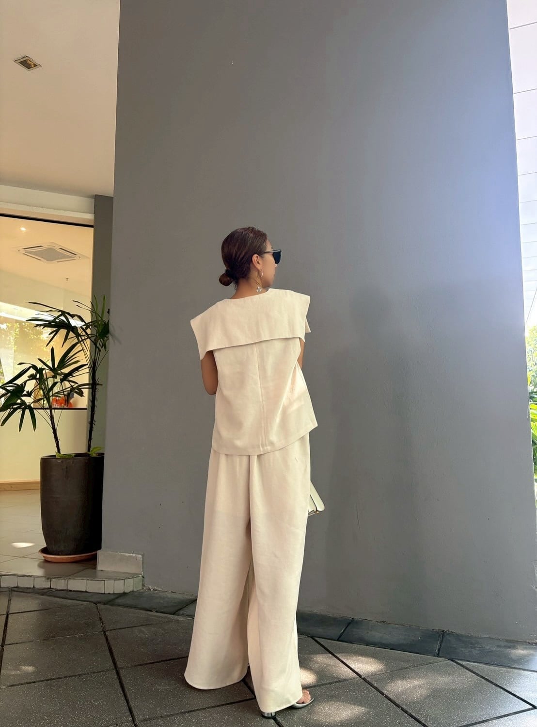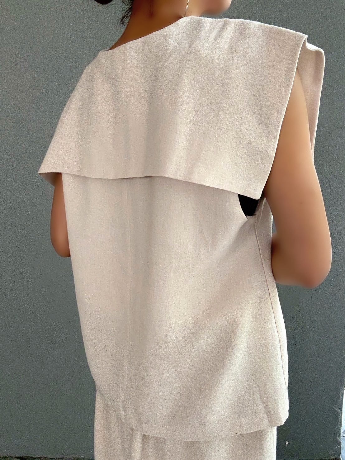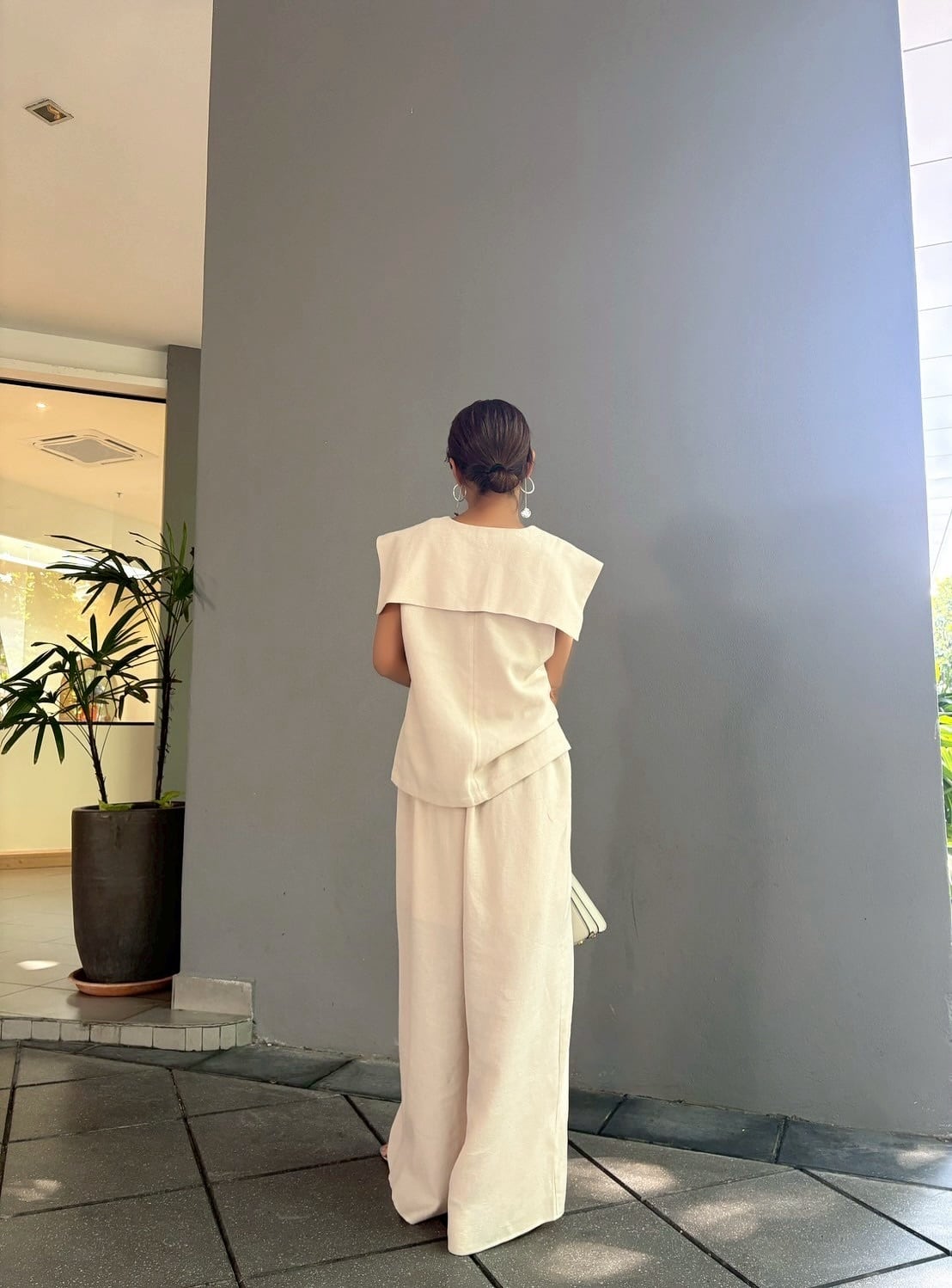 特徴的なセーラーカラーデザインのトップスは顔周りをすっきりと見せつつ、肩を覆うような幅広の襟が、モダンな雰囲気を醸し出します。首元のVネックラインには、細やかなパールがあしらわれ、デコルテに上品な輝きをプラス。後ろ姿も抜かりなく、洗練された印象を与えます。