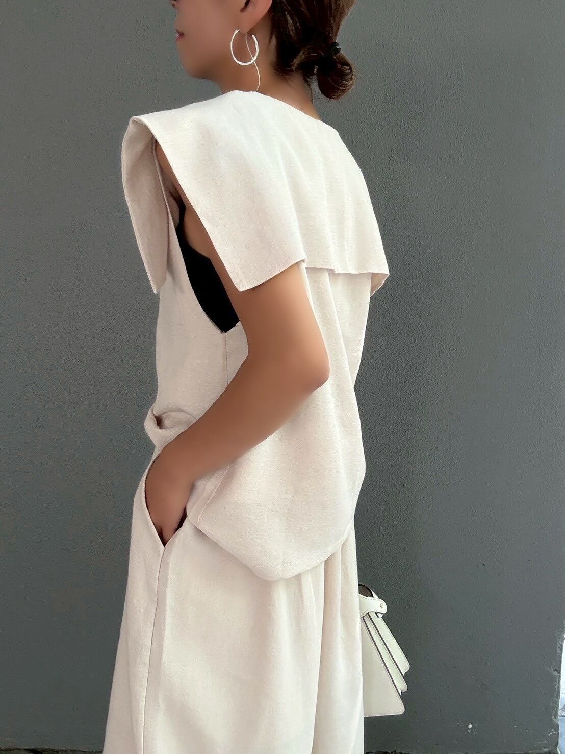 クラシカルな「セーラーカラー」を大胆にアレンジしたデザインが、シンプルながらも個性的なスタイルを演出します。