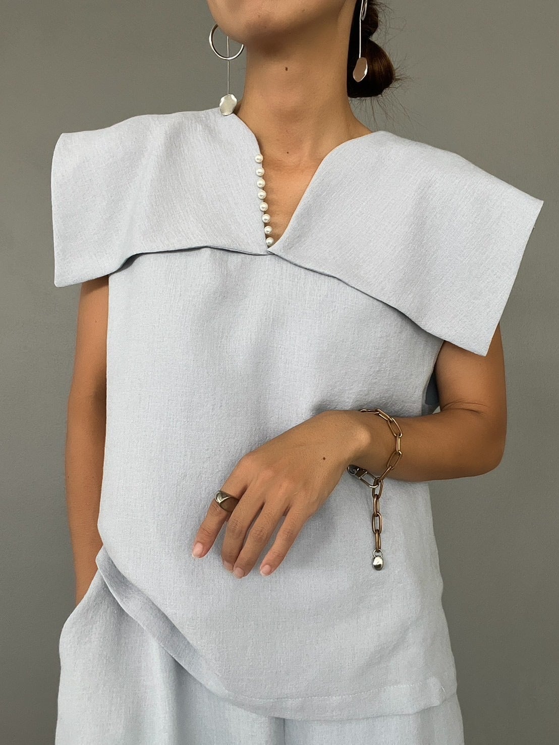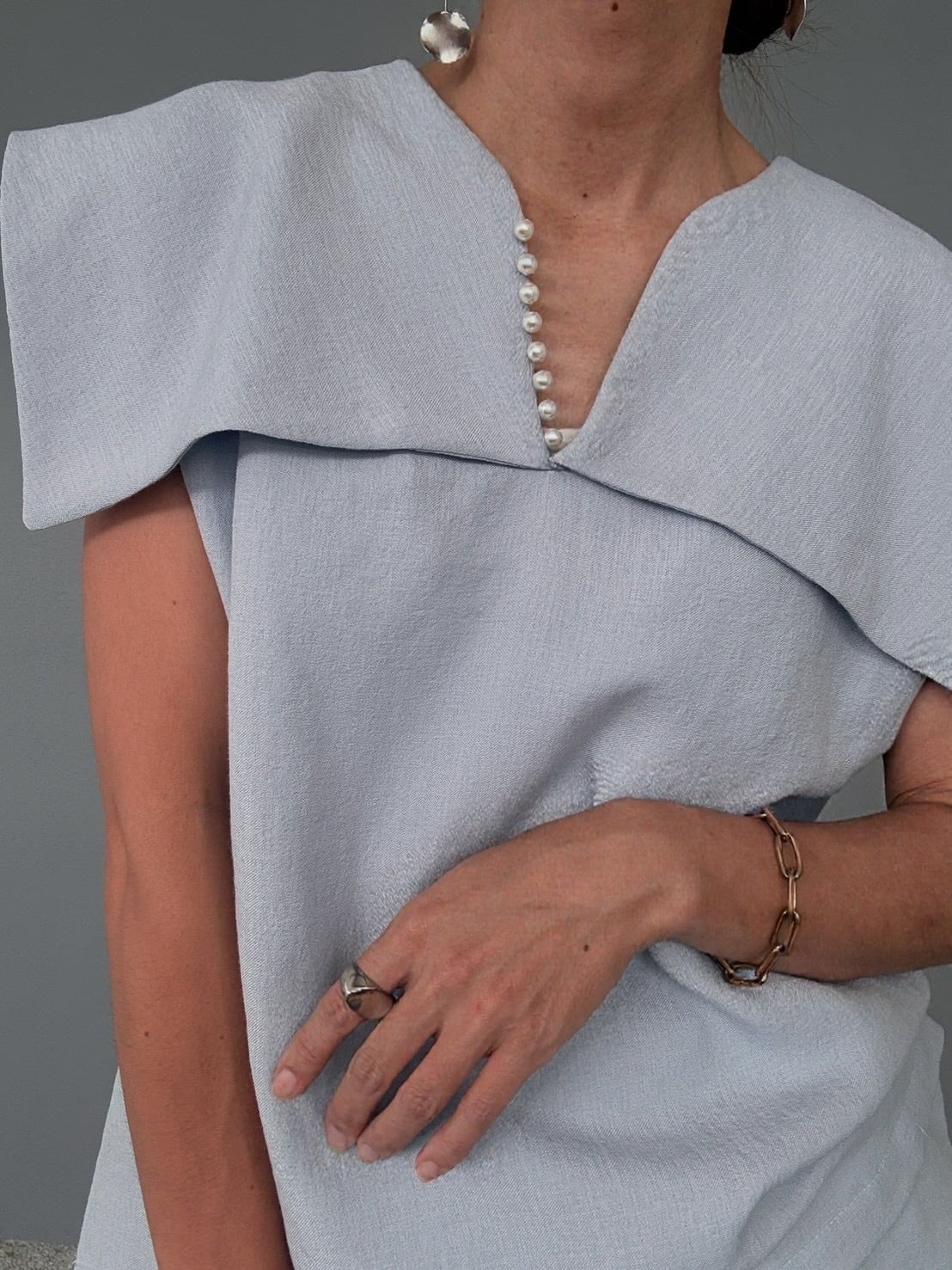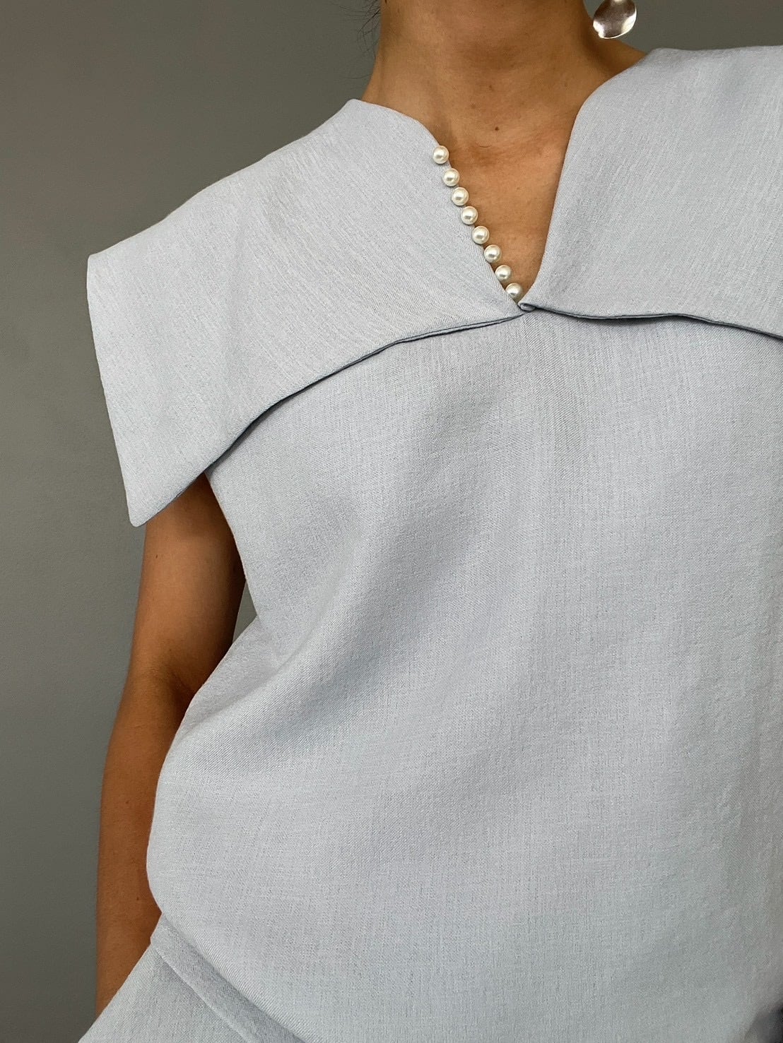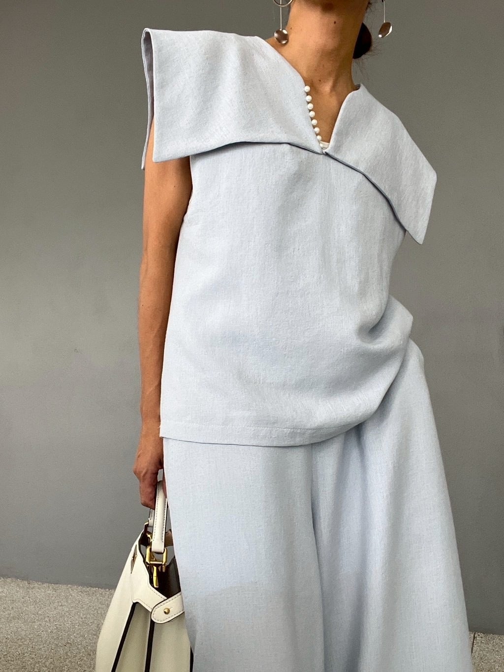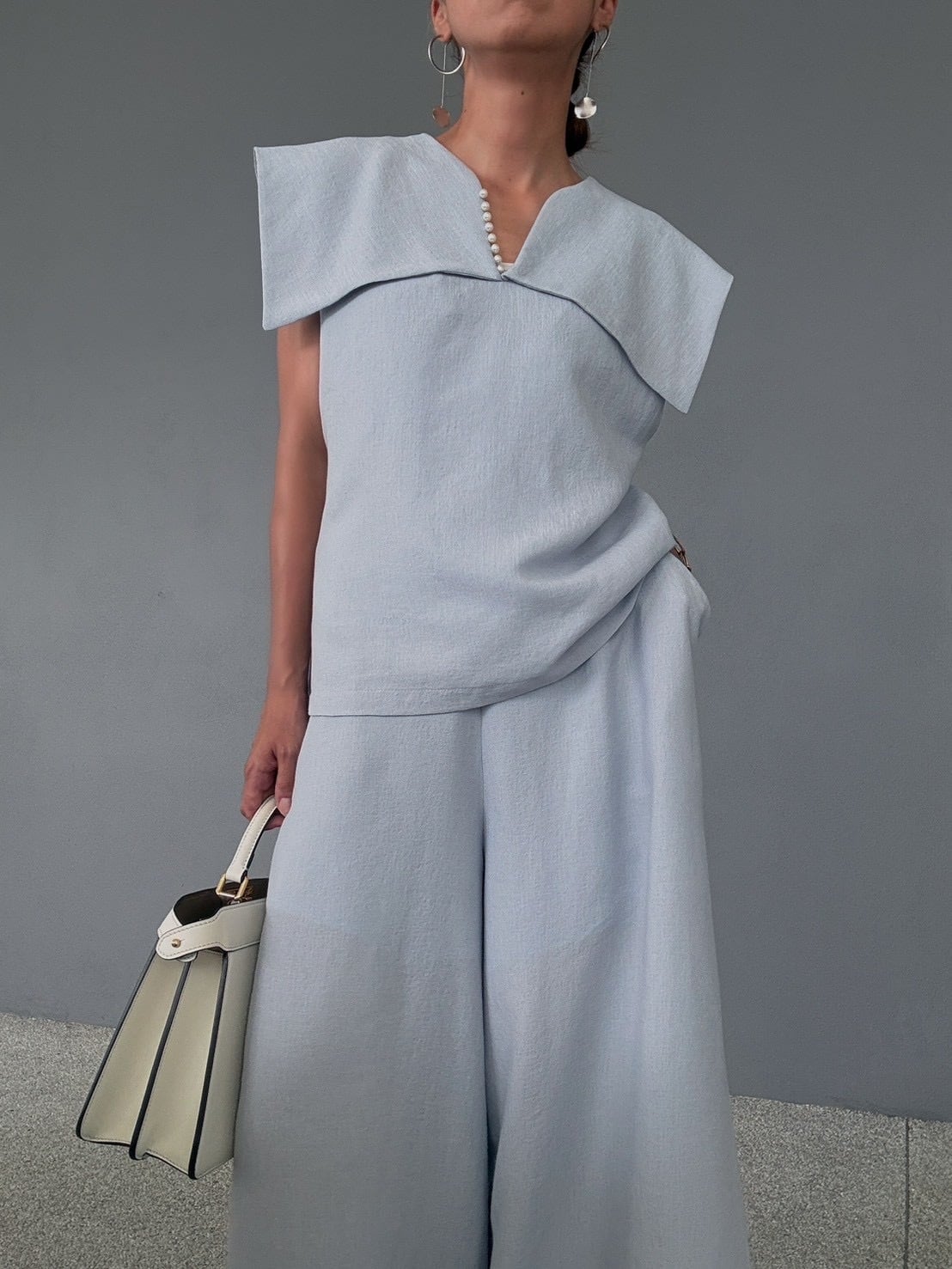 特徴的なセーラーカラーデザインのトップスは顔周りをすっきりと見せつつ、肩を覆うような幅広の襟が、モダンな雰囲気を醸し出します。首元のVネックラインには、細やかなパールがあしらわれ、デコルテに上品な輝きをプラス。後ろ姿も抜かりなく、洗練された印象を与えます。