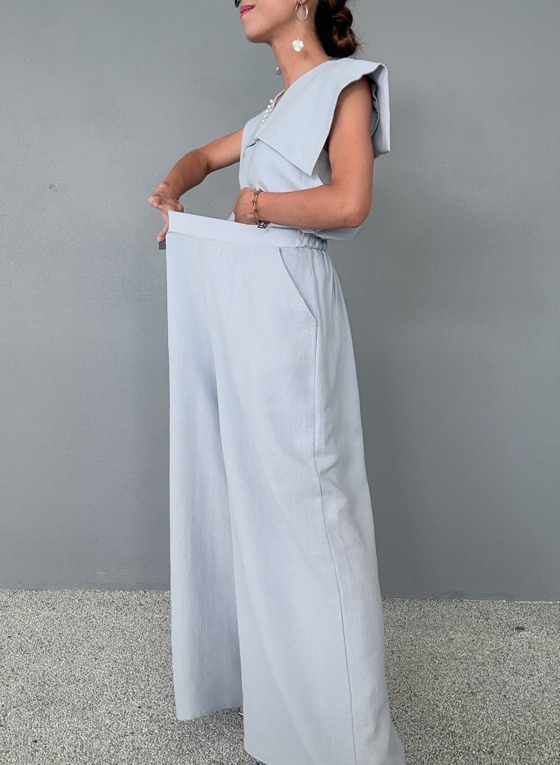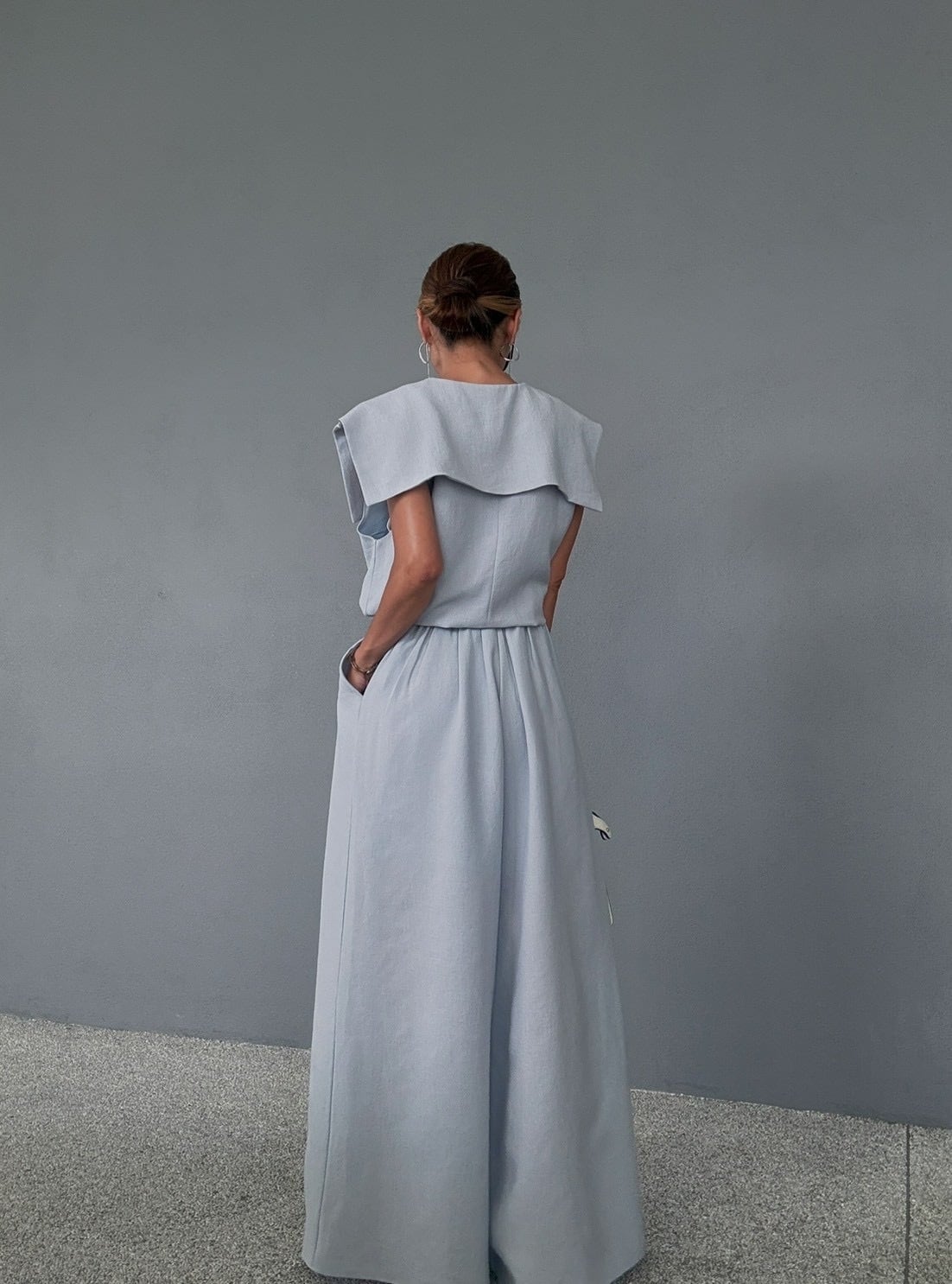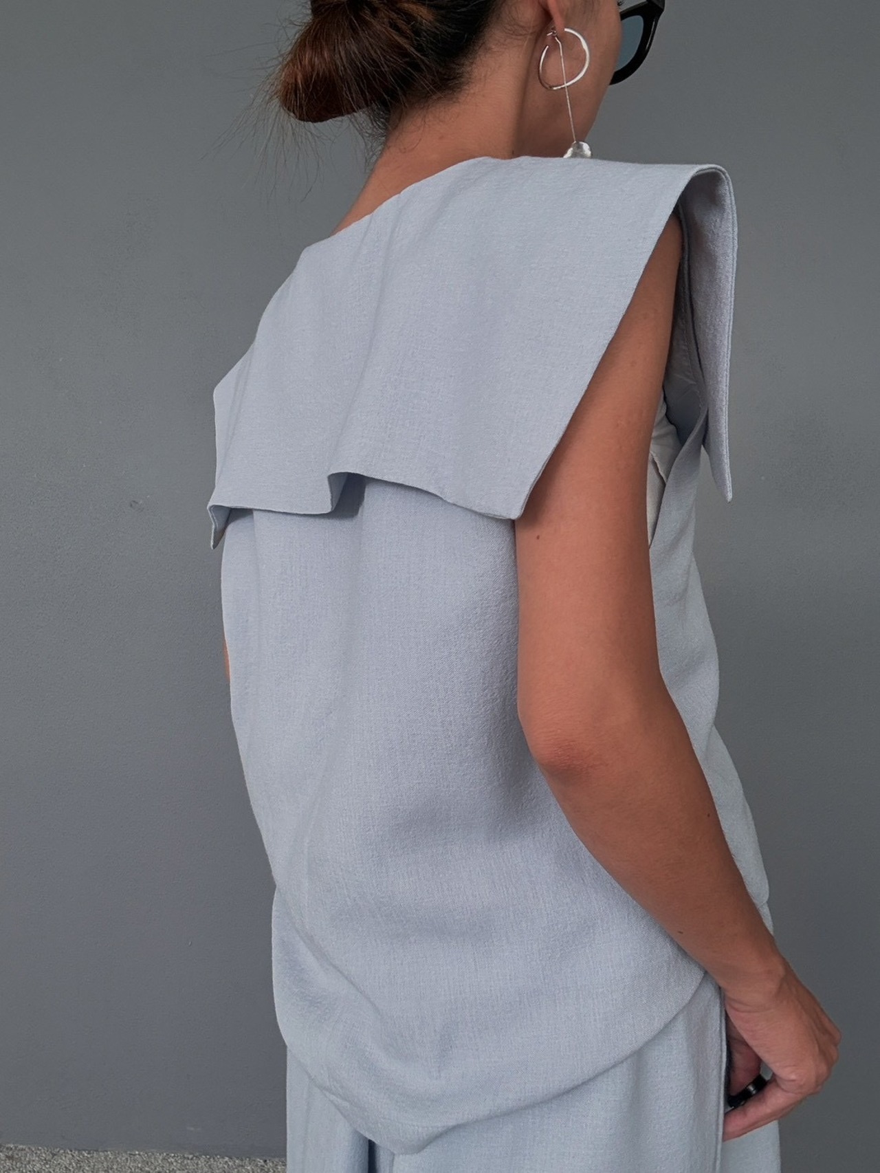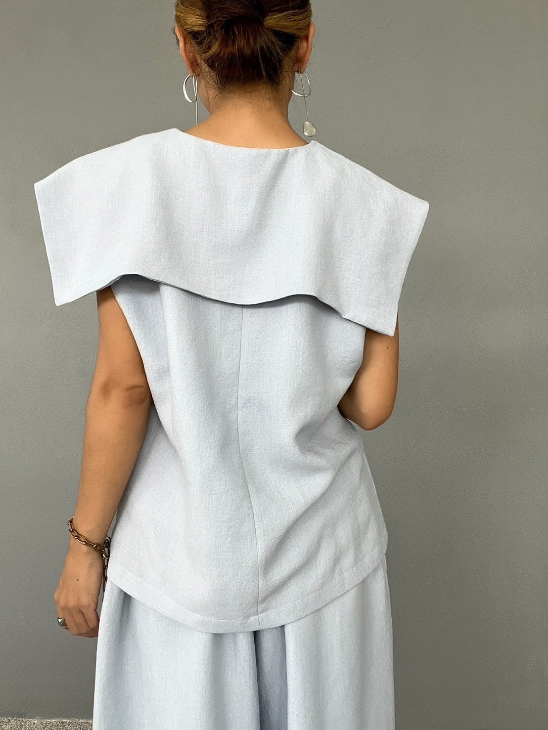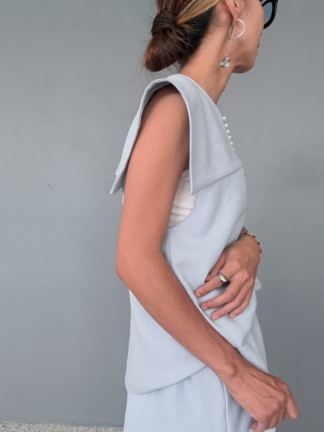 特徴的なセーラーカラーデザインのトップスは顔周りをすっきりと見せつつ、肩を覆うような幅広の襟が、モダンな雰囲気を醸し出します。首元のVネックラインには、細やかなパールがあしらわれ、デコルテに上品な輝きをプラス。後ろ姿も抜かりなく、洗練された印象を与えます。