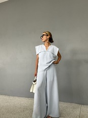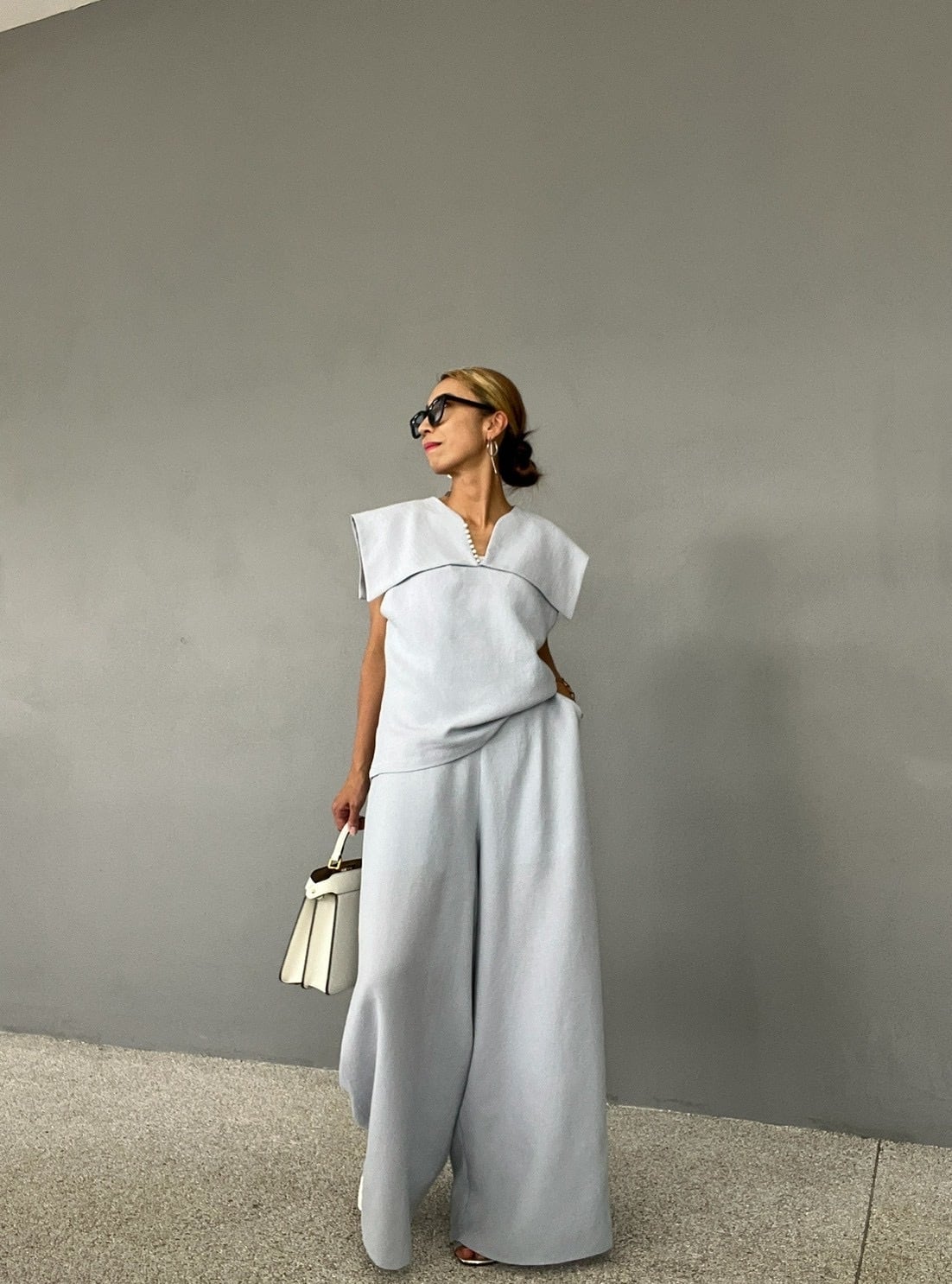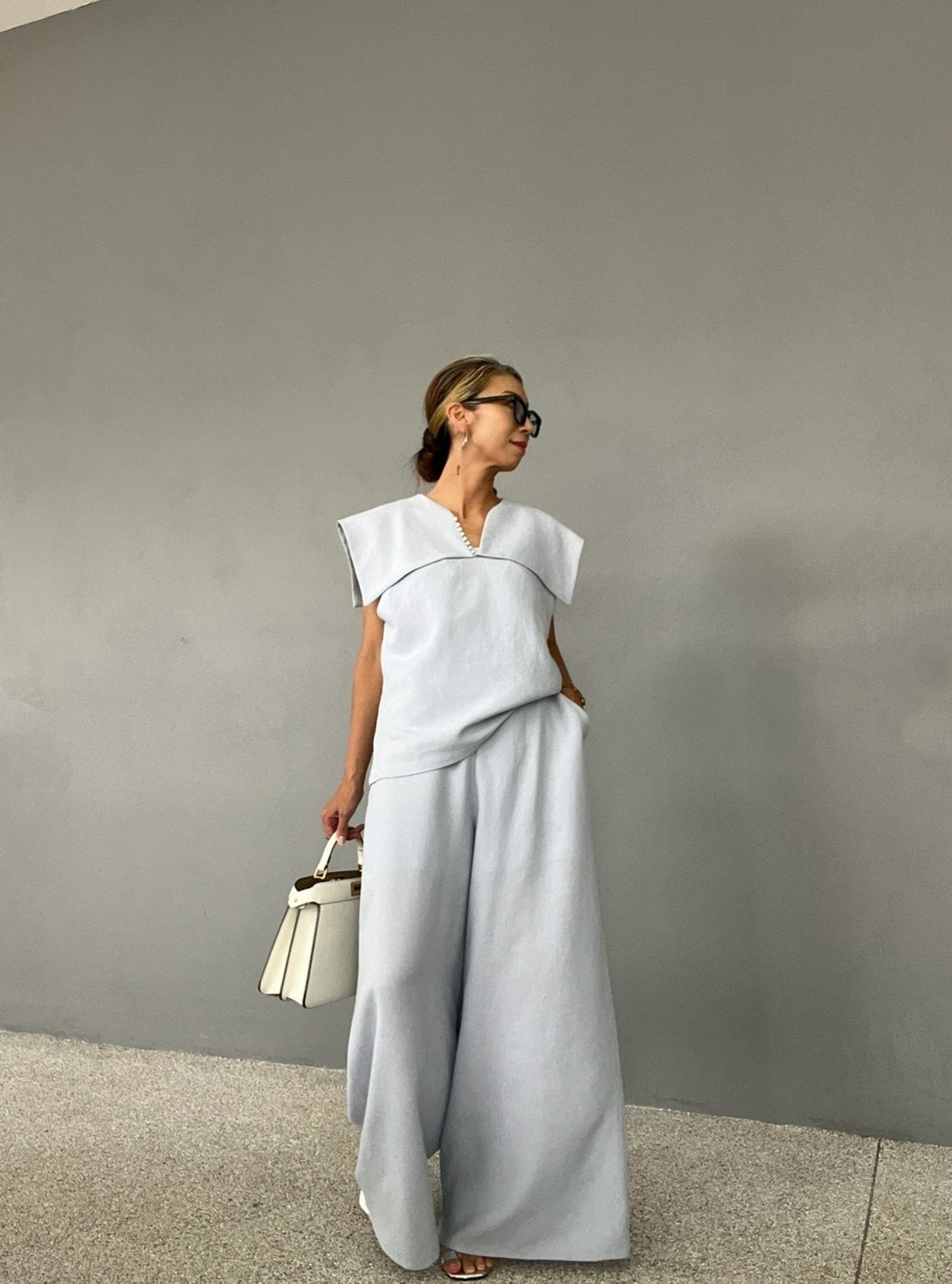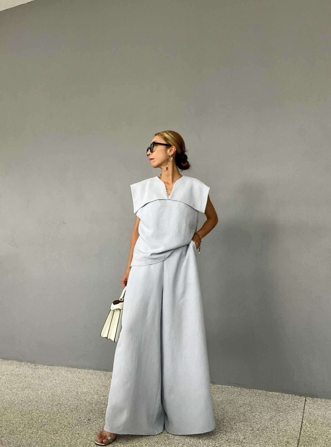 全身をワントーンでまとめることで、セットアップならではの統一感と上品な印象を最大限に引き出せます。足元はサンダルやフラットシューズで軽やかに、ヒールを合わせればよりエレガントな装いに。大人の女性にふさわしい、上品でモードなセットアップで、新しい季節のスタイリングをお楽しみください。