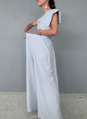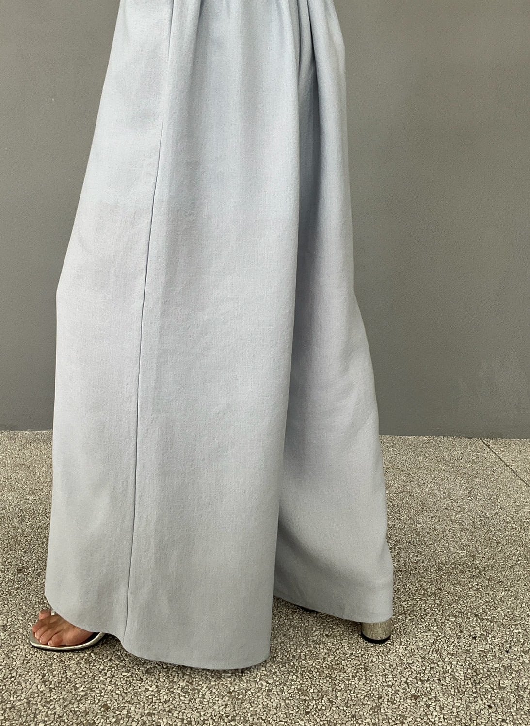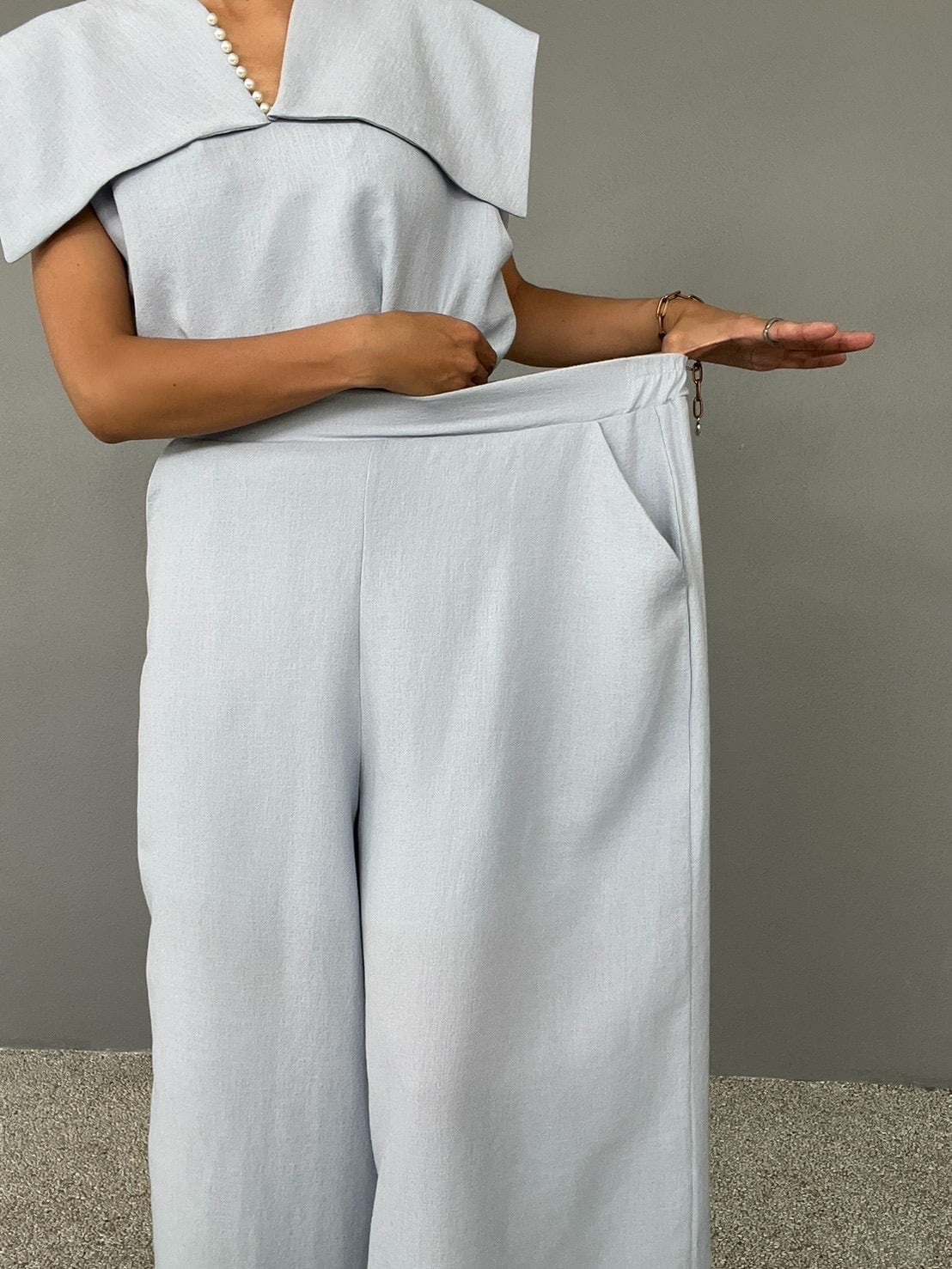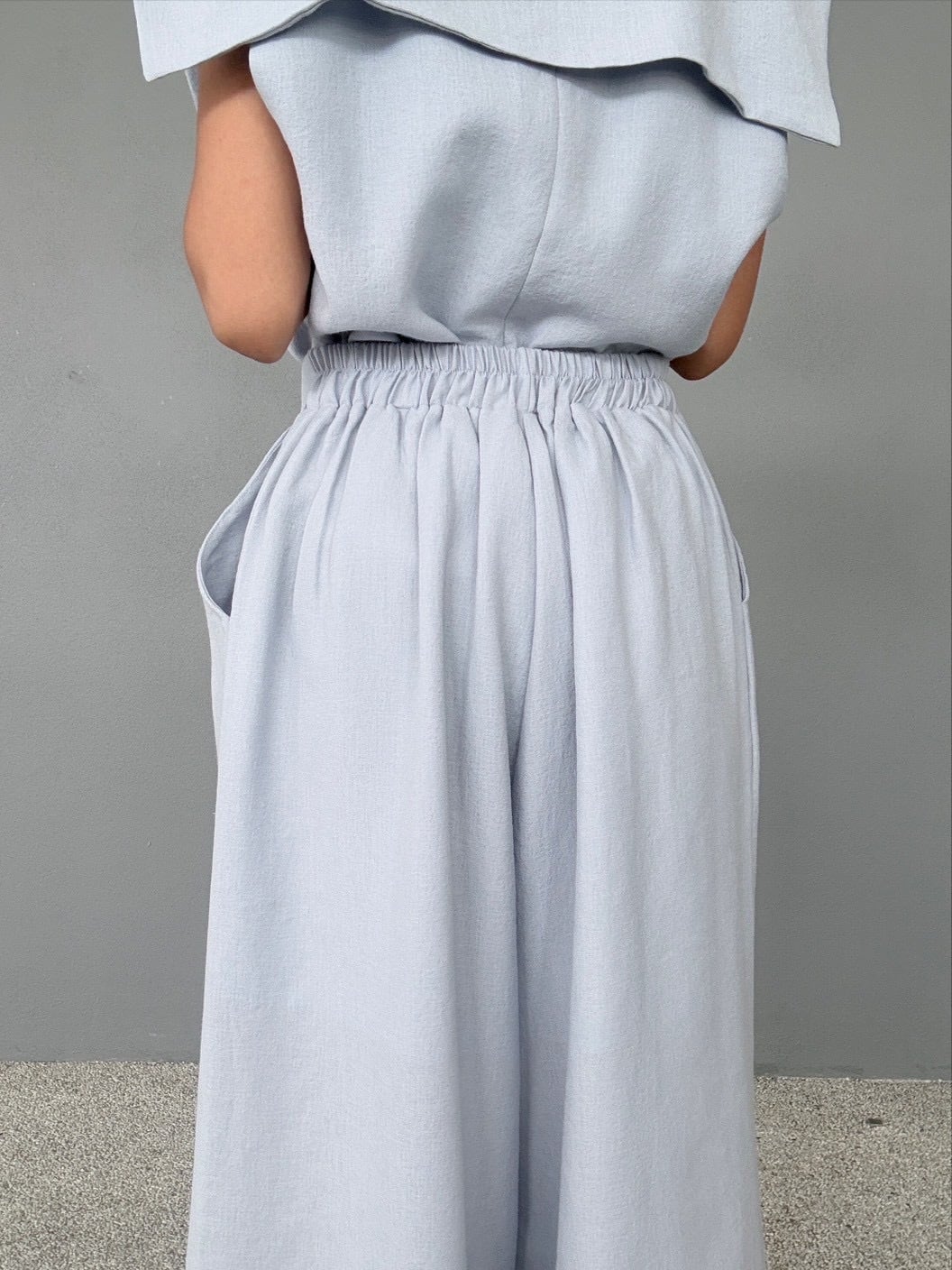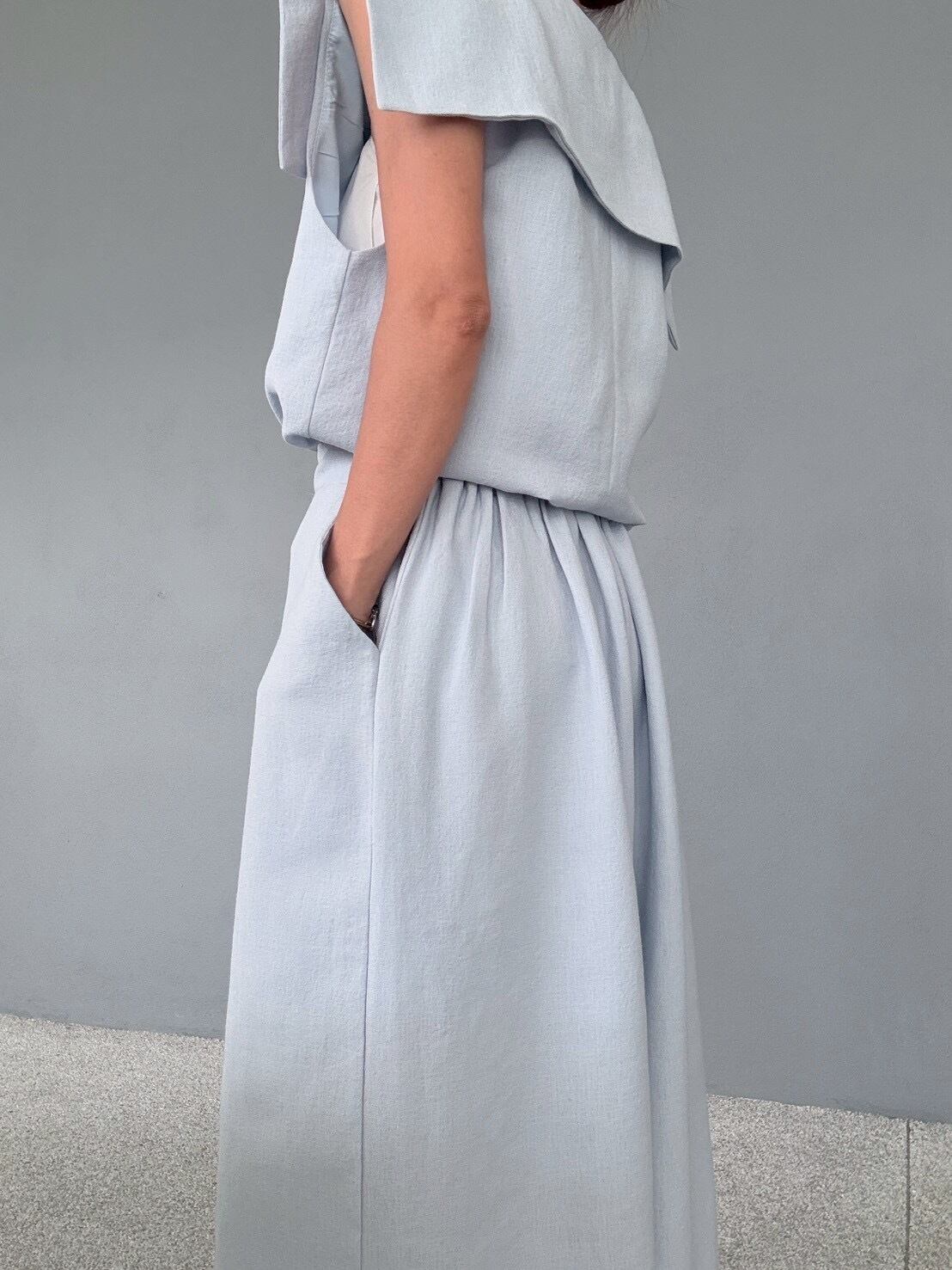 トップスと共布で仕立てられたワイドパンツは、落ち感があり、脚のラインを拾わないリラックスシルエット。ウエストはゴム仕様で、ストレスフリーな穿き心地です。両サイドにはポケットも付いており、機能性も兼ね備えています。上品な広がりが、歩くたびに優雅なドレープを生み出し、スタイルアップ効果があります。