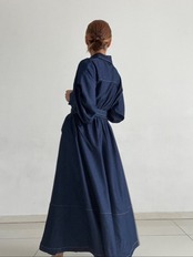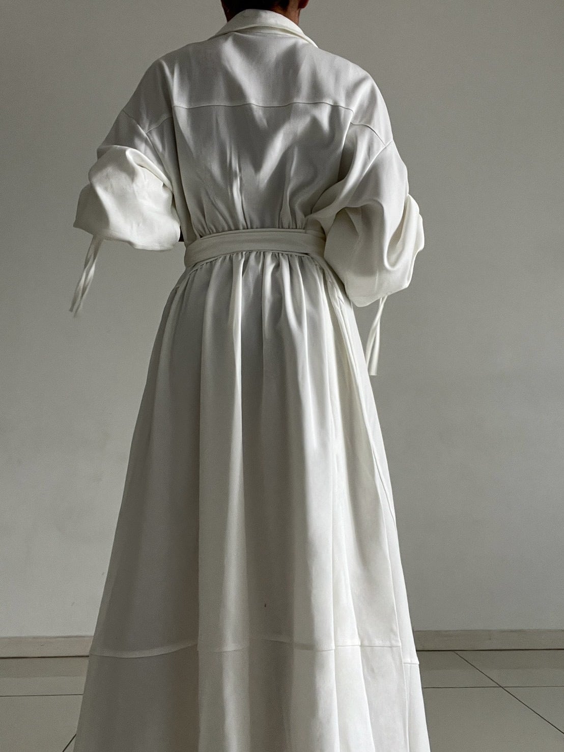 縫い付け仕様のウエストベルトが自然にウエストマークし、着崩れにくく、バランスの取れたシルエットに。