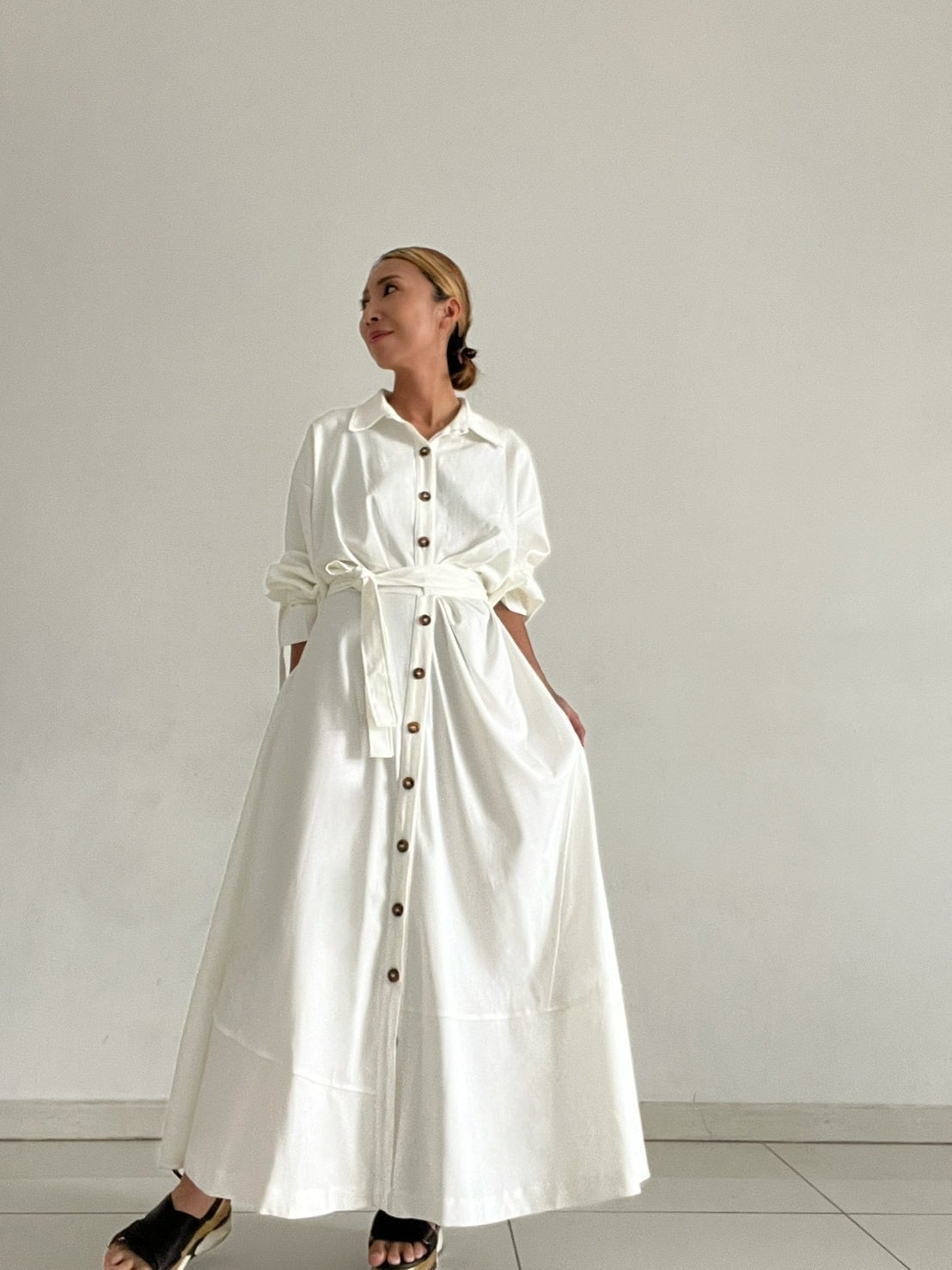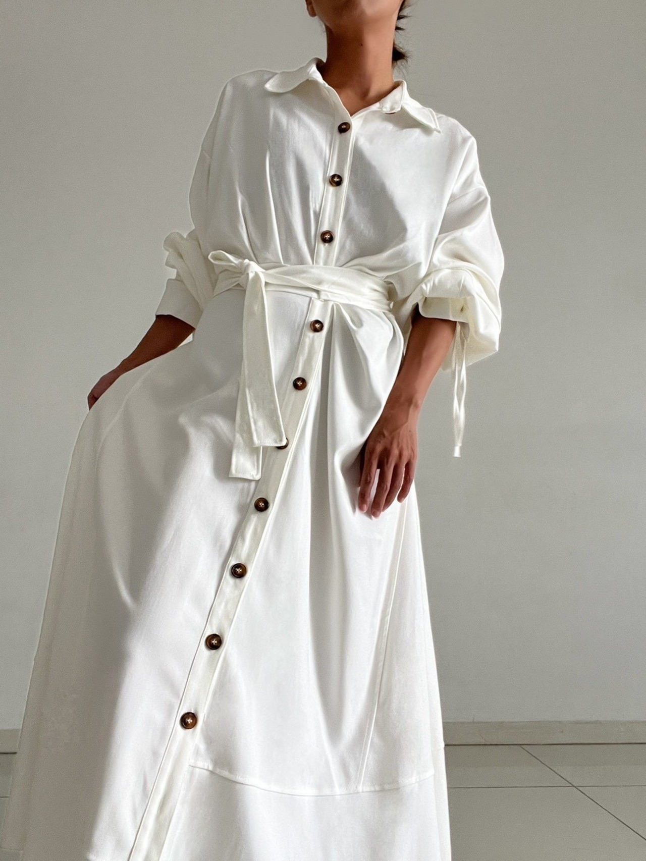 左サイドのギャザーから生まれる立体感を軸に、斜めに流れるボタンラインや裾のステッチで、動きのある表情に。