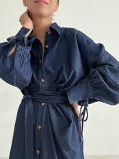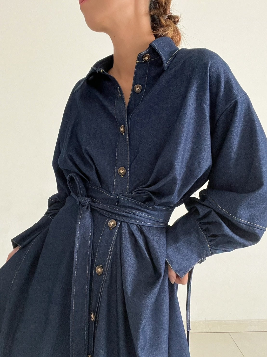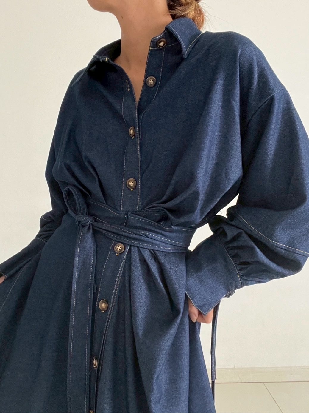 しっとりと柔らかなダンガリー素材の、アシンメトリーなデザインが魅力のデニムワンピース。